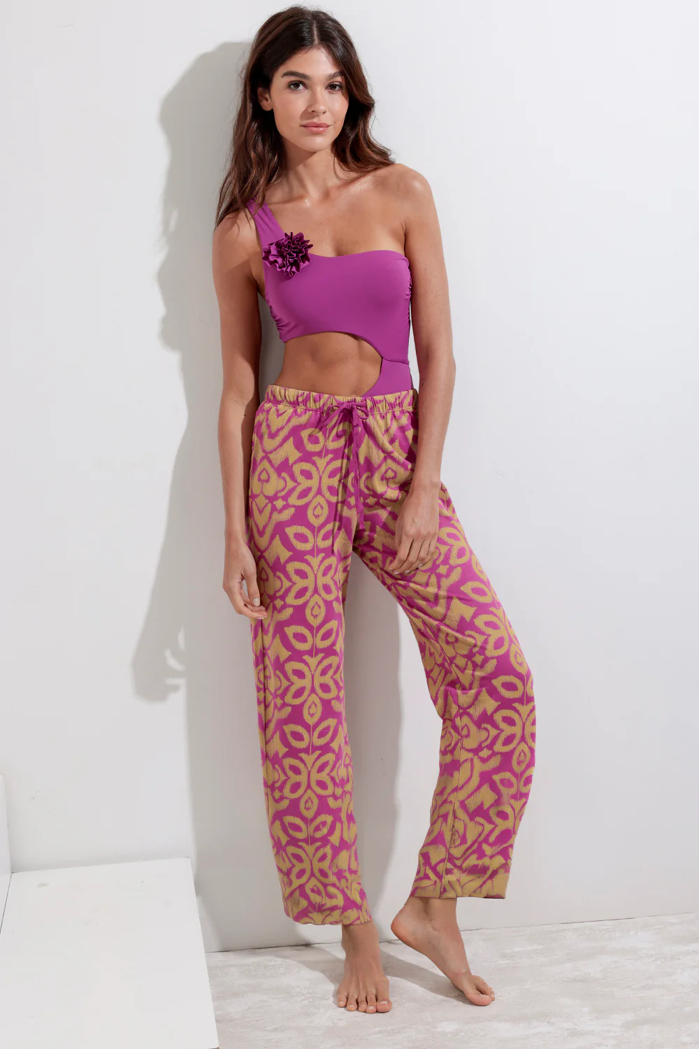 Pantaloni a palazzo con un elegante motivo floreale, perfetti per un look fresco e raffinato. Ideali per occasioni estive o casual chic, grazie alla loro vestibilitร ampia e comoda. Un capo versatile che aggiunge un tocco di stile e colore al tuo guardaroba.