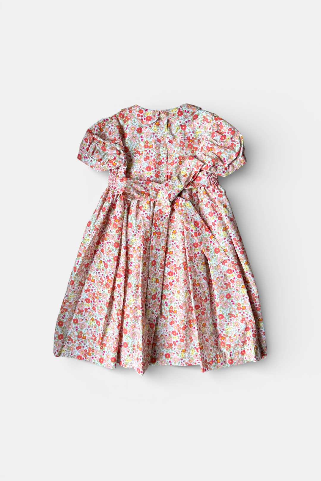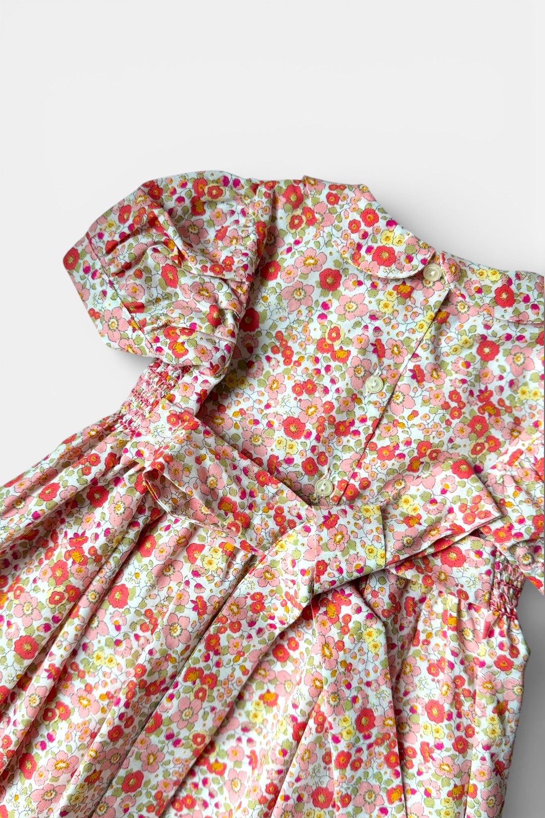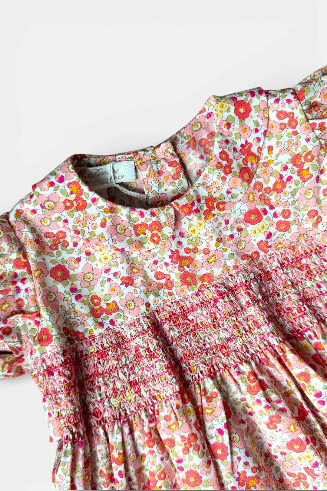 Abito con delicata fantasia floreale dai toni dell’arancio, rosa e corallo, manica corta a palloncino, ricamo punto smock, allacciatura posteriore con fiocco e bottoni.