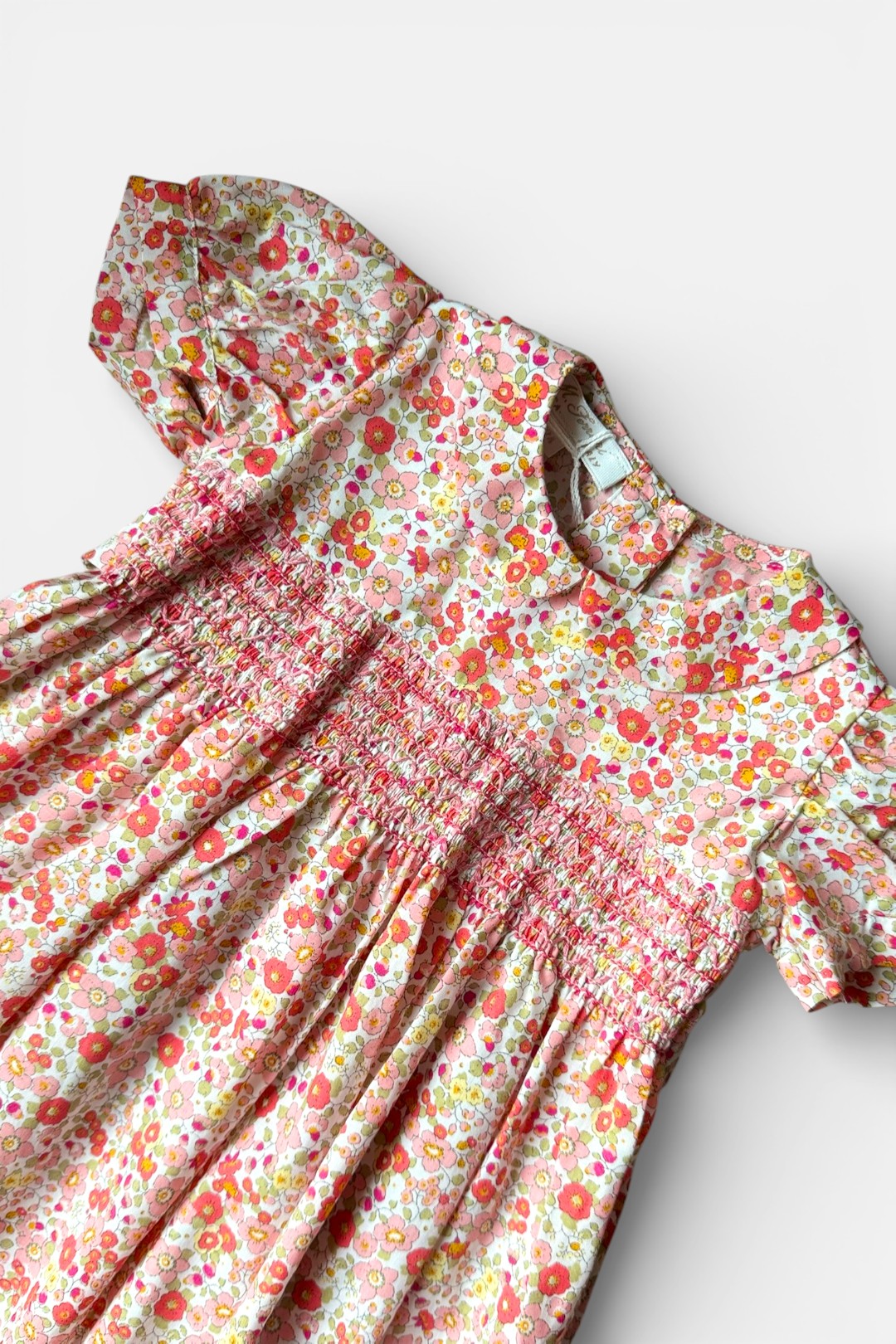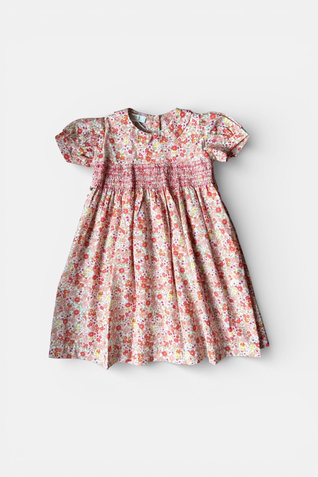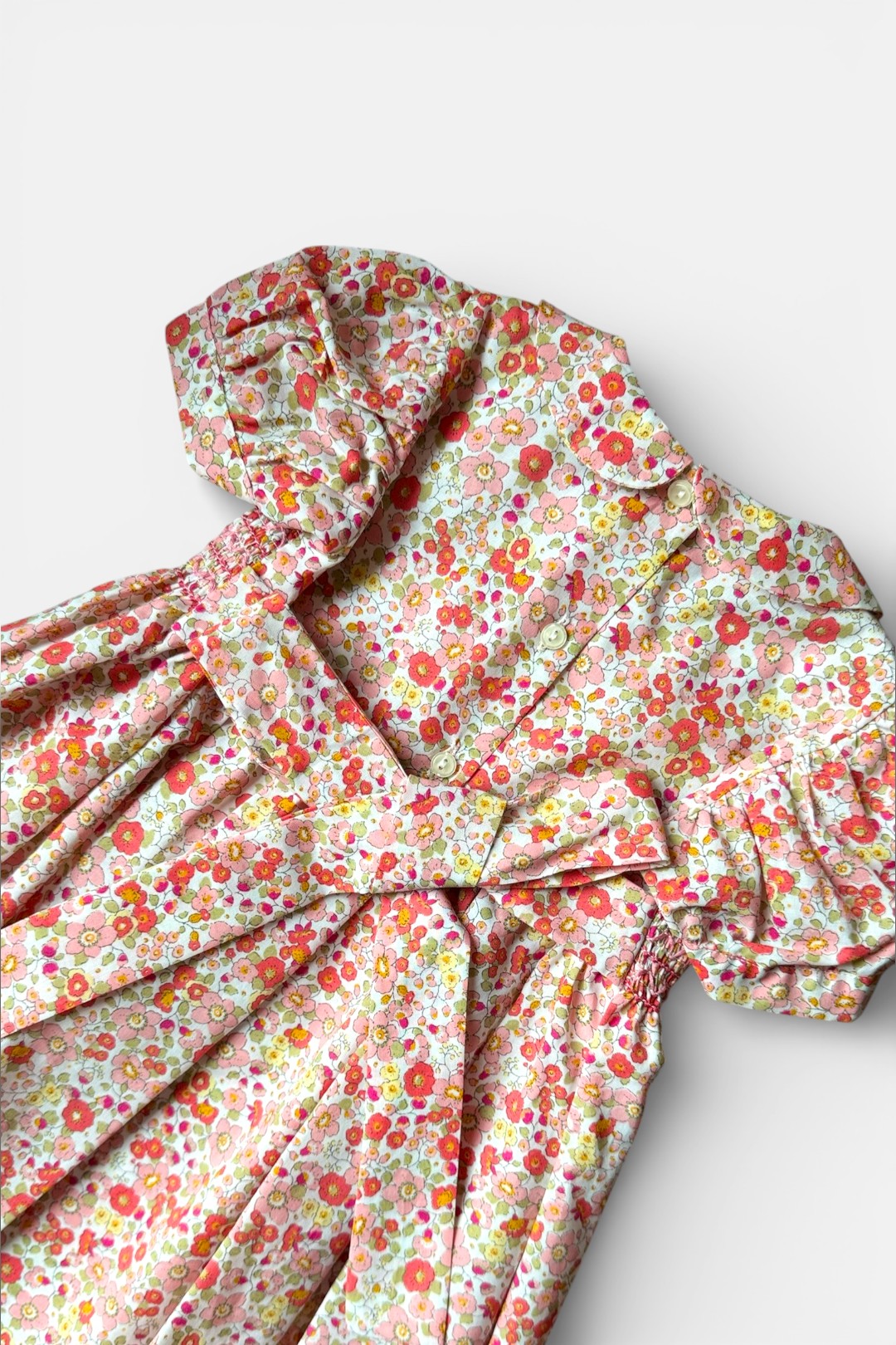 Abito con delicata fantasia floreale dai toni dell’arancio, rosa e corallo, manica corta a palloncino, ricamo punto smock, allacciatura posteriore con fiocco e bottoni.