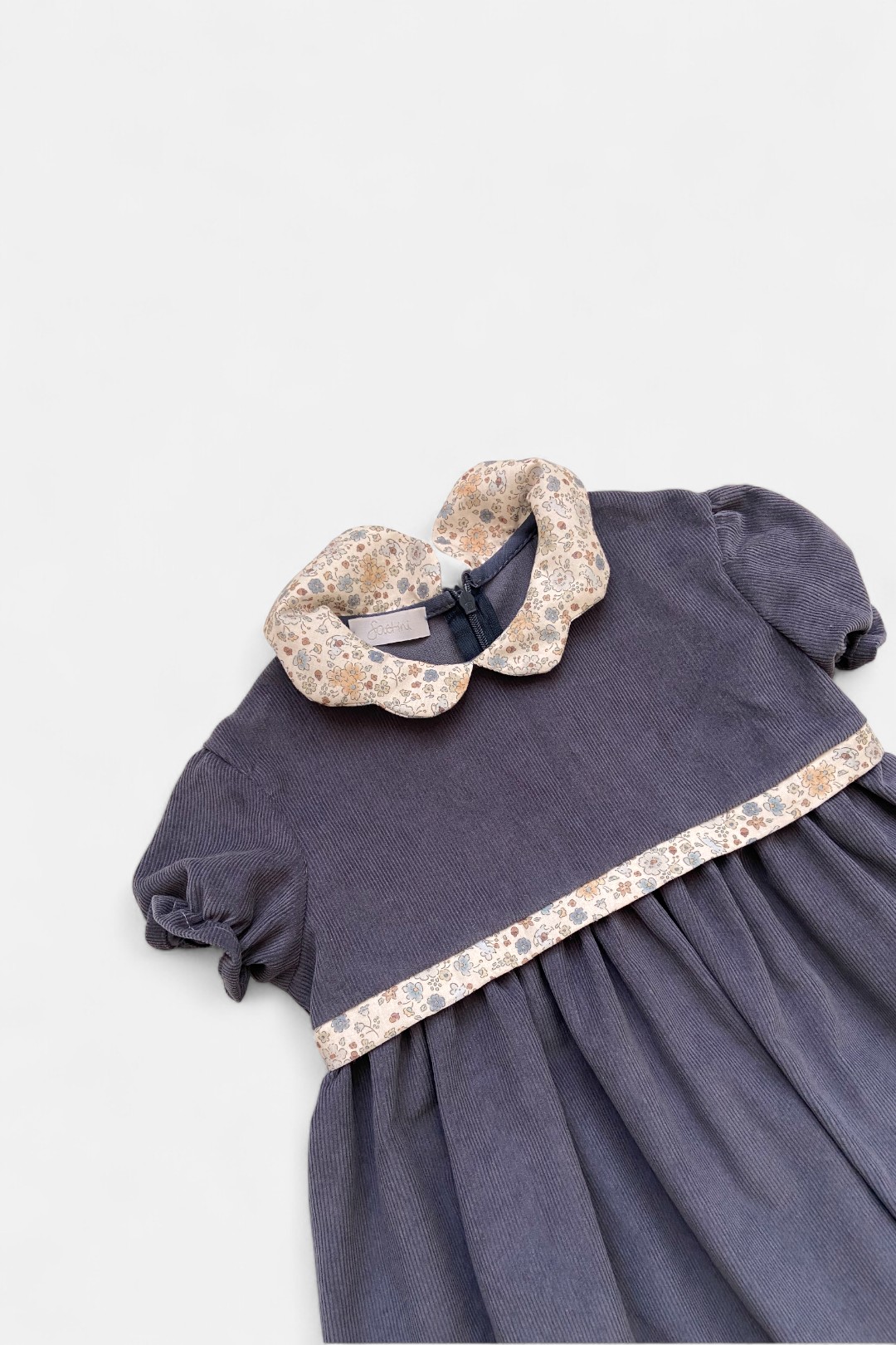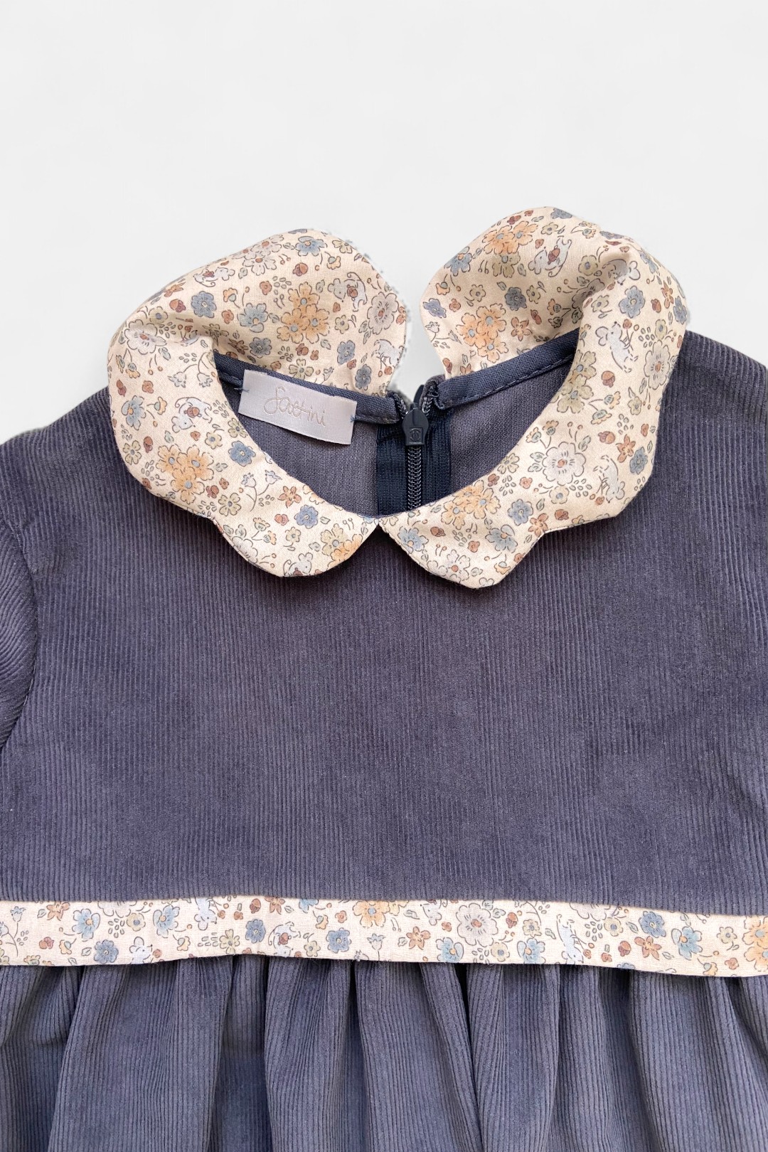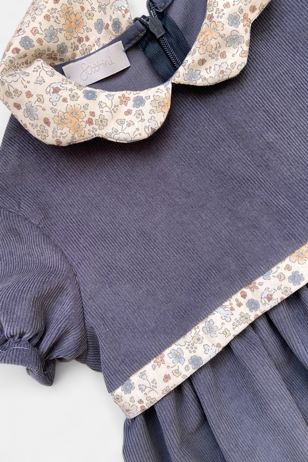 Abitino in velluto blu jeans con dettagli in fantasia fiorata, ideato e realizzato da Kiki&Isa.
