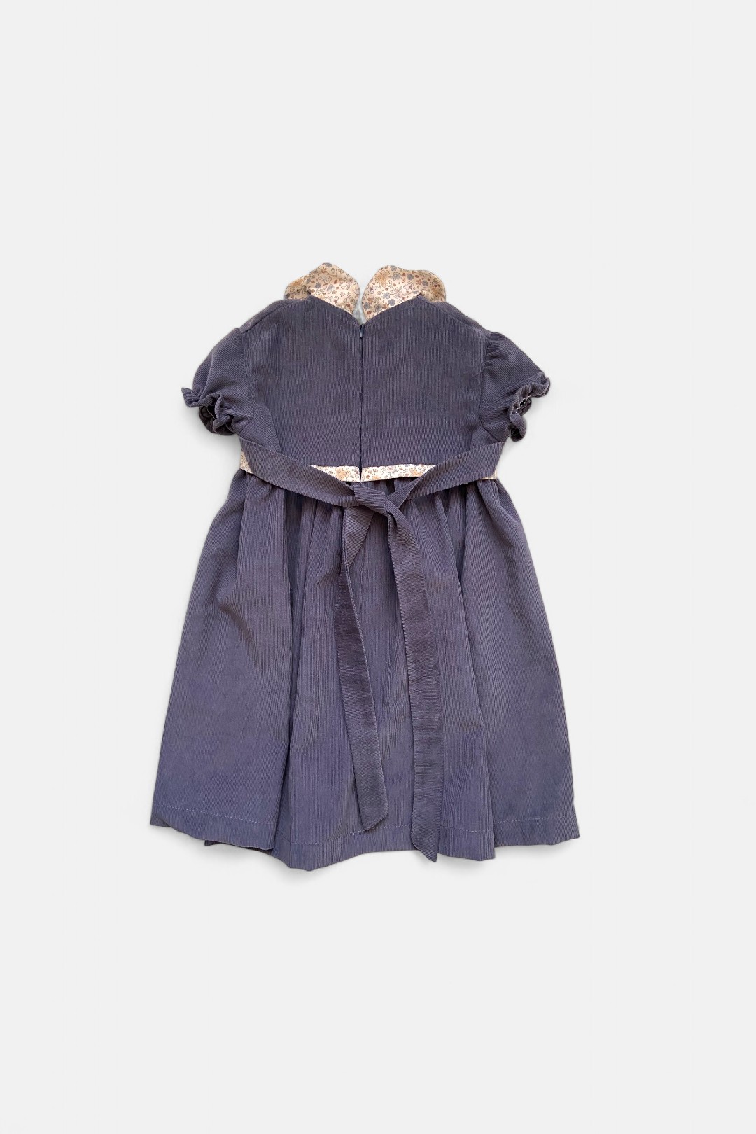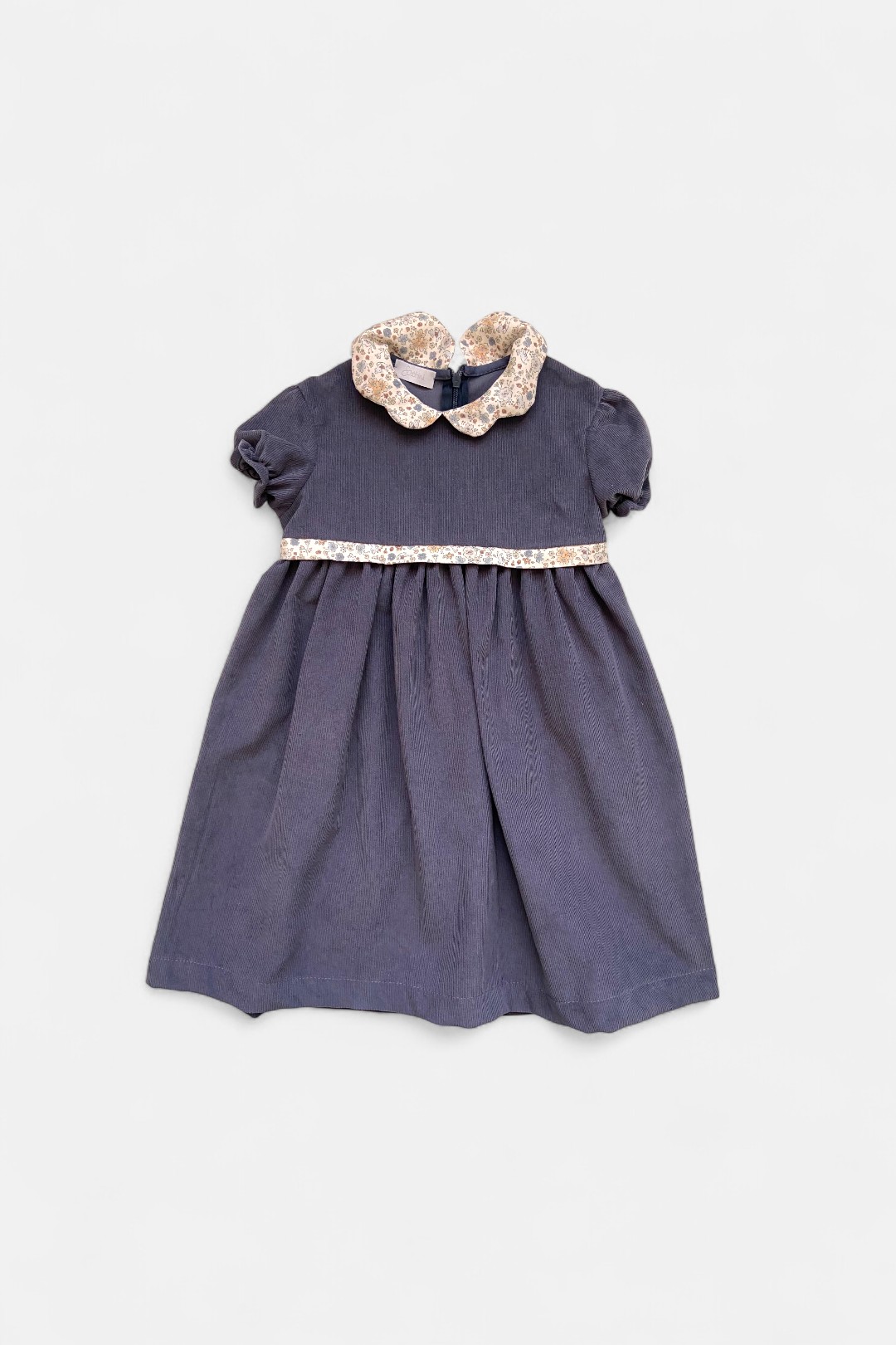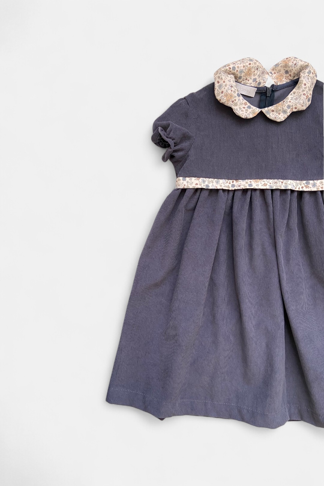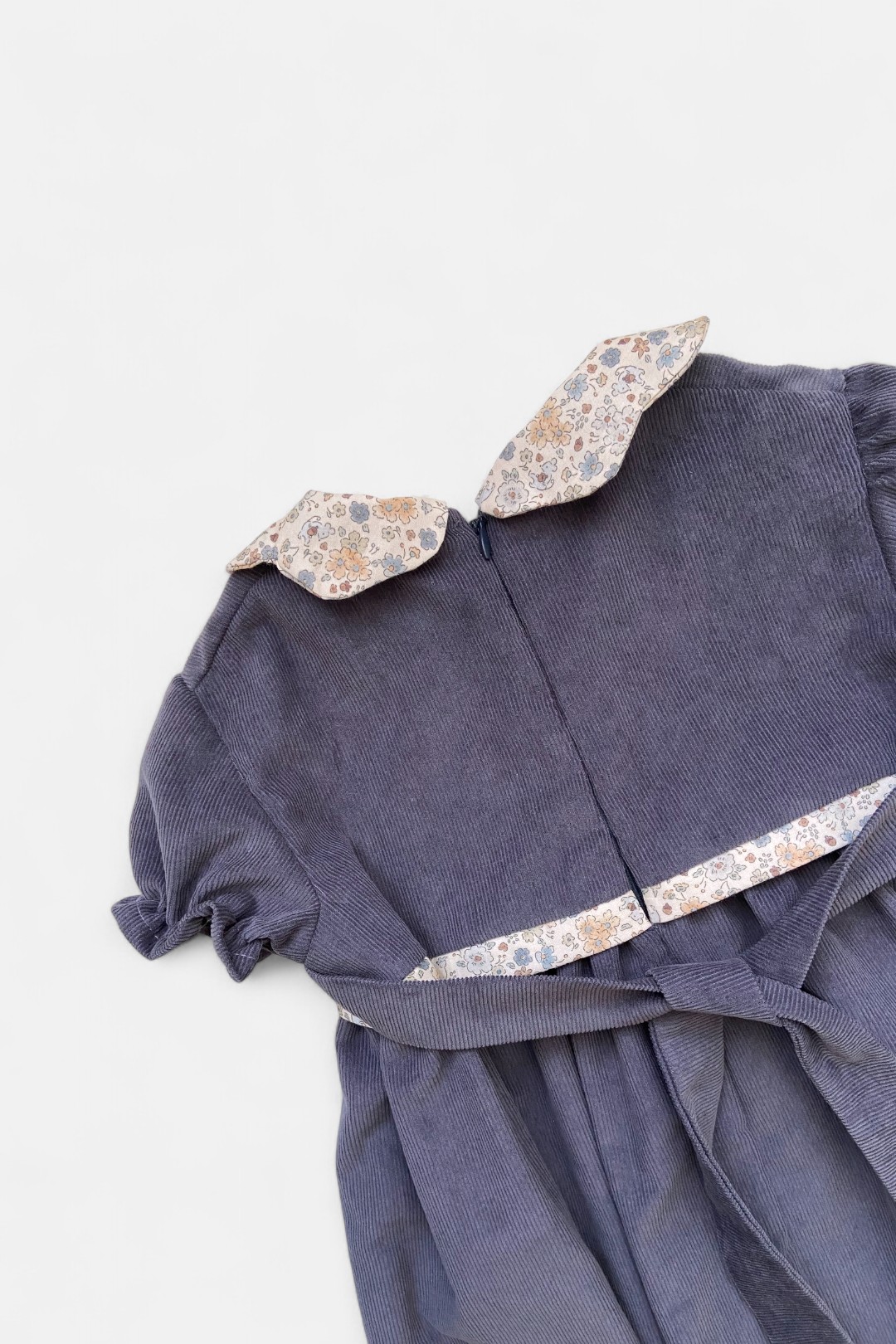 Abitino in velluto blu jeans con dettagli in fantasia fiorata, ideato e realizzato da Kiki&Isa.