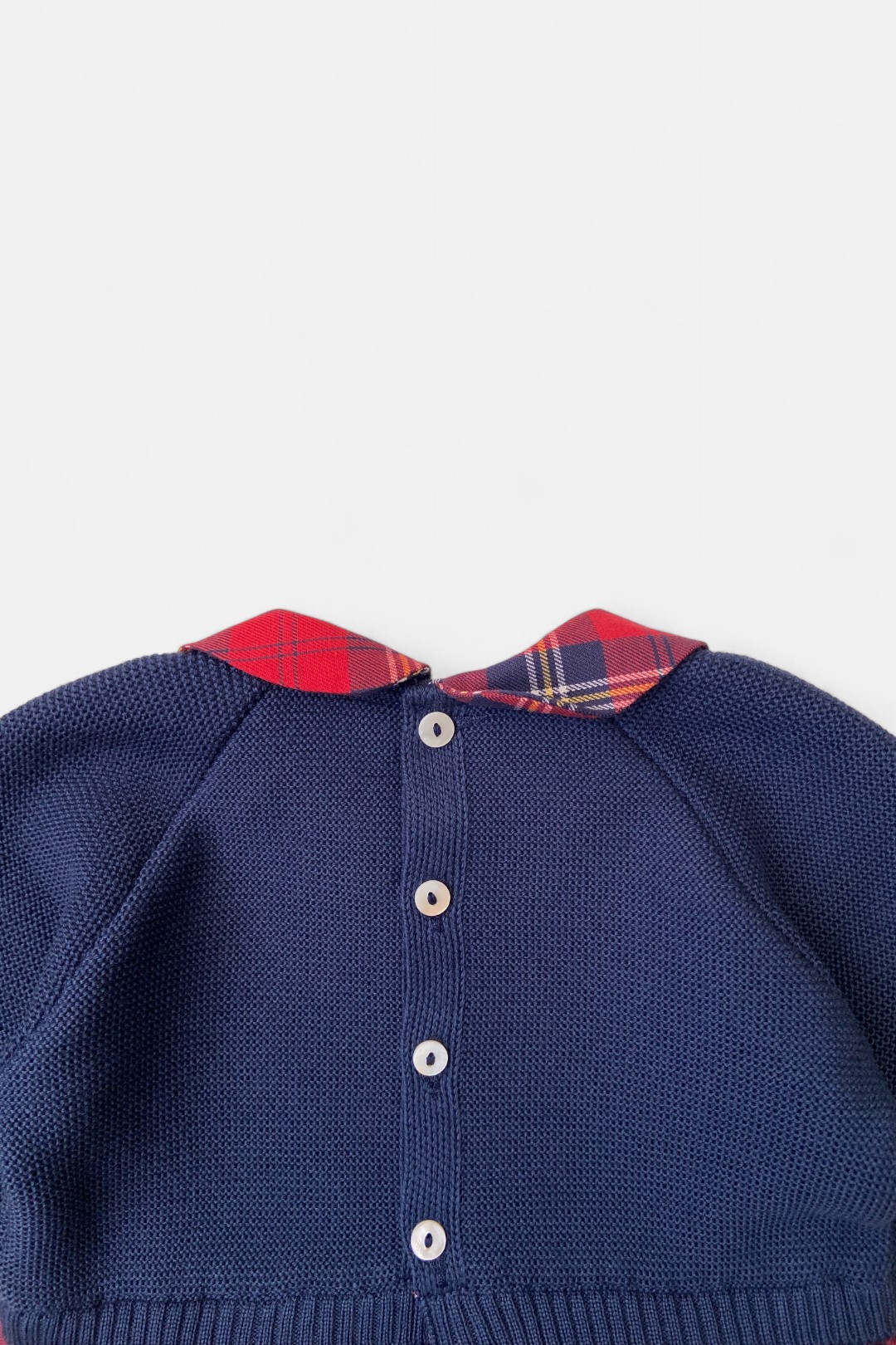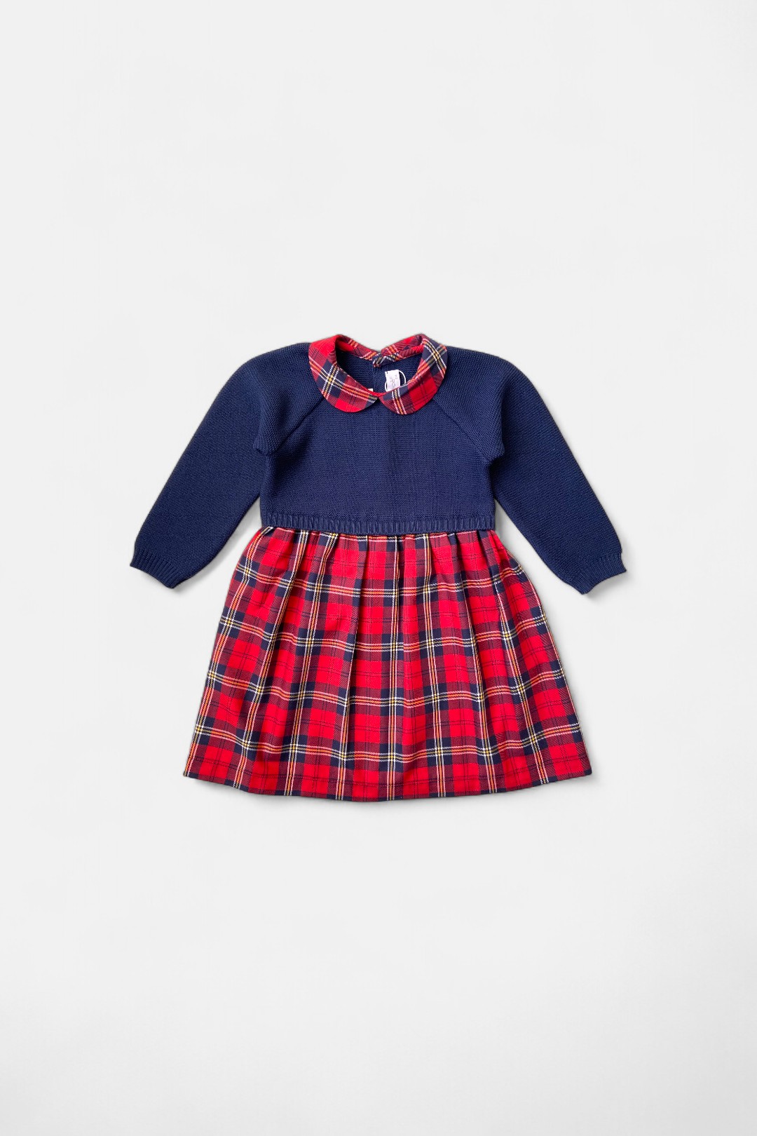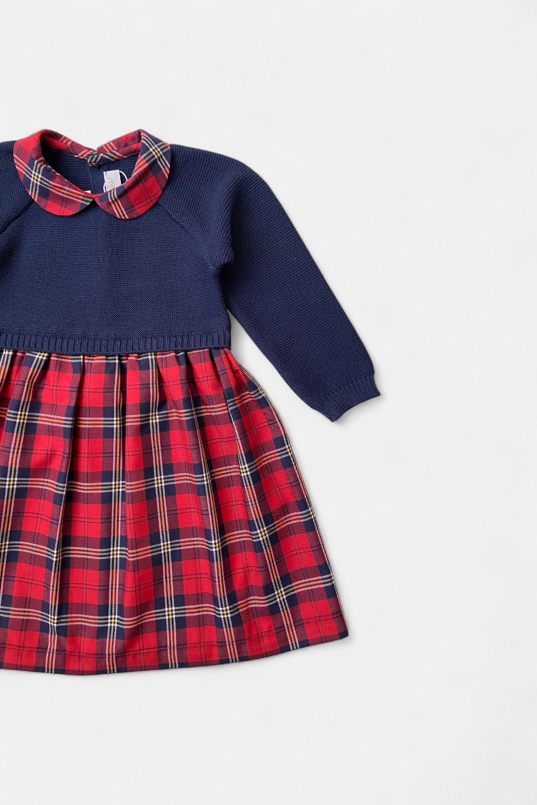 - colletto rotondo e gonna arricciata in tessuto scozzese rosso.
