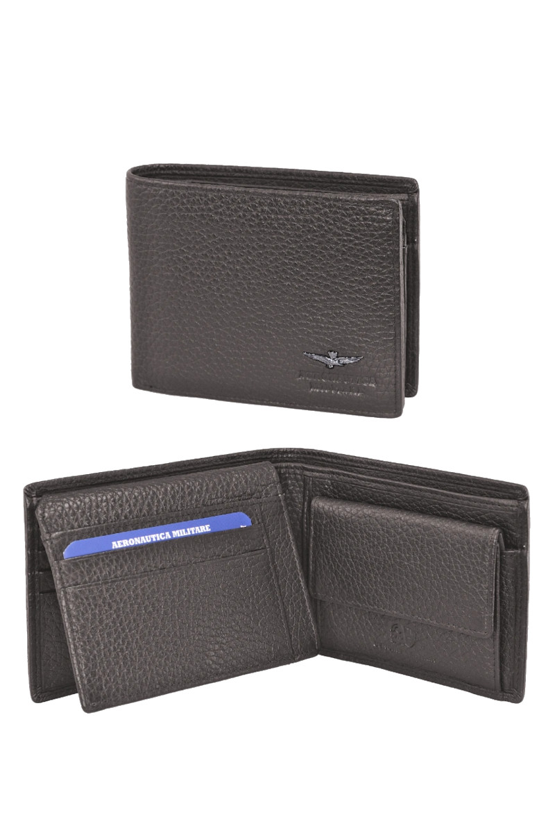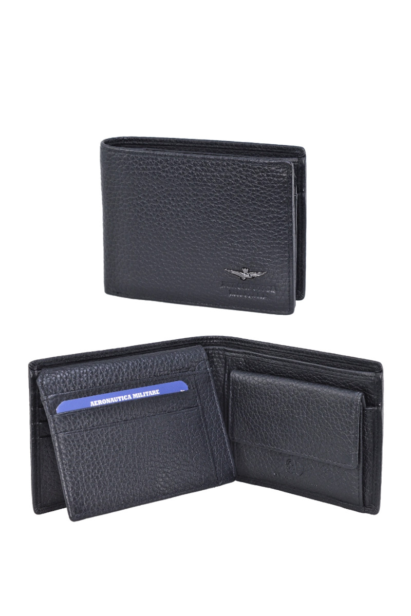 Portafoglio da uomo in pelle morbida effetto martellato con porta spicci e divisorio portacarte. Modello caratterizzato dallโaquila in metallo con marchio a fuoco Aeronautica Militare. La morbidezza del pellame lo rende comodo e perfetto da portare in tasca, senza dover rinunciare alla resistenza ed eleganza. Misure: 12x2x9 cm