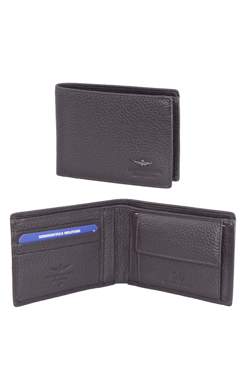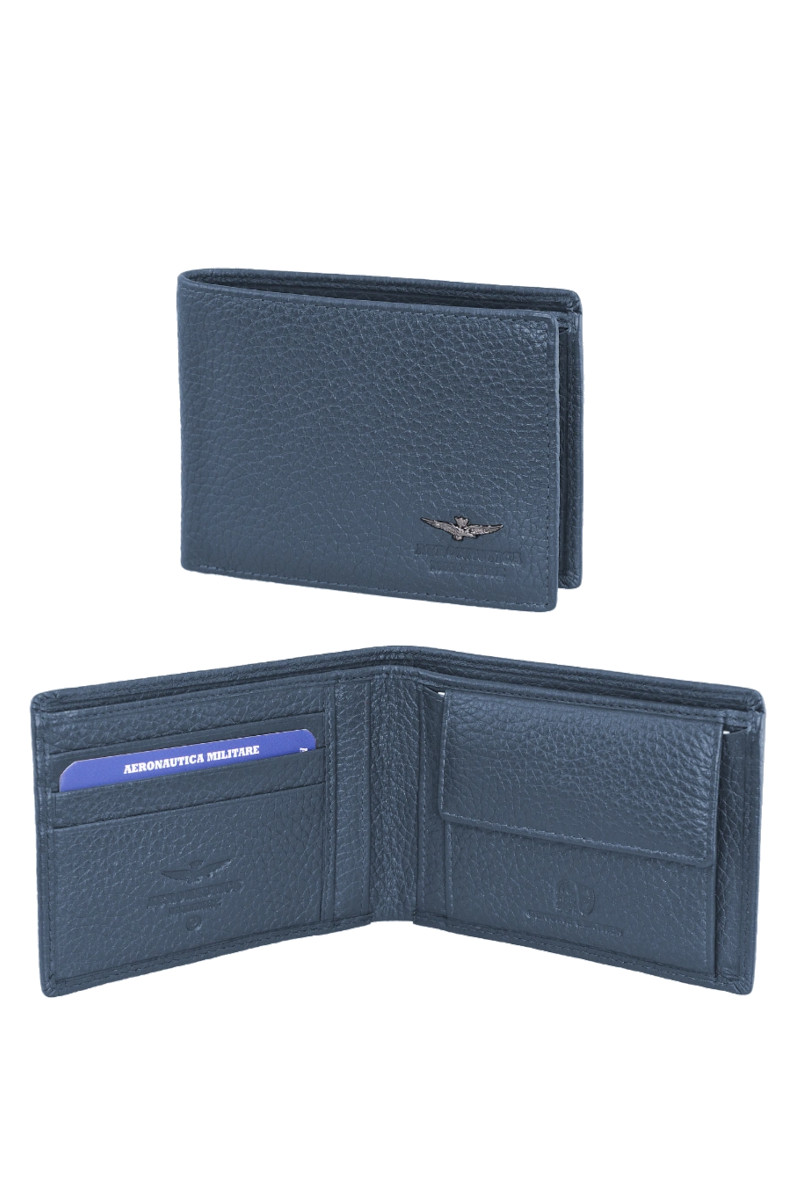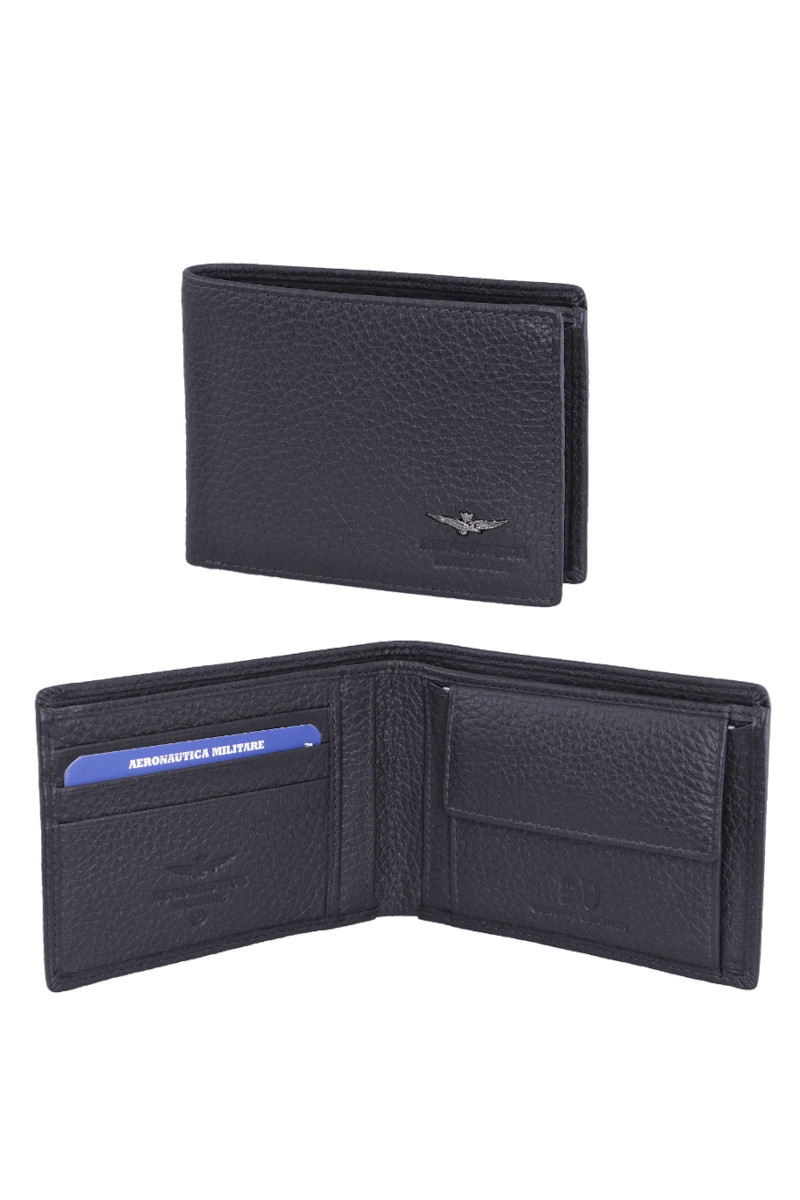 Portafoglio da uomo in pelle morbida effetto martellato. Modello con portacarte e tasca monete, caratterizzato dallโaquila in metallo con marchio a fuoco Aeronautica Militare. La morbidezza del pellame lo rende comodo e perfetto da portare in tasca, senza dover rinunciare alla resistenza ed eleganza. Misure: 12x2x9 cm