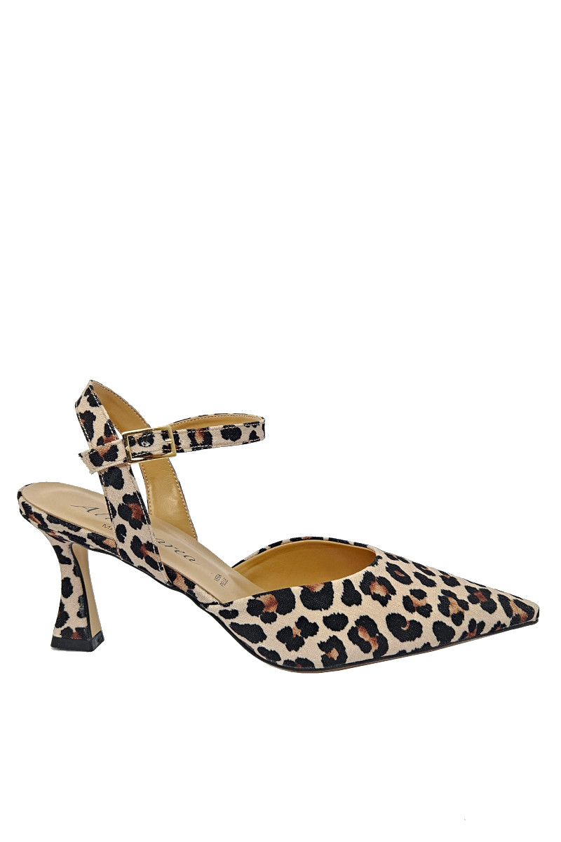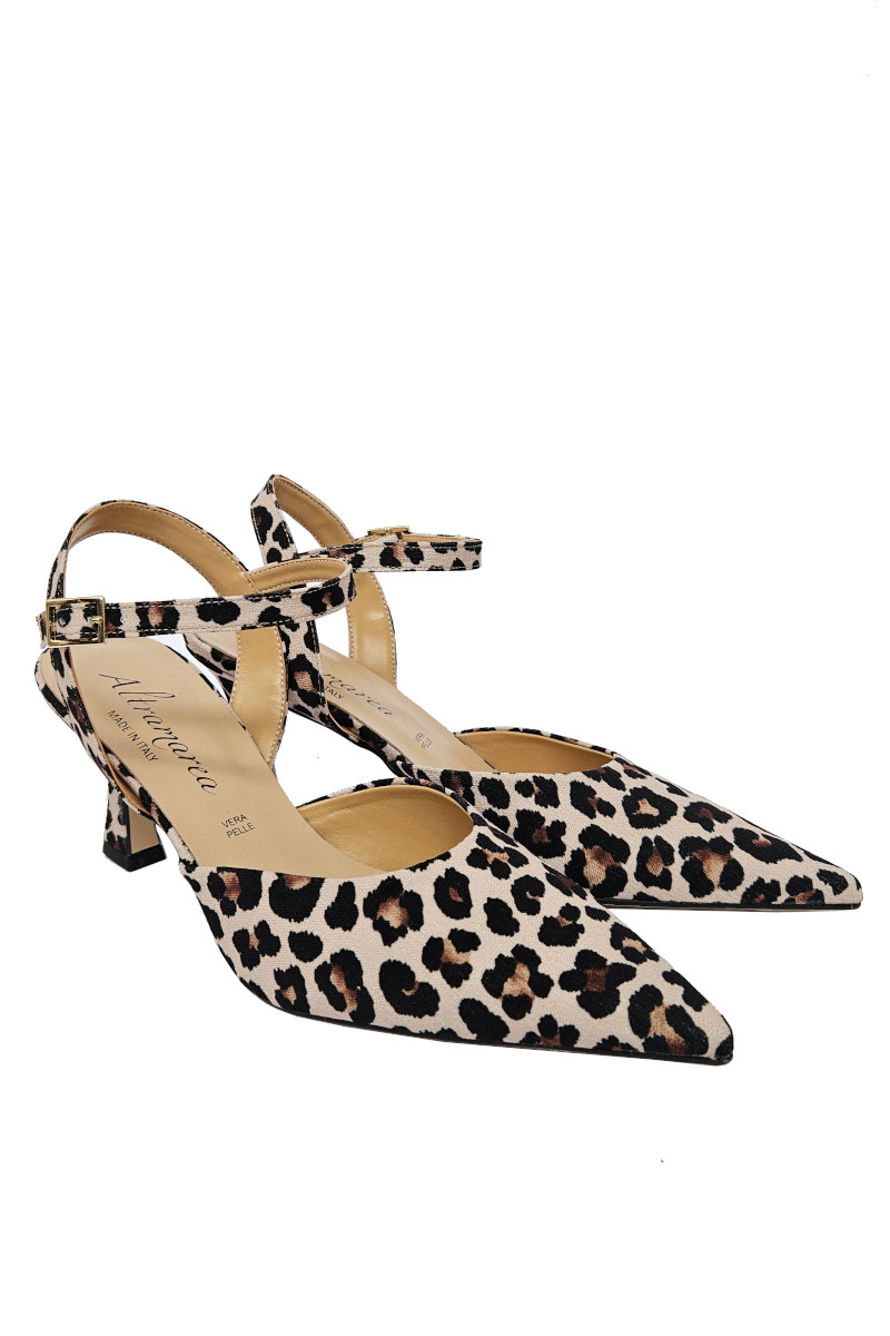 Sandalo punta in tessuto stampa maculata con cinturino alla caviglia. Strepitoso e di tendenza, se lo indossi non passi inosservata. Tacco 7 cm