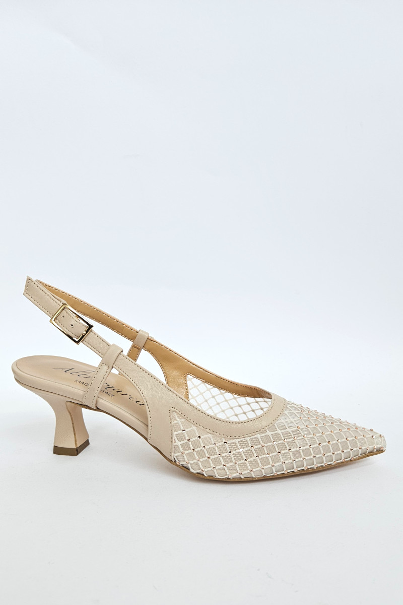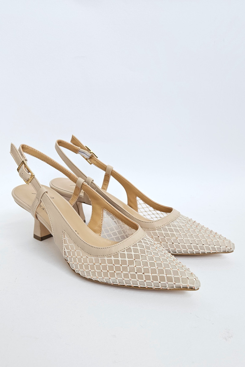 Scarpa elegante modello sling back realizzata in rete trasparente e brillantini color nude. Super elegante e alla moda, perfetto per cerimonie e non solo.. Tacco 6 cm