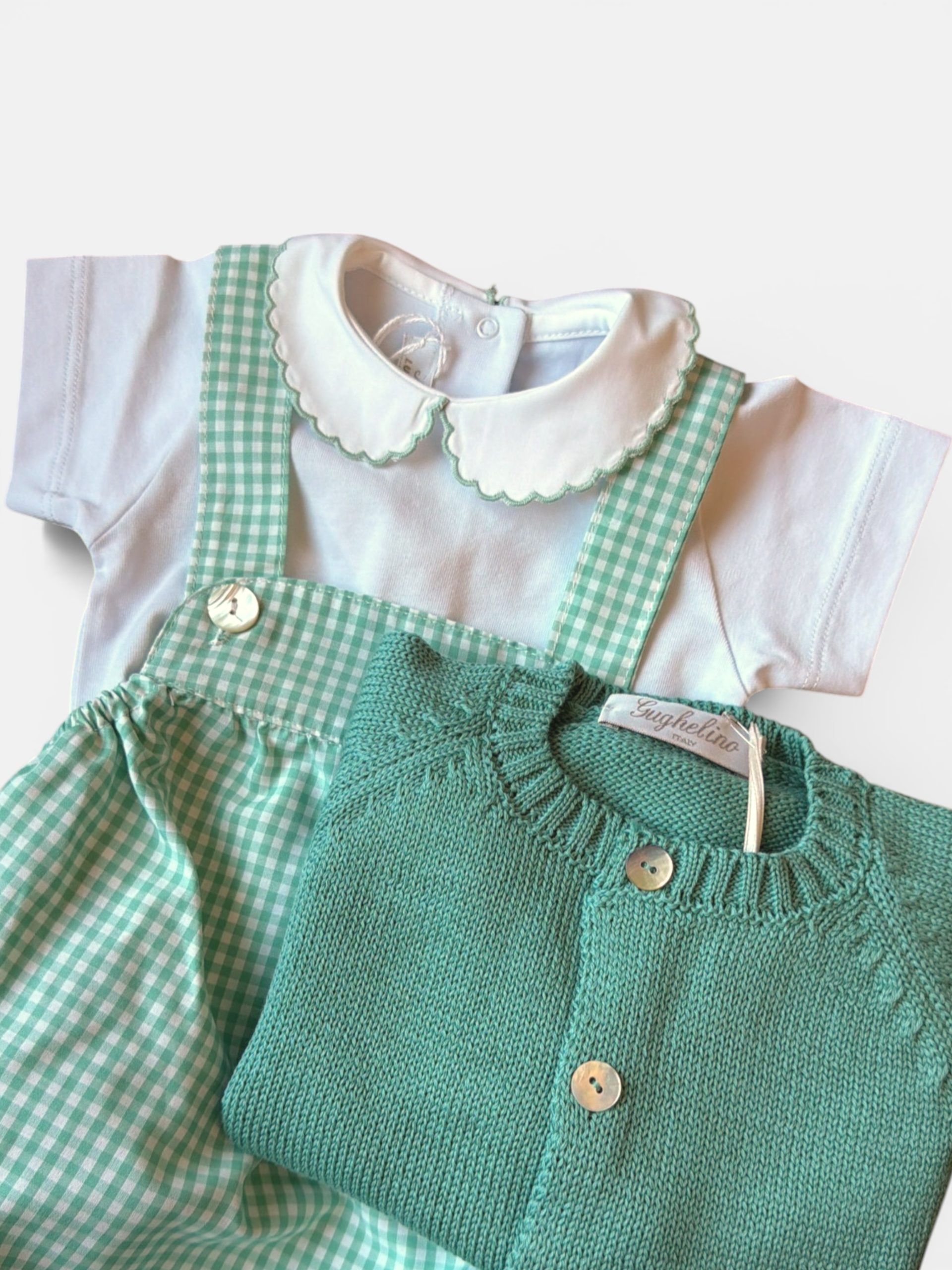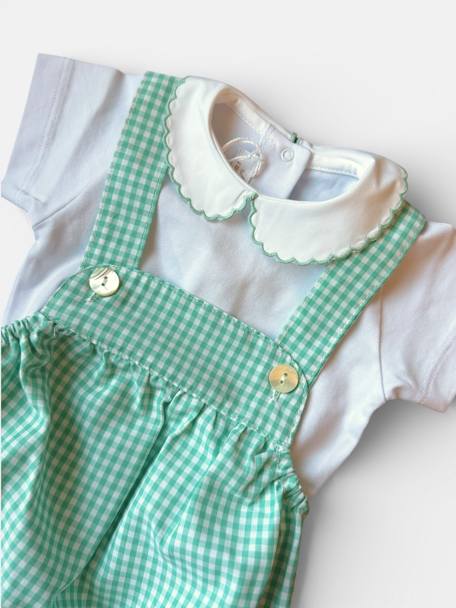 Un capo basico ma ricercato, indispensabile per completare gli outfit della collezione. Questo body in morbido cotone si distingue per il raffinato colletto tondo, rifinito con un delicato ricamo a smerlo verde acqua che richiama le tonalitร della stampa vichy verde acqua.