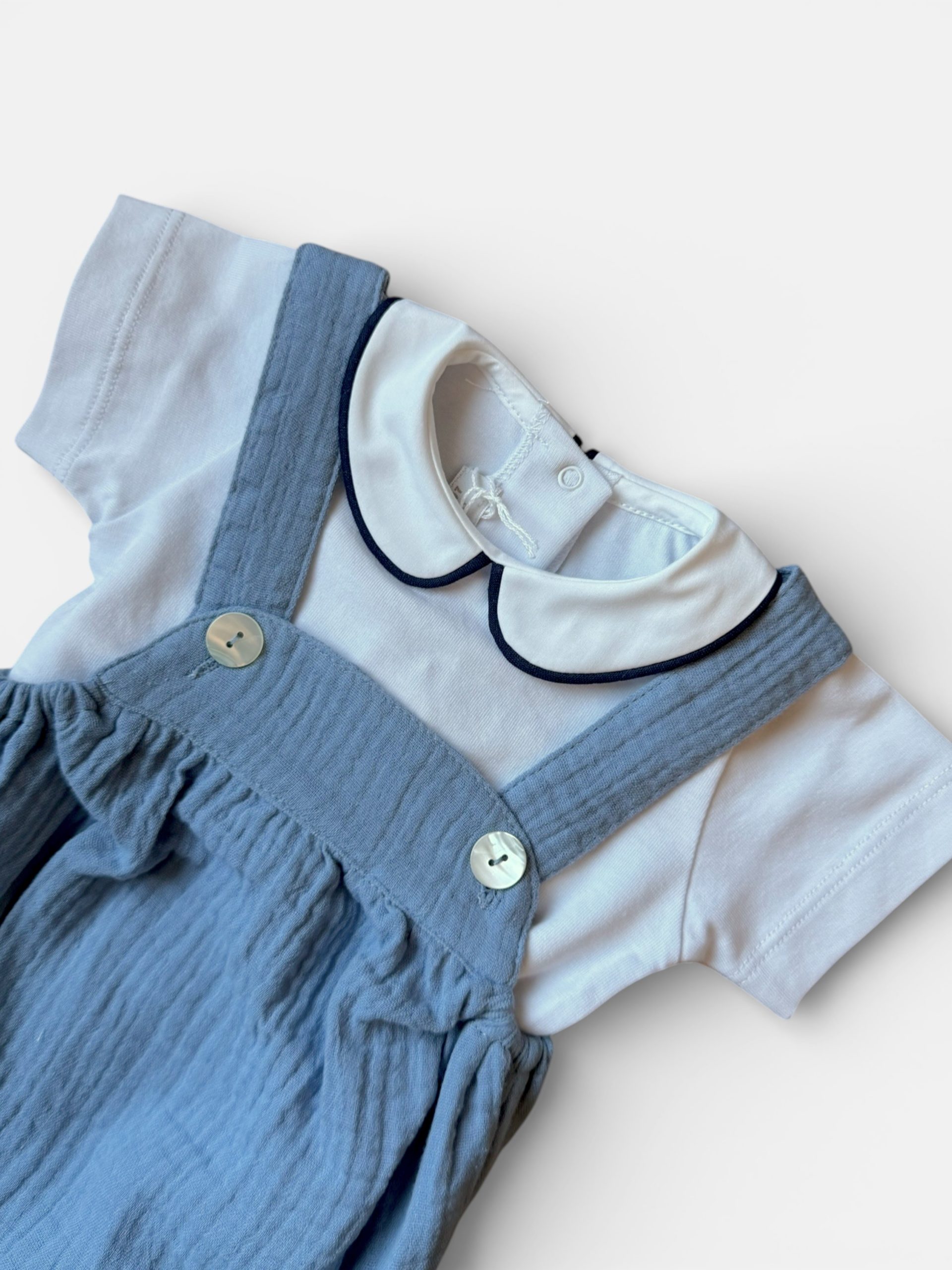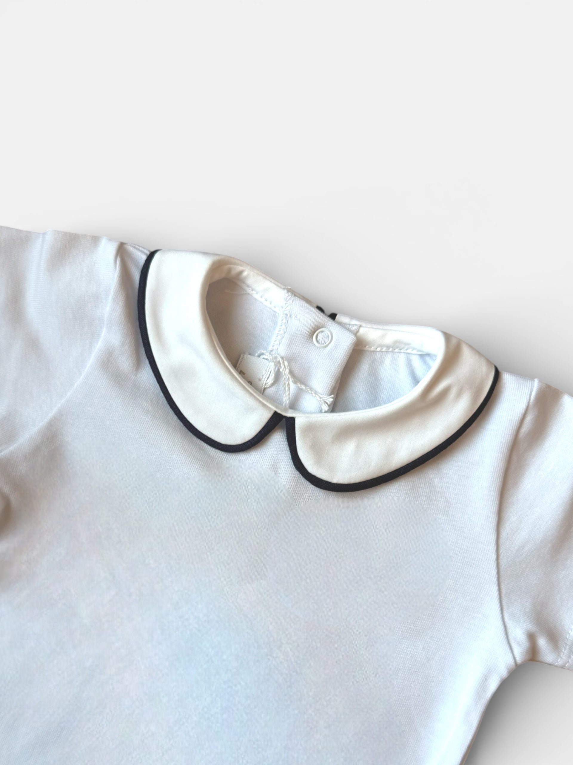 Un body raffinato in morbido cotone elasticizzato, caratterizzato dal colletto tondo con profilo a contrasto in blu navy. Il tocco di classe ideale per completare salopette e pagliaccetti con un gusto tipicamente italiano.