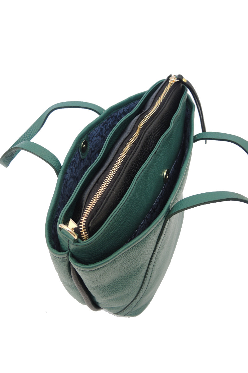 Borsa a mano Bruno Rossi Firenze, realizzata in pelle martellata color Foresta con dettagli Neri. Borsa con 3 scomparti di cui 2 con chiusura bottone e 1 con chiusura cerniera. Tracolla lunga in dotazione per poterla indossare in ogni occasione.