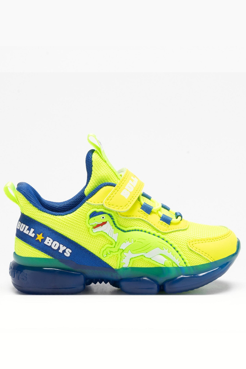 Scarpa da bambino con luci linea DINOSAURO dilofosauro Bull Boys. Scarpa con strappo e laccio elasticizzato. Sneaker luci dinosauro color giallo neon.