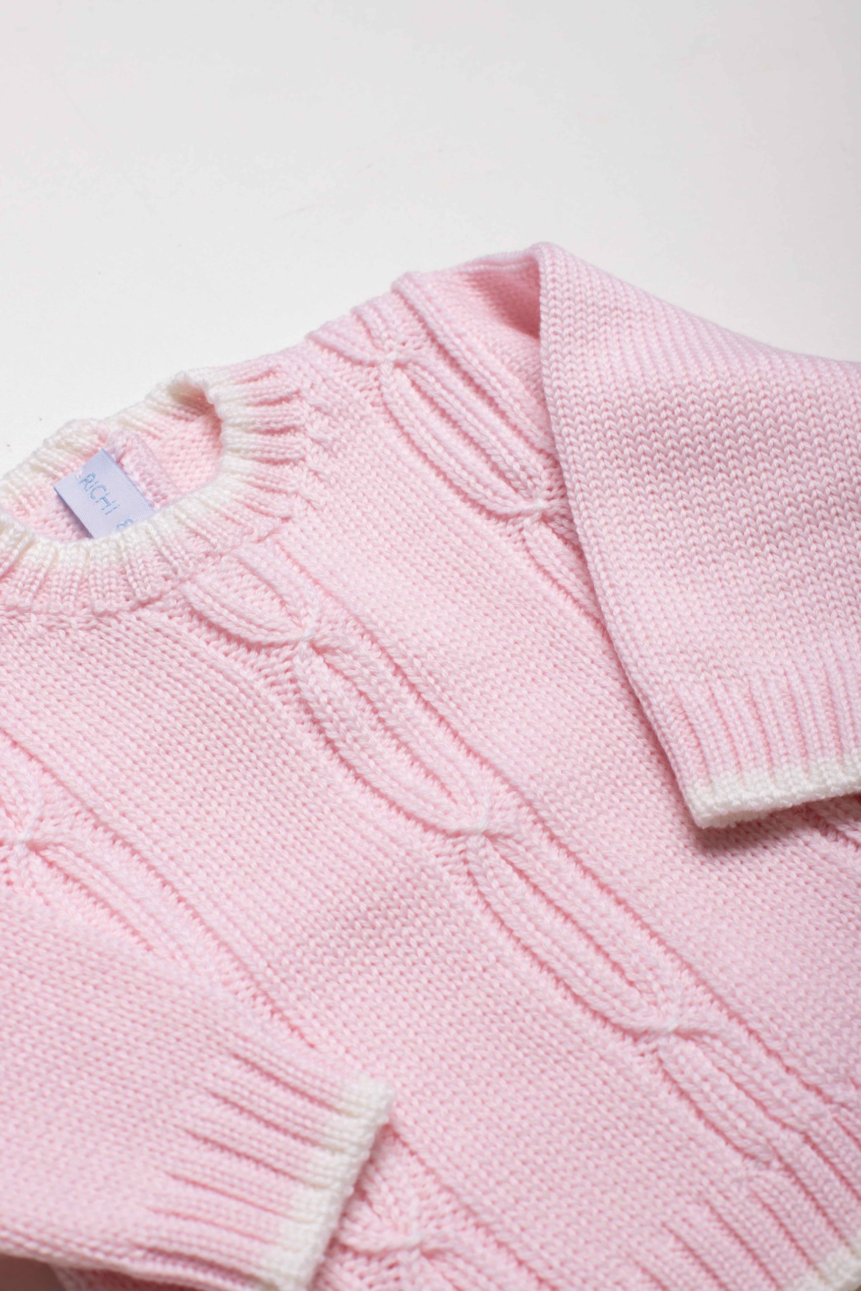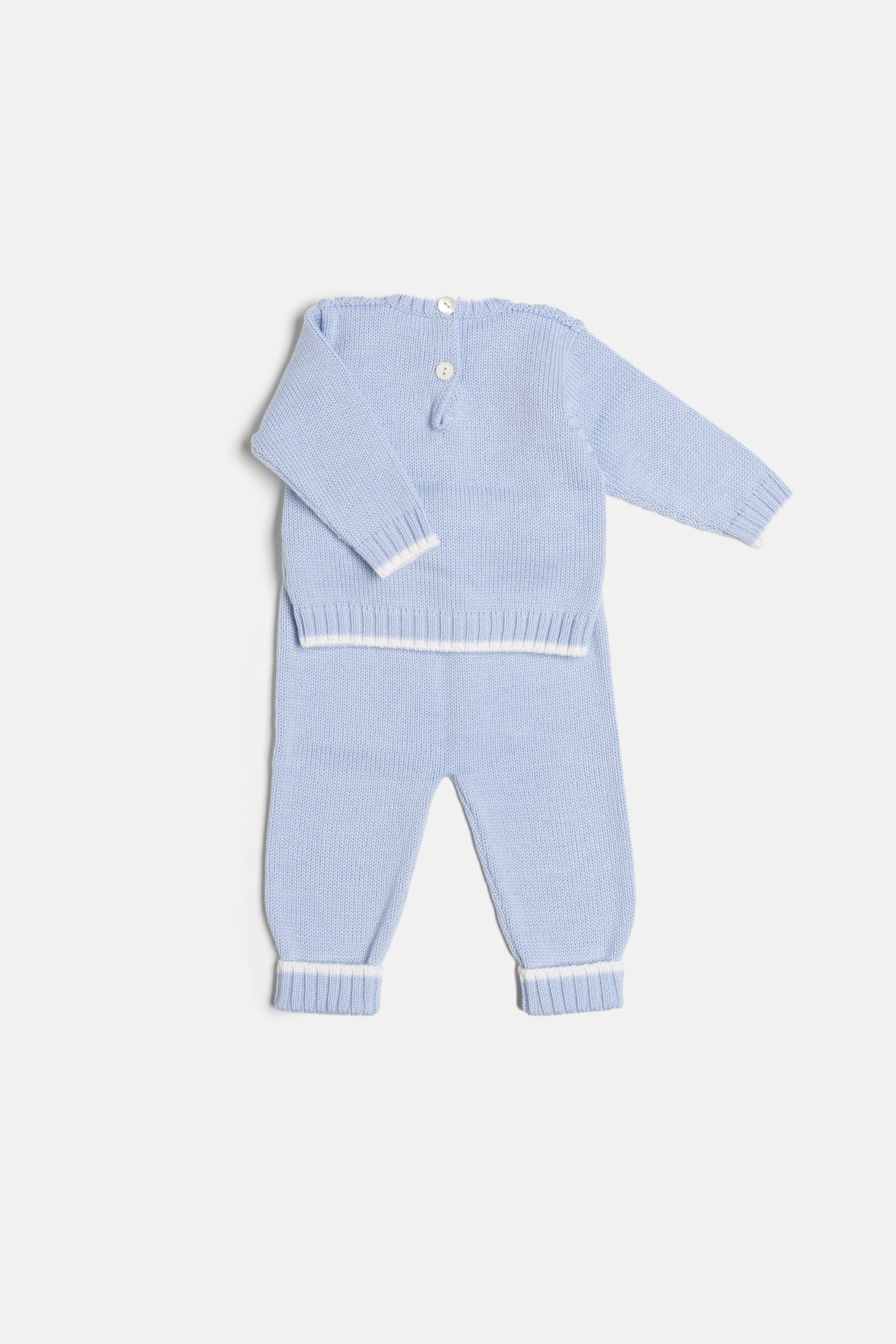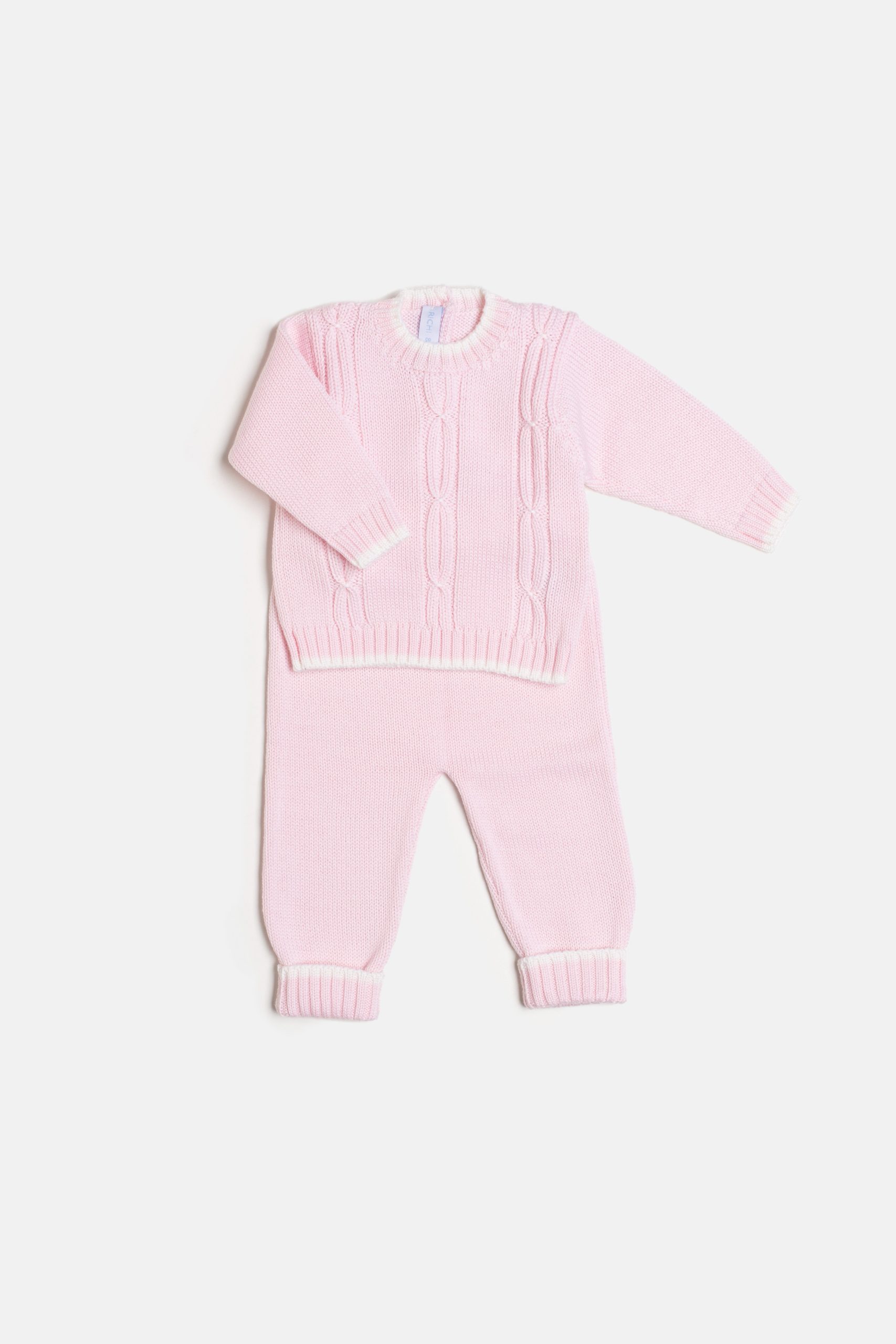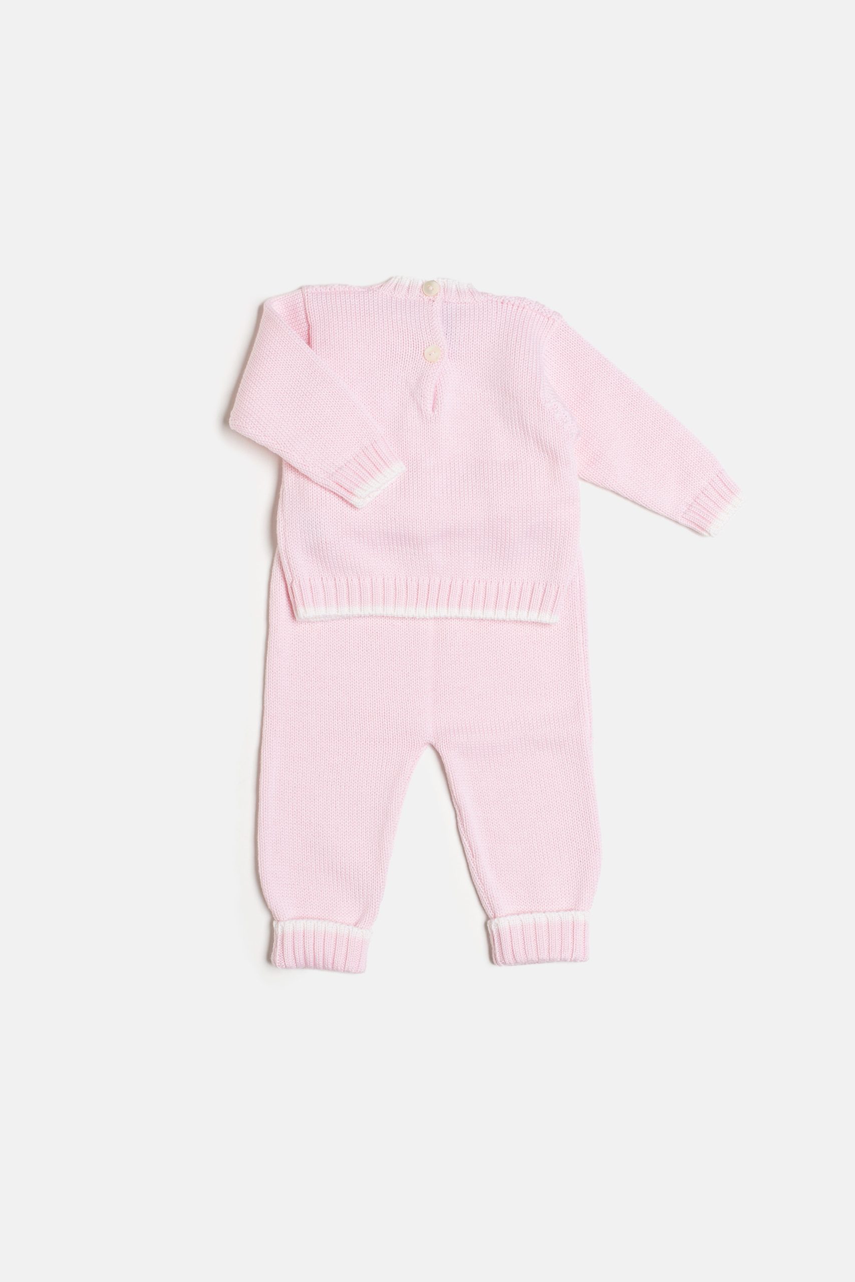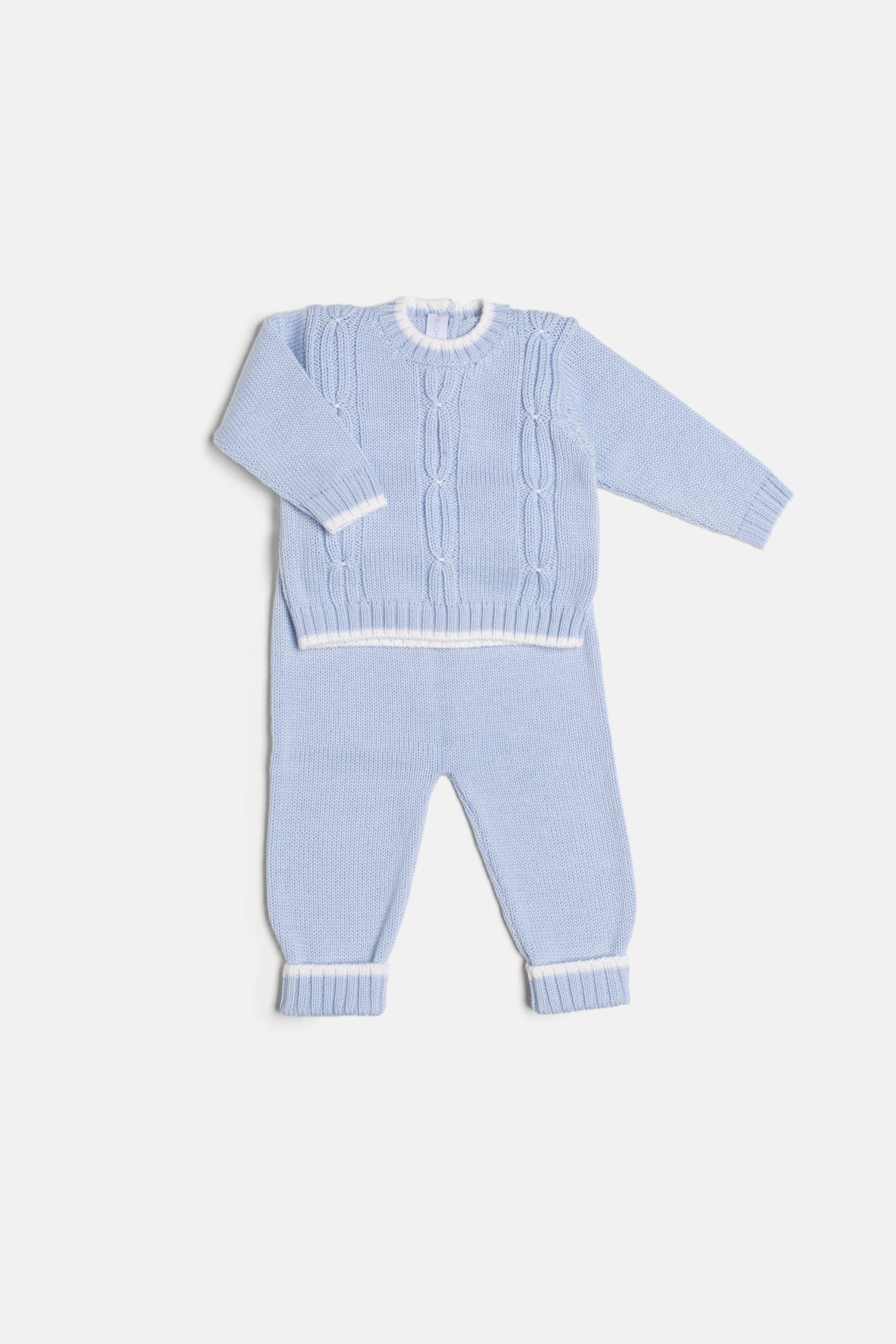 Morbido completino in pura lana merino in un soffice rosa o azzurro con profili bianco panna. Composto da maglioncino a manica lunga e pantalone lungo con risvolto. Il maglione è caratterizzato da una lavorazione a trecce. Elegante, caldo, pratico per i vostri bebè.Vestibilità morbida che lo rende sfruttabile a lungo.