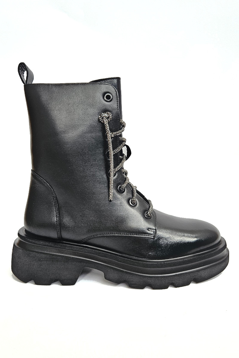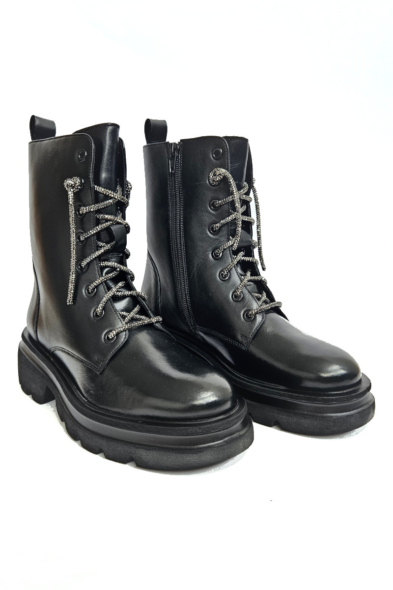 Anfibio Cristin donna realizzato in pelle color nero con lacci di brillantini. Questi scarponcino allacciato รจ dotato di cerniera laterale per permetterne una calzata comoda e veloce. Fodera in tessuto e sottopiede in pelle.
