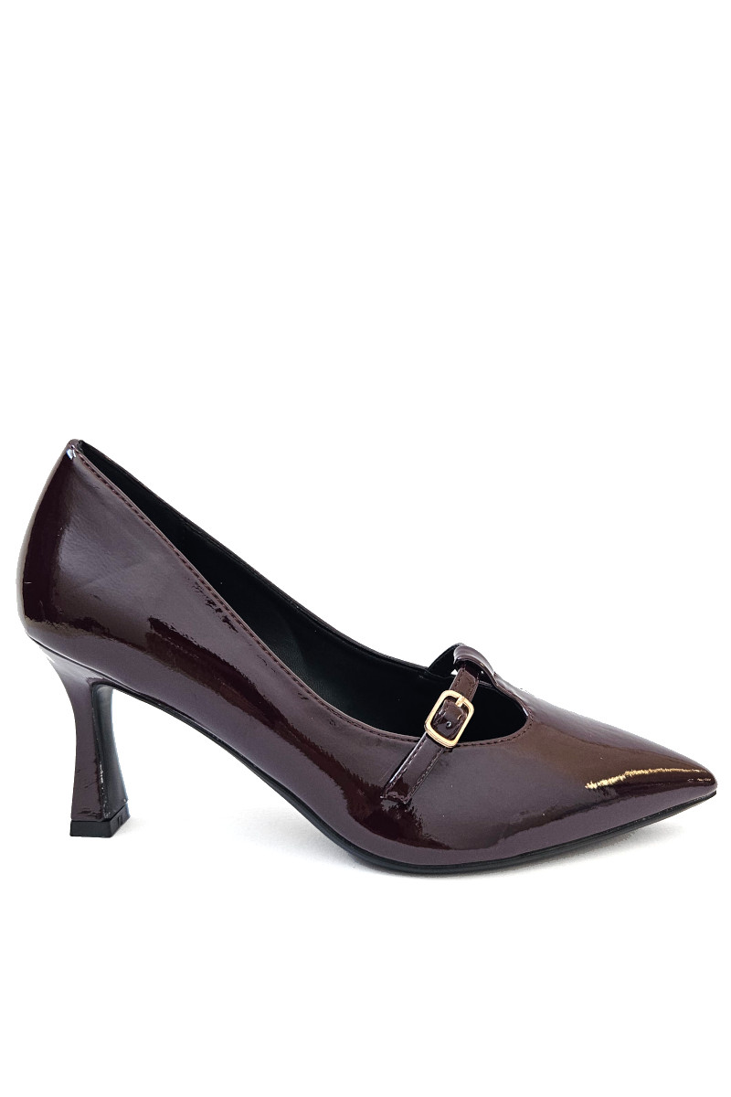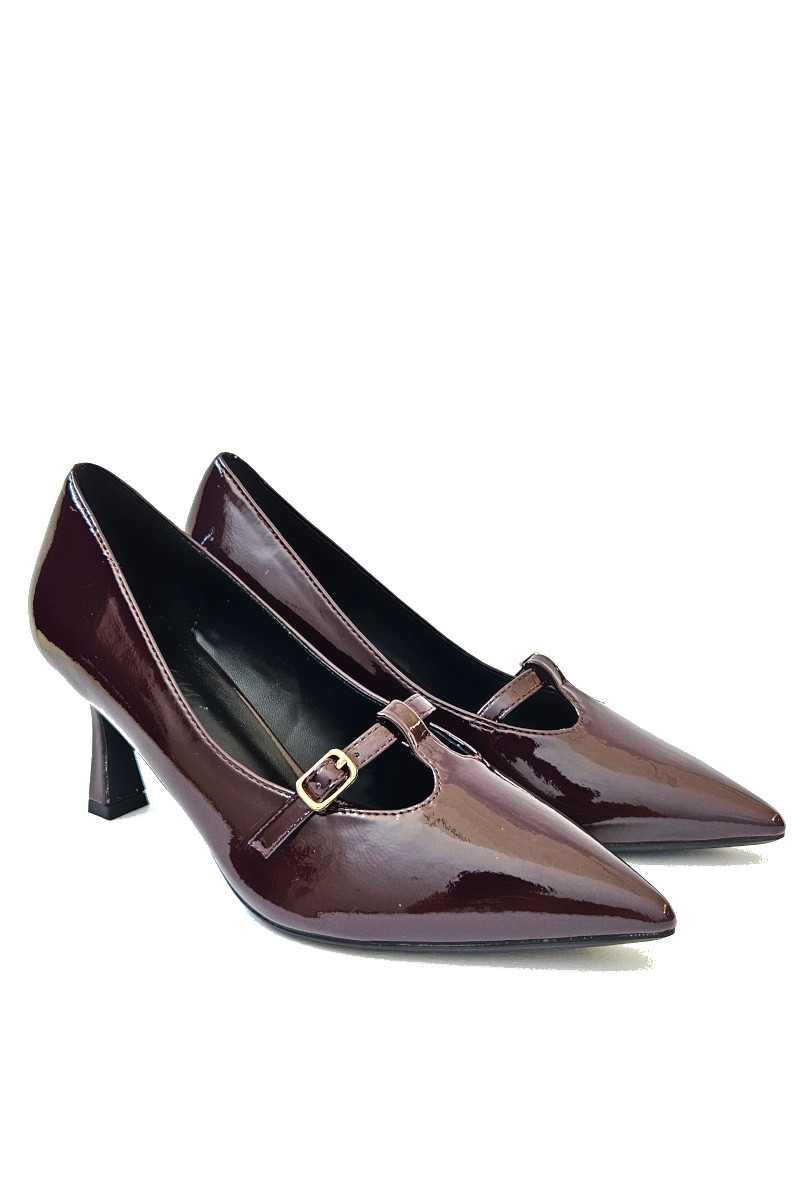Dècolletè in vernice lucida color barolo con fibbia frontale. Splendida scarpa elegante a punta da indossare in occasioni speciali. Comodo tacco a rocchetto. Tacco 7 cm