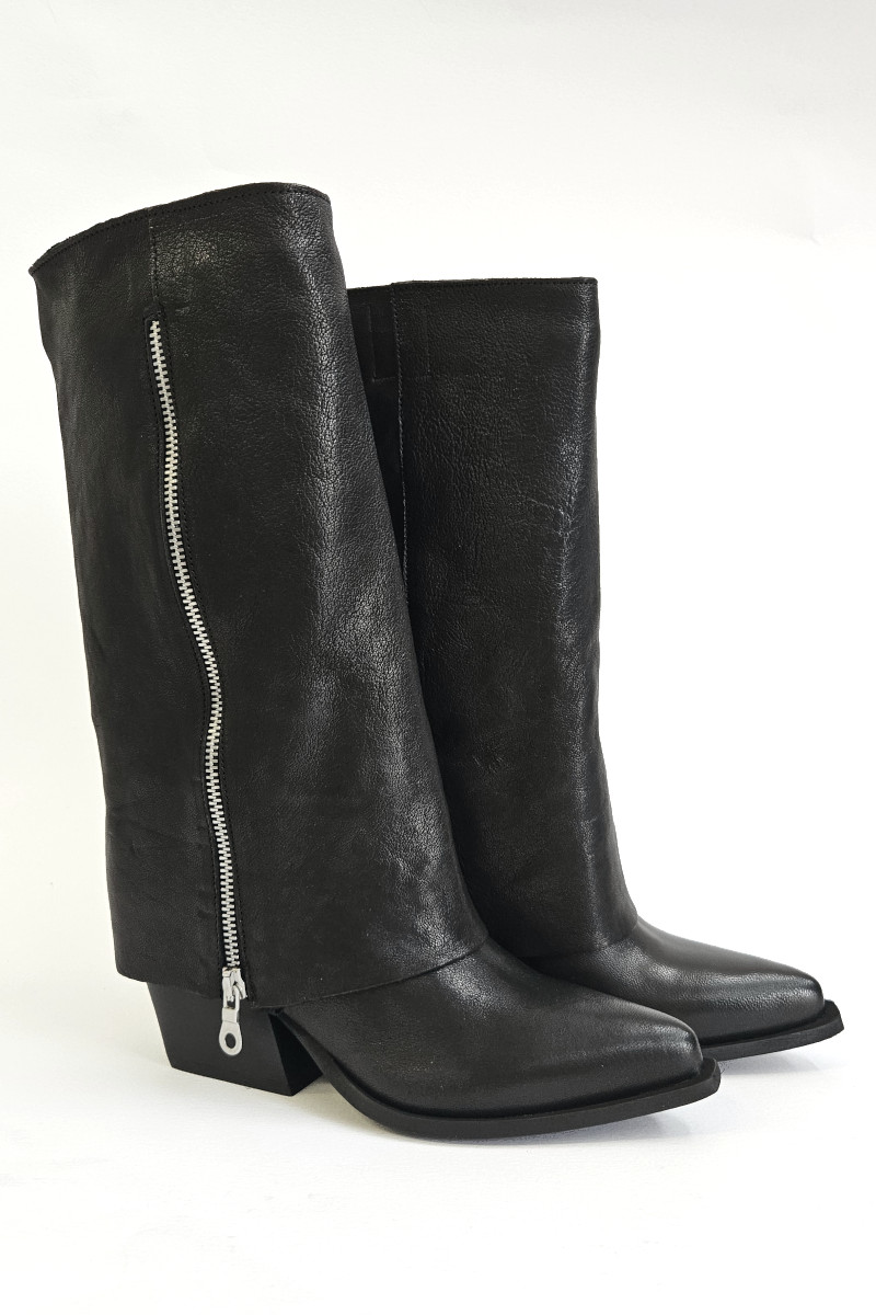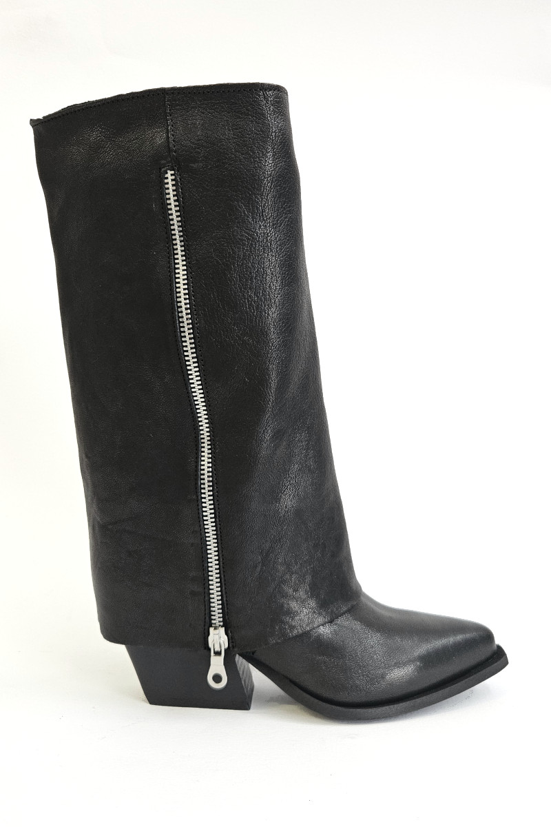 Texano donna Divine Follie con gambale calato e cerniera. Uno stivaletto modello texano realizzato in pelle color nero e tacco 7 cm. Anche per questa stagione si riconferma uno tra i modelli piรน di tendenza. Strepitoso abbinato a shorts e abiti.