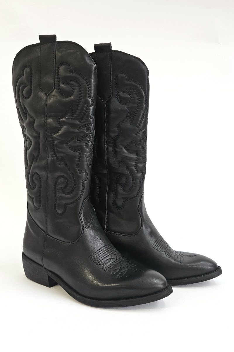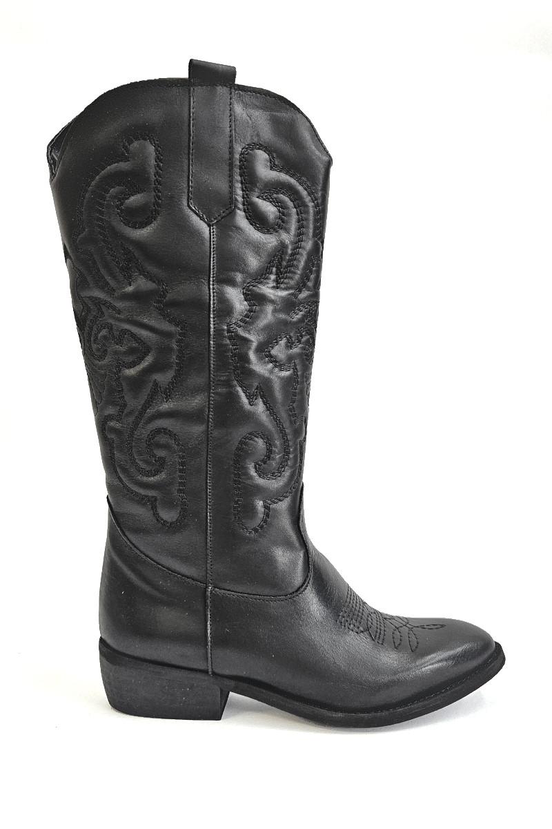 Stivale texano realizzato in pelle color nero con ricamo. Ormai da anni รจ tornato in voga questo splendido modello. Perfetto con abiti corti, lunghi, minigonne e pantaloni di ogni forma e colore. Uno stivale da indossare tutto l’anno che non passerร mai di moda. Tacco 4cm