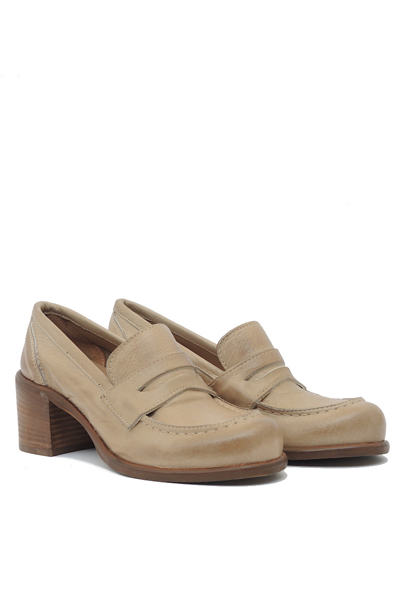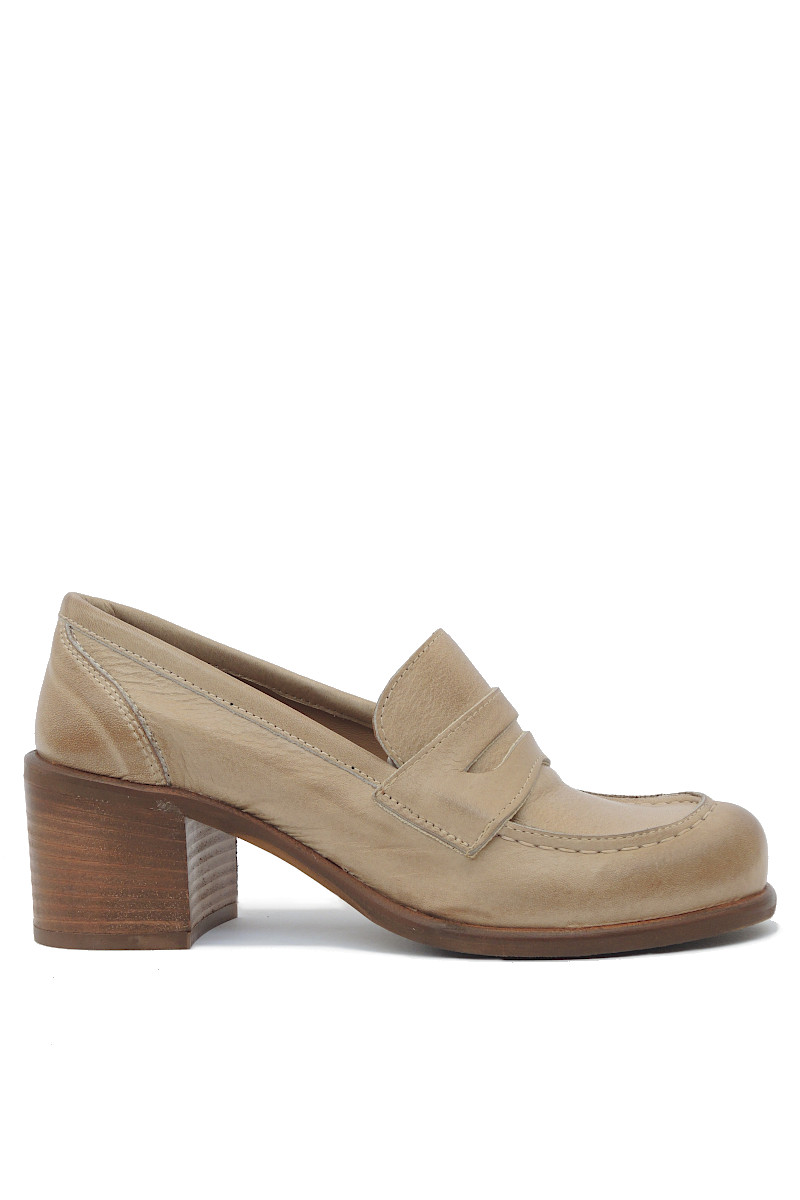 Mocassino tacco 60 con tomaia in pelle color taupe.