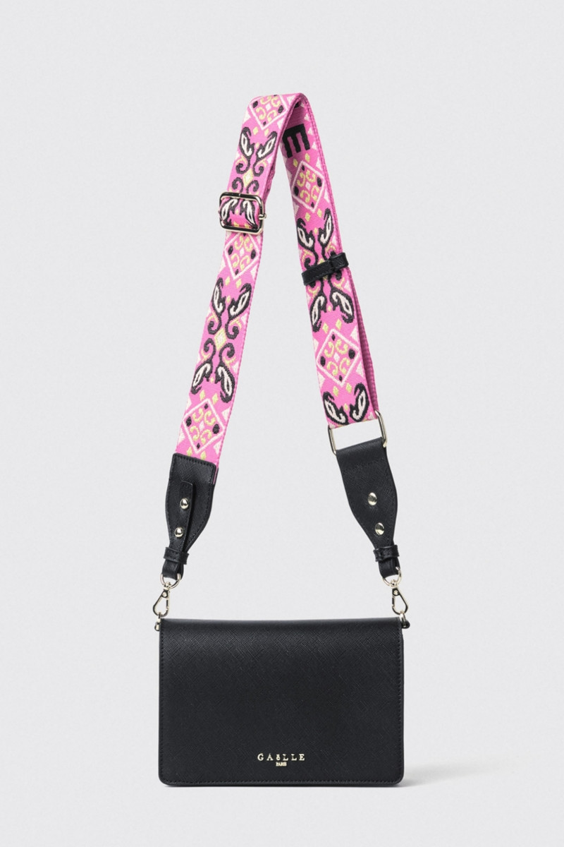 Semplice e sempre di tendenza, questa borsa tracolla Gaelle Paris dal design minimal e giovanile. Realizzata in simil pelle lavorazione saffiano color bianco e nero. La particolarità sta nella tracolla in tessuto jacquard fucsia che dona quel tocco sportivo che serve. Misure: 21x14x4 cm