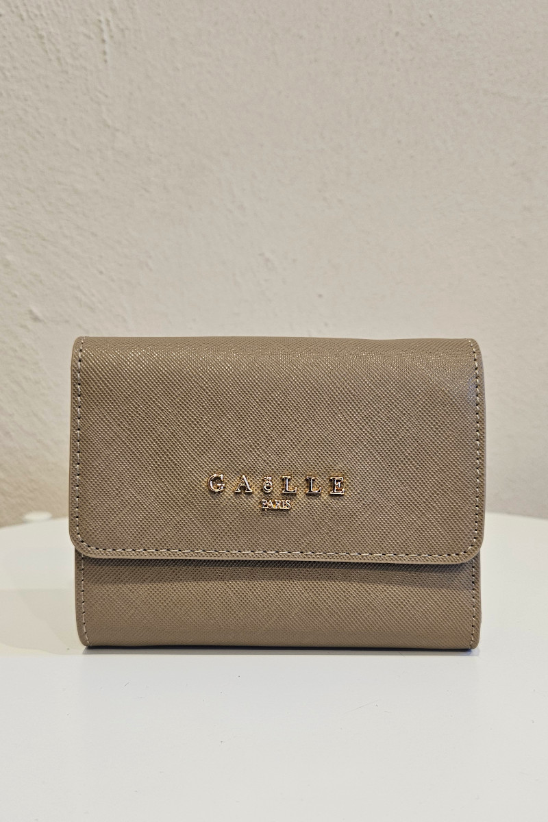 Portafoglio con bottone Gaelle Paris in ecopelle saffiano con logo in metallo. Portafoglio piccolo da donna con apertura a libro e piccola tasca interna per monete.