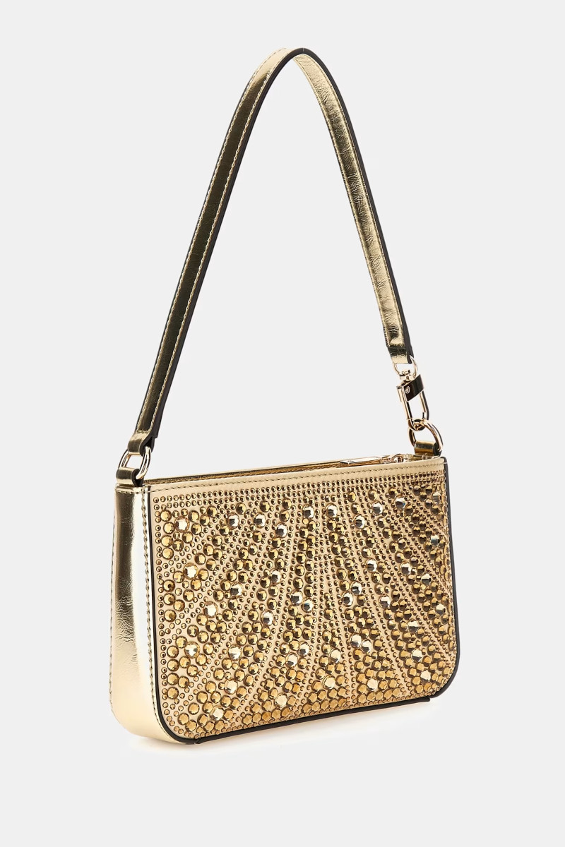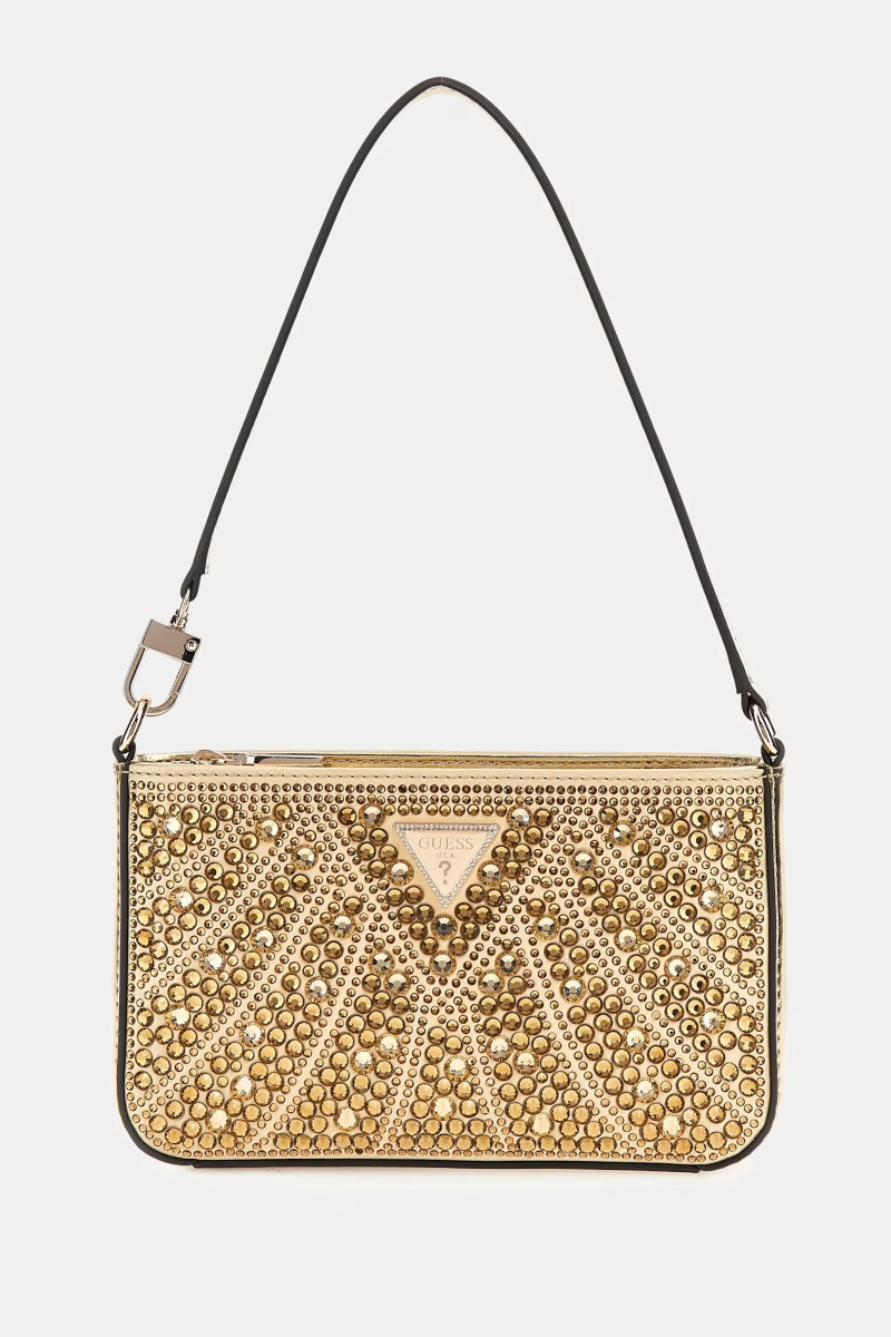 Borsa super elegante Guess linea Beauvoir ricoperta da brillantini. Borsa gioiello perfetta per cerimonie ed occasioni importanti. Chiusura con cerniera e triangolo logo con strass frontale. Misure: 22x14x4 cm
