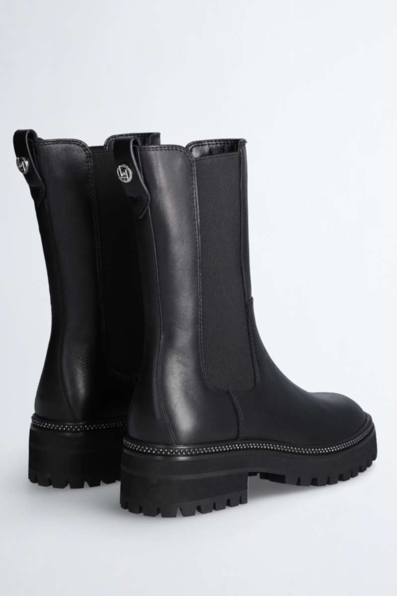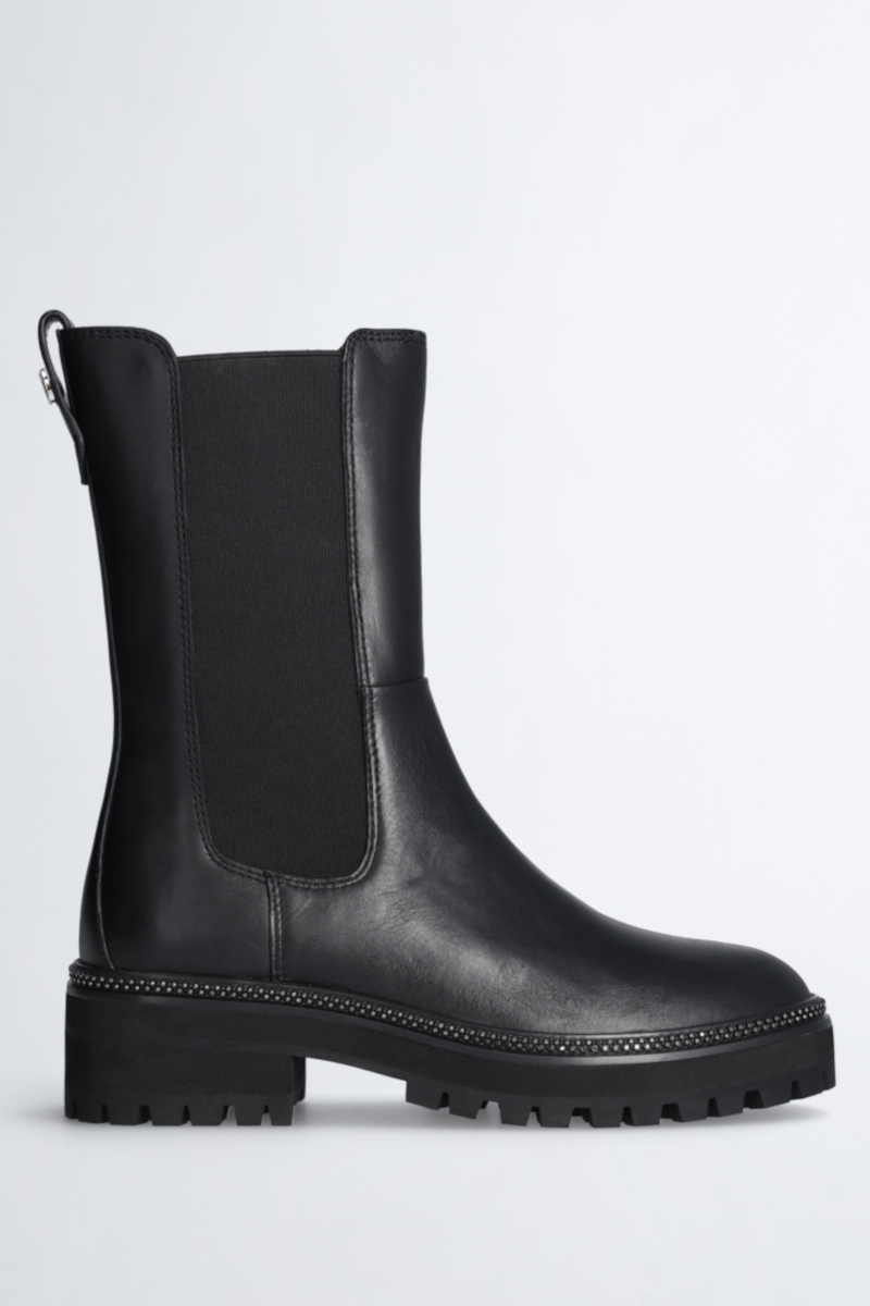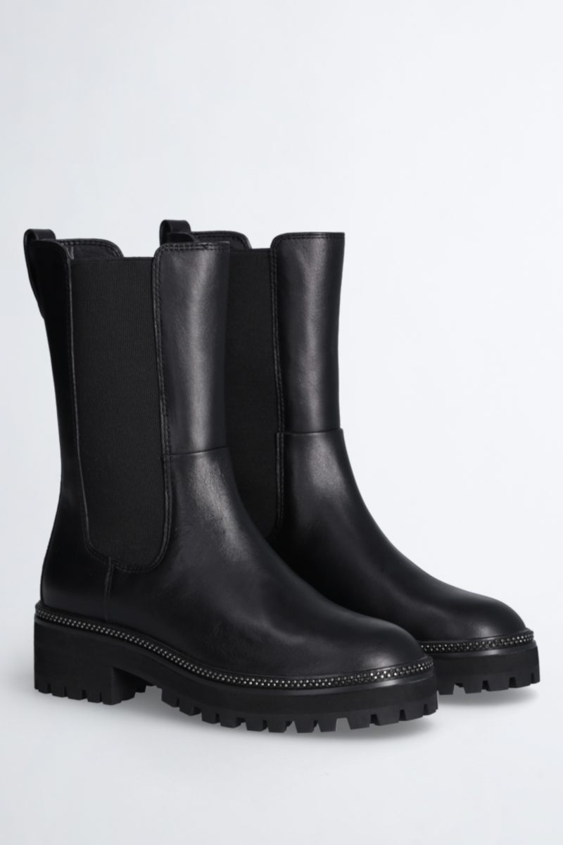 Beatles donna Liu Jo in vera pelle color Nero. Inserti elastici sui lati e loop in pelle che ne facilita la calzata. Comoda suola dentellata. Micro strass applicati sul fondo. Stivaletto con elastici misura media, altezza gambale: 21 cm.