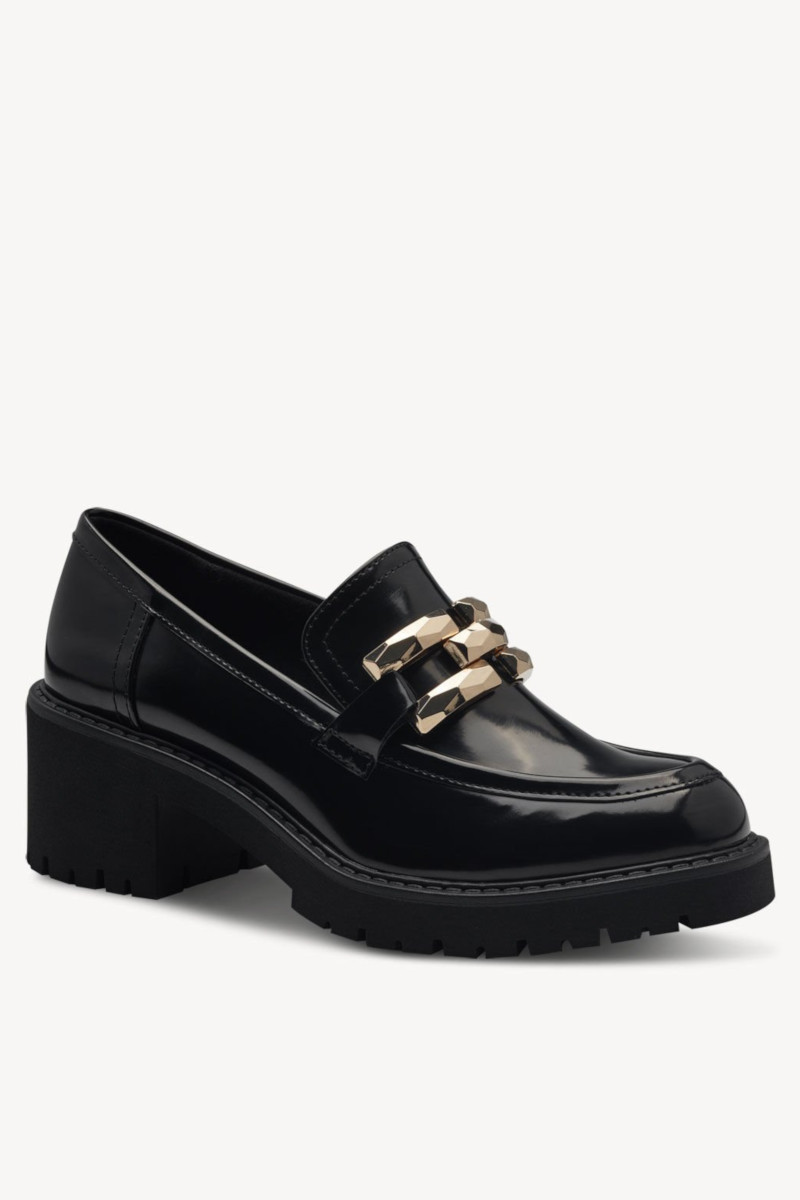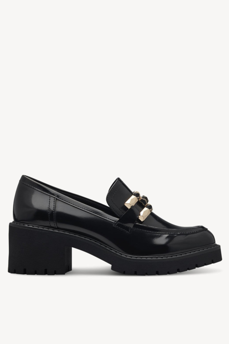 Un mix di stili per questo mocassino con suola alta in gomma. Questo mocassino di Marco Tozzi รจ realizzato in simil pelle ludica color nero ed รจ impreziosito da morsetto oro. Una scarpa che si abbina perfettamente ad ogni outfit. Elegante ma non troppo, sarร perfetto con ogni outfit. Comodo sottopiede imbottito per garantire la massima comoditร . Tacco 6,5 cm Plateau 2cm