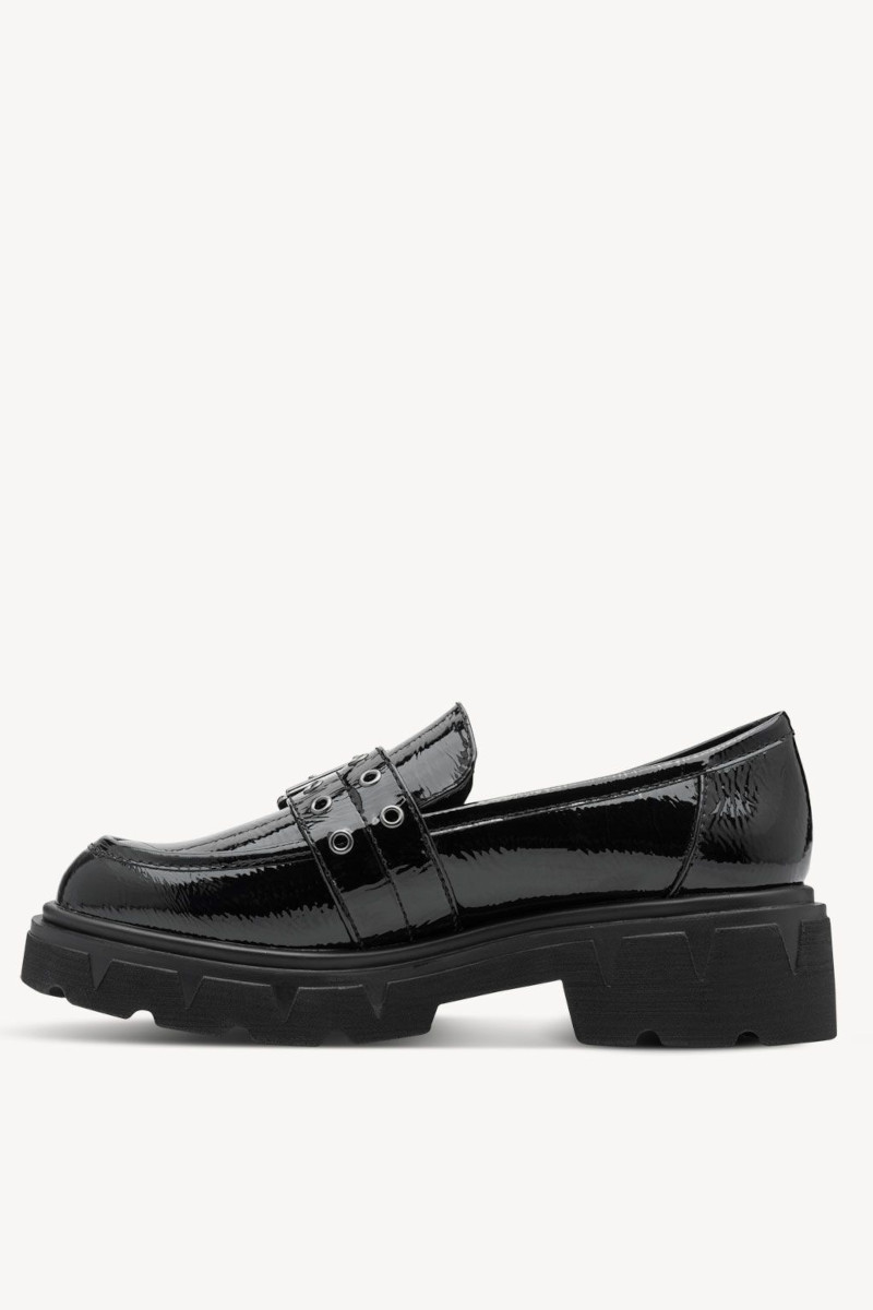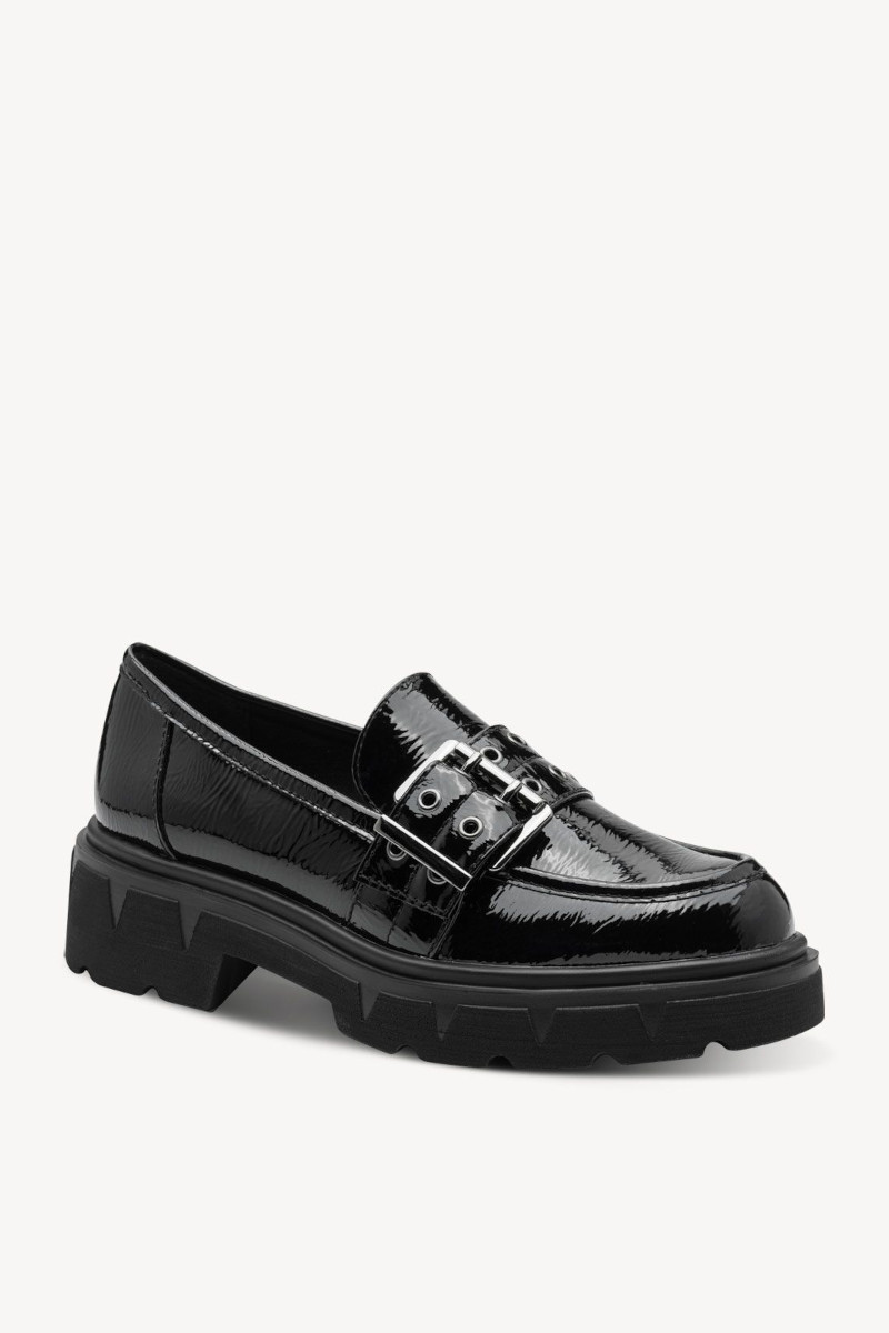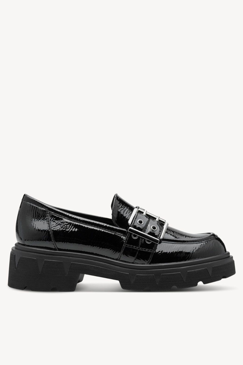 Mocassino in vernice lucida con fibbia. Mocassino Marco Tozzi con suola alta carrarmata perfetta per la stagione fredda e piovosa. Splendida con abbigliamento casual, per valorizzare ogni tuo outfit.