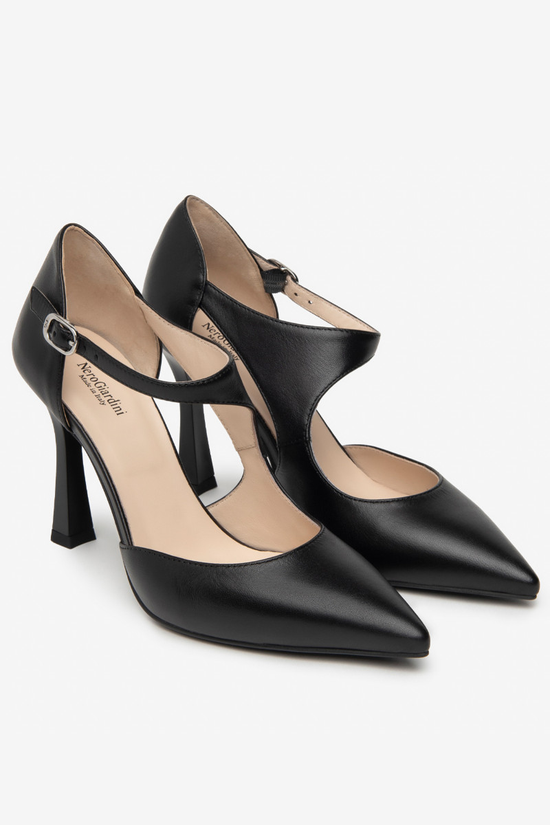 Decoltè NeroGiardini donna con cinturino sul collo del piede per garantire la massima comodità di calzata. Dècolletè realizzata con ottimi pellami Made in Italy. Suola in gomma. Tacco a rocchetto 9,5 cm.