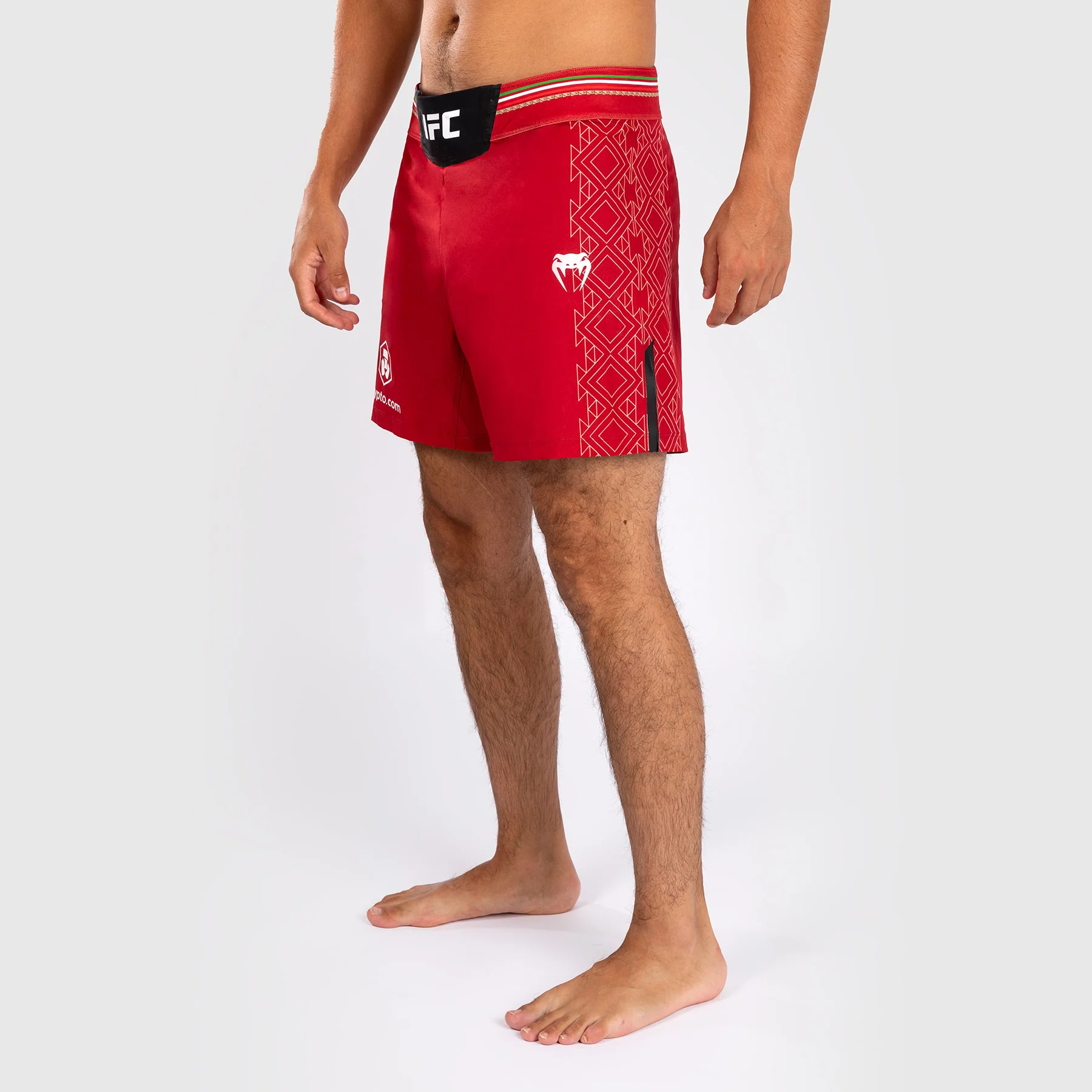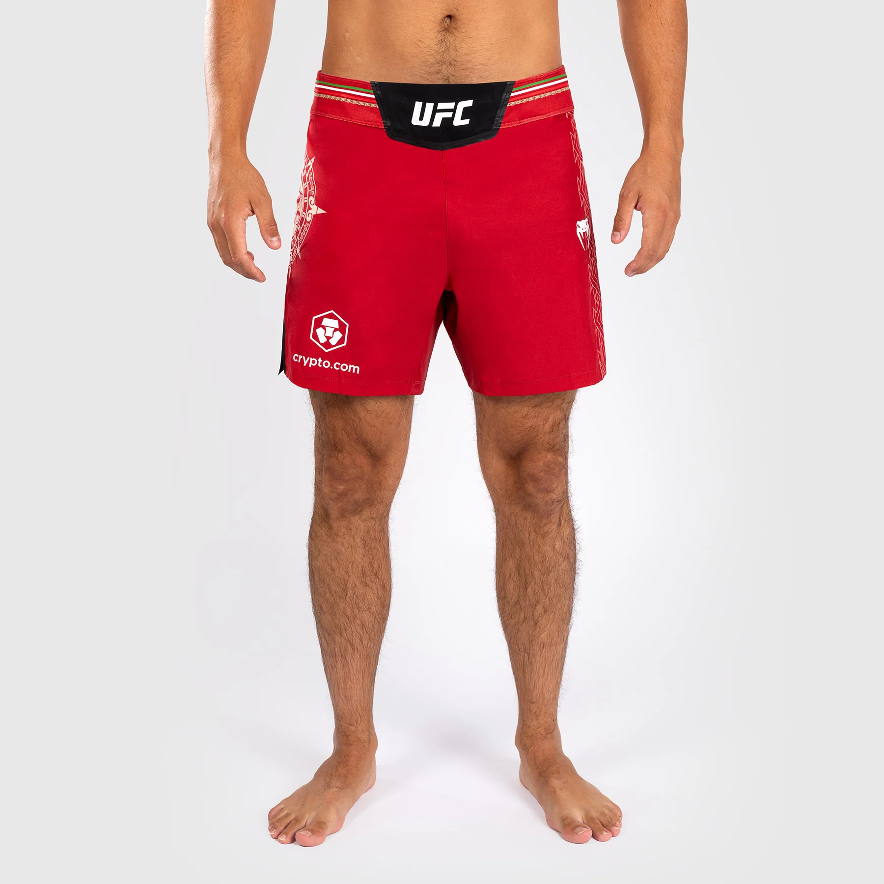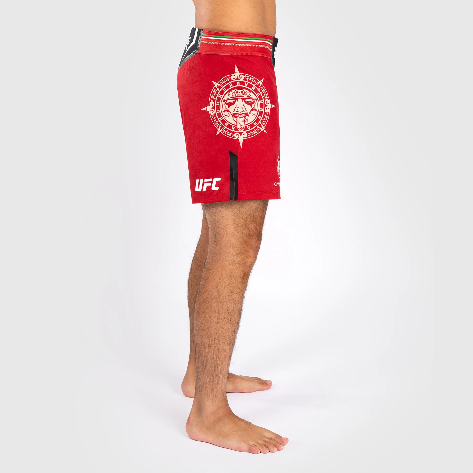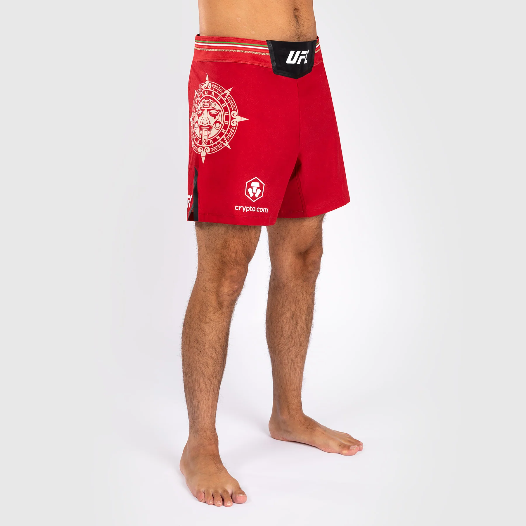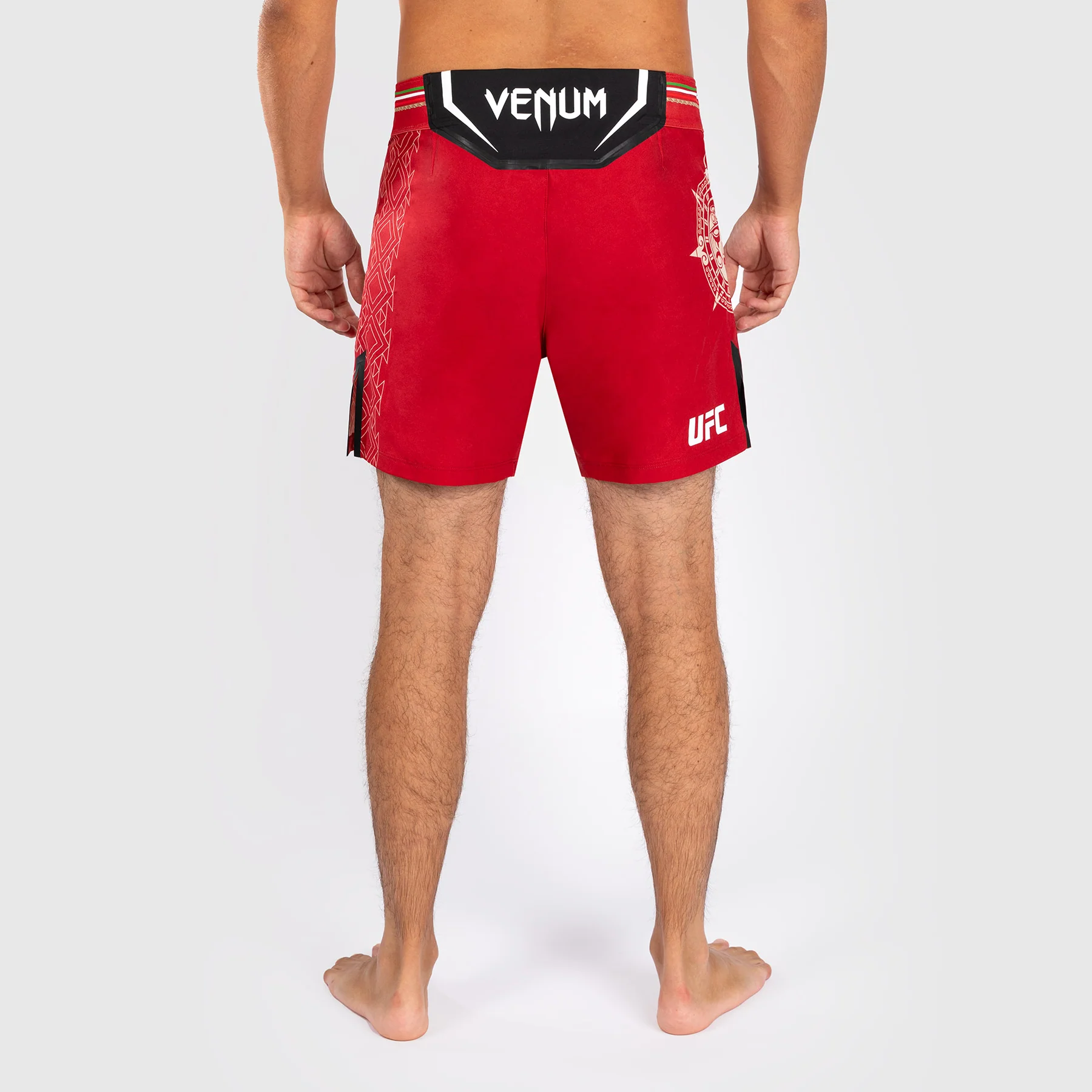 I pantaloni da combattimento Noche UFC di Venum Authentic Fight Night da uomo – Short Fit in Rosso presentano la grafica di una pietra solare, mostrando il complesso copricapo Tลnatiuh, la divinitร azteca del giorno e della notte.