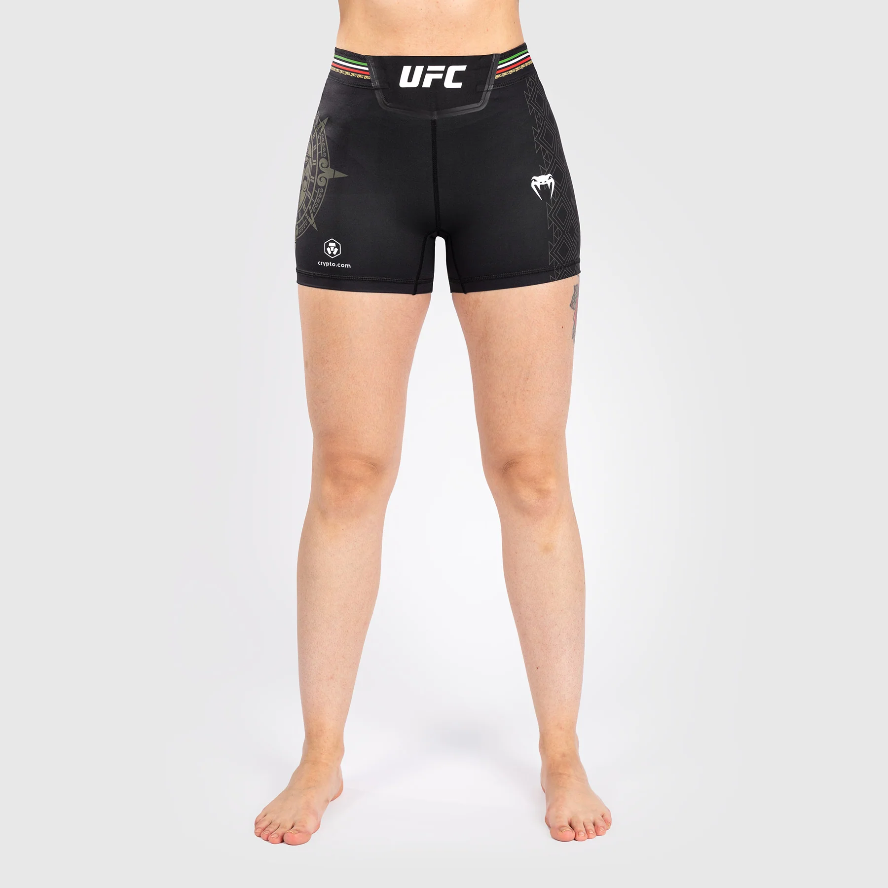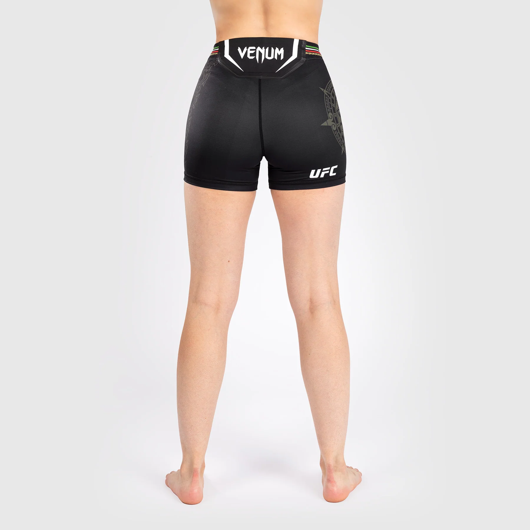 Il Noche UFC by Venum Authentic Fight Night Womenโs Vale Tudo Short – Short Fit in Black presenta la grafica di una pietra solare che mostra l’intricato Tลnatiuh, l’entitร azteca del giorno e della notte.