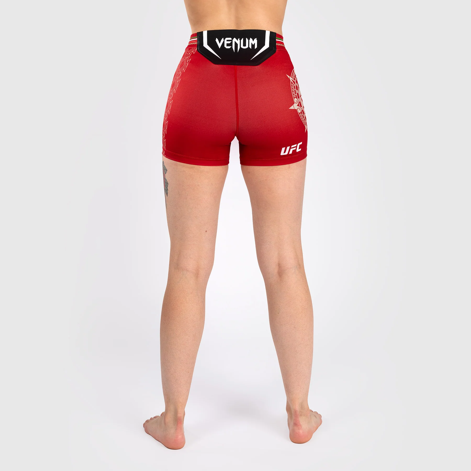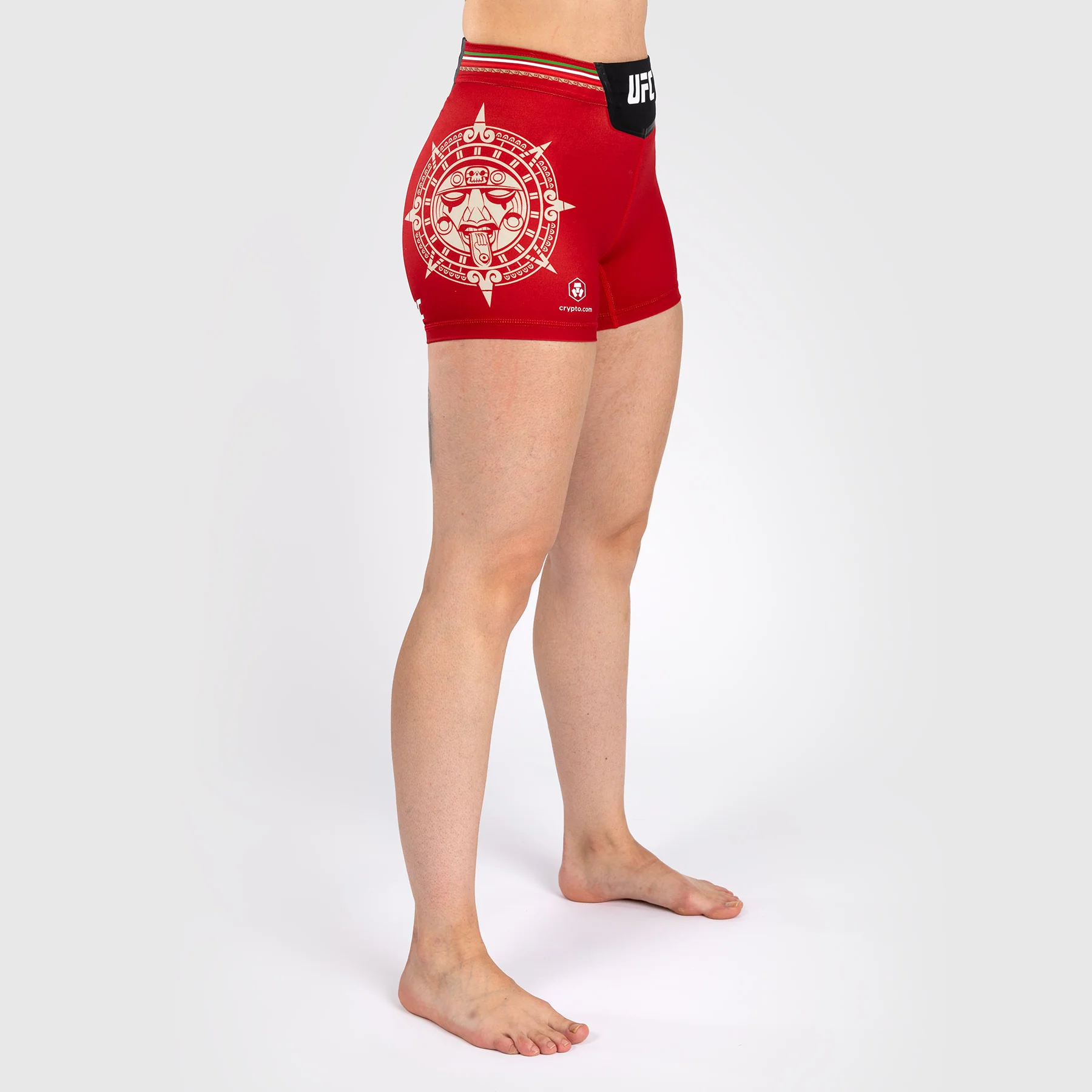 Il Noche UFC di Venum Authentic Fight Night Vale Tudo Womenโs Short – Short Fit in Rosso presenta la grafica di una pietra solare, mostrando l’intricata testa Tลnatiuh, la divinitร azteca del giorno e della notte.