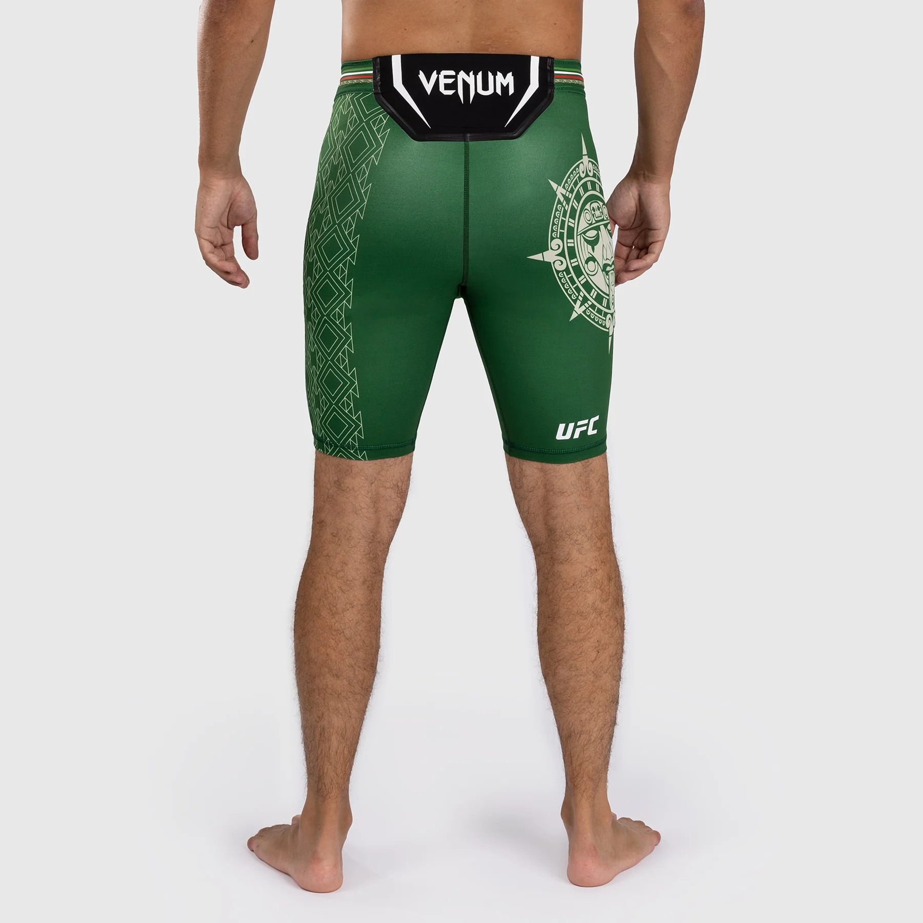 Il Noche UFC by Venum Authentic Fight Night Menโs Vale Tudo Short in Verde presenta la grafica di una pietra solare, che mostra l’intricato copricapo Tลnatiuh, la divinitร azteca del giorno e della notte.