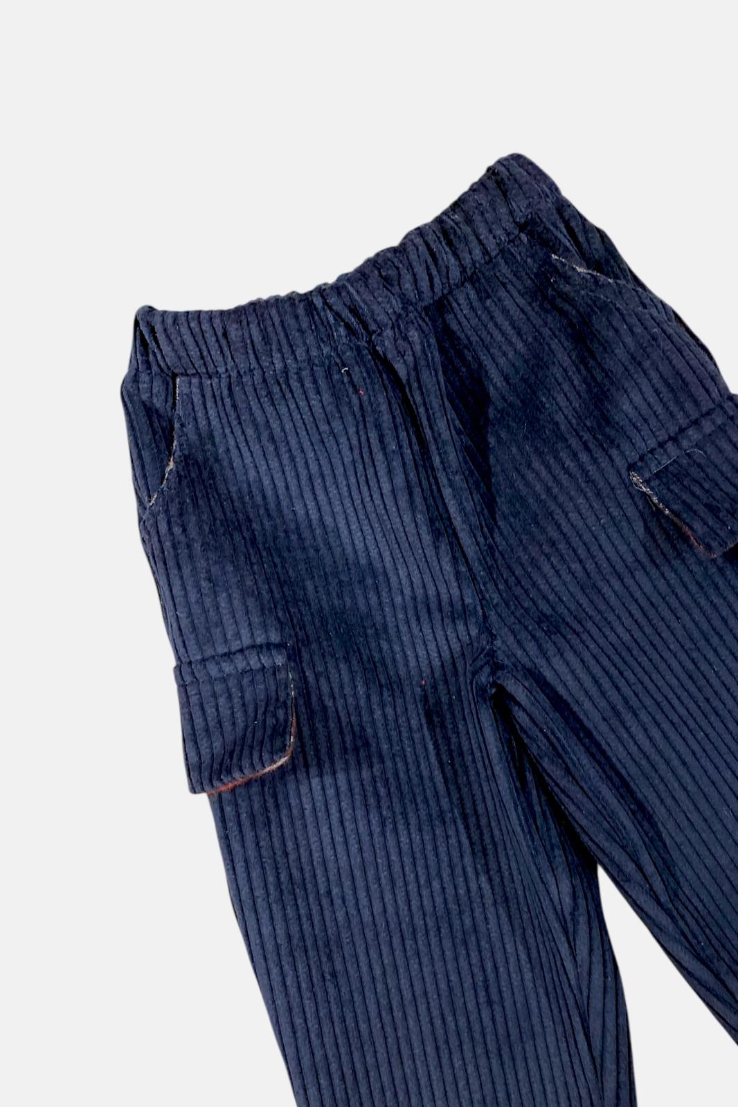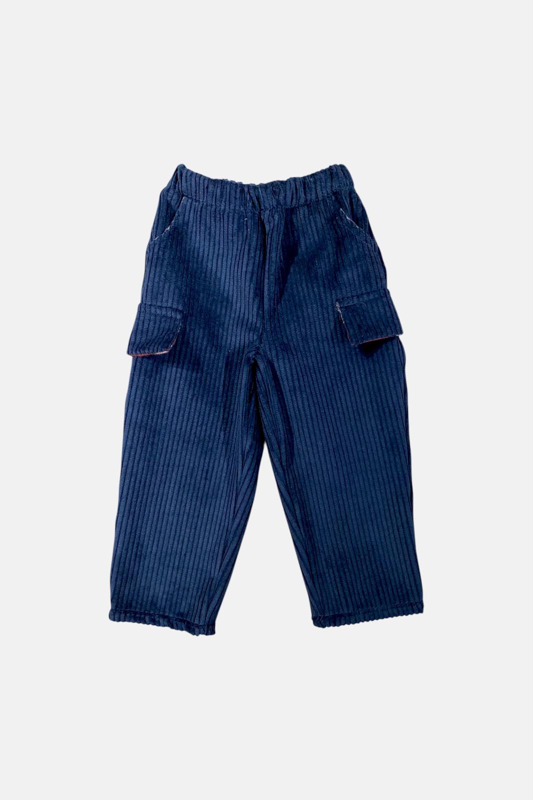 Pantaloni lunghi slim in velluto a coste blu ideati e realizzati da Kiki&Isa. Questo modello della linea Sartini รจ caratterizzato da: