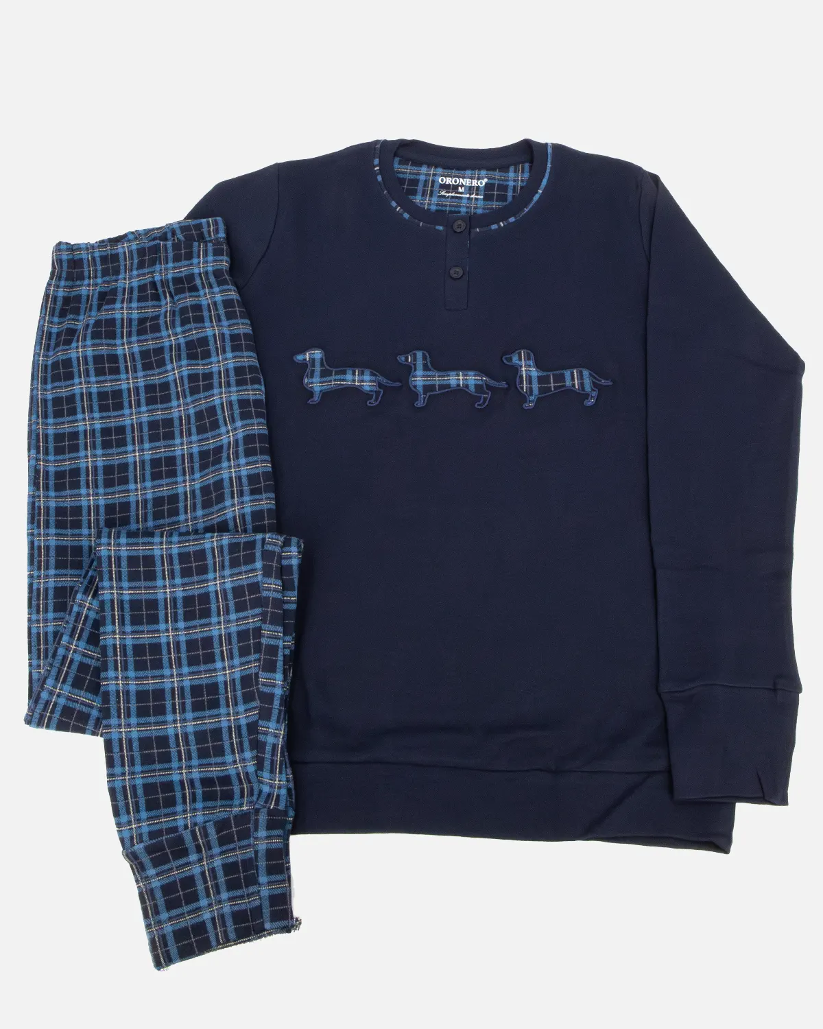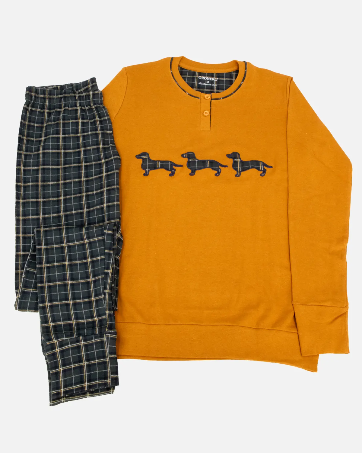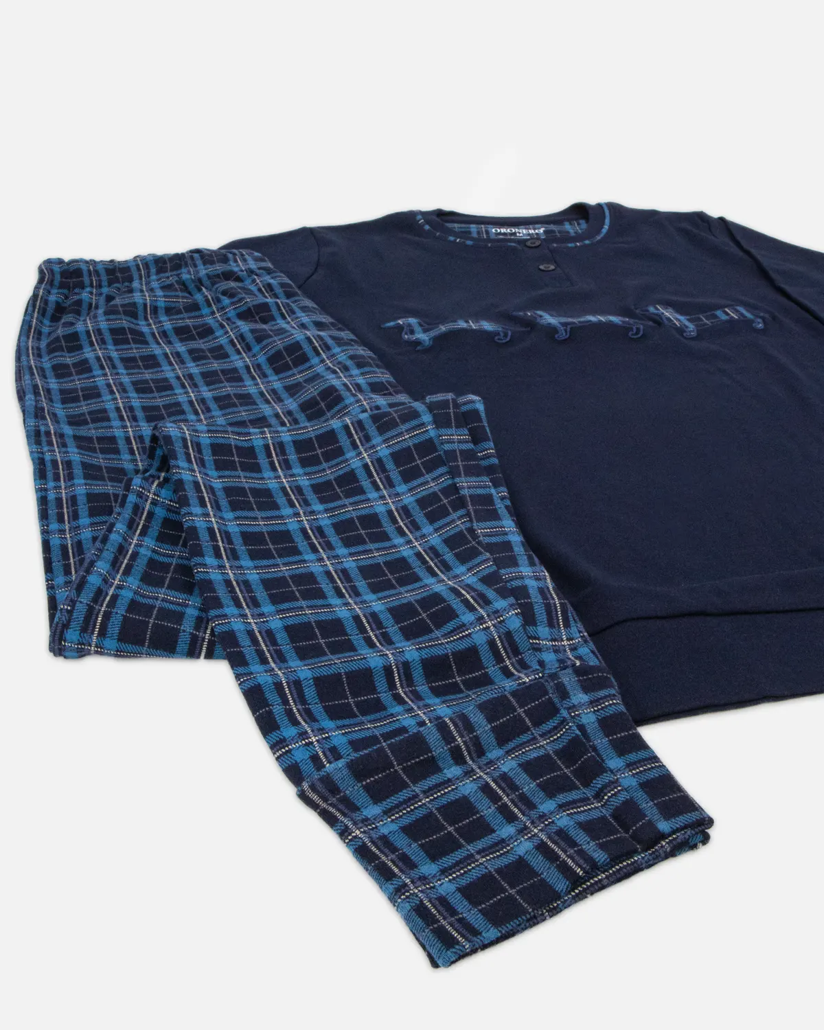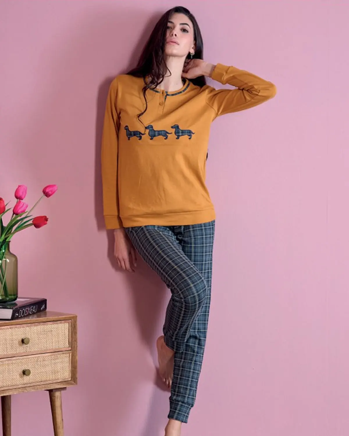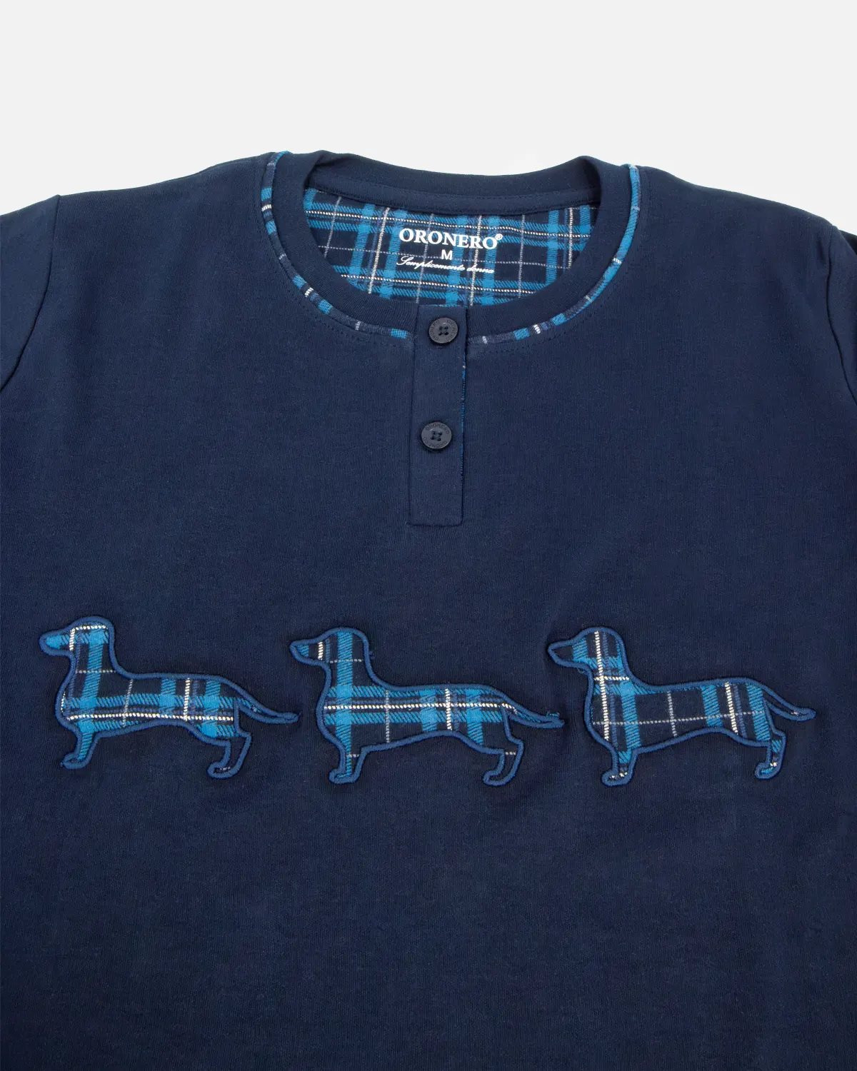 Pigiama da donna in cotone Interlock Oroneroยฎ Morbida maglia in tinta unita con bassotti ricamati, scollo 2 bottoni, polsini e fascia in vita Pantalone stampa quadri con polsino Taglie: M-L-XL-XXL Tessuto: 100% cotone