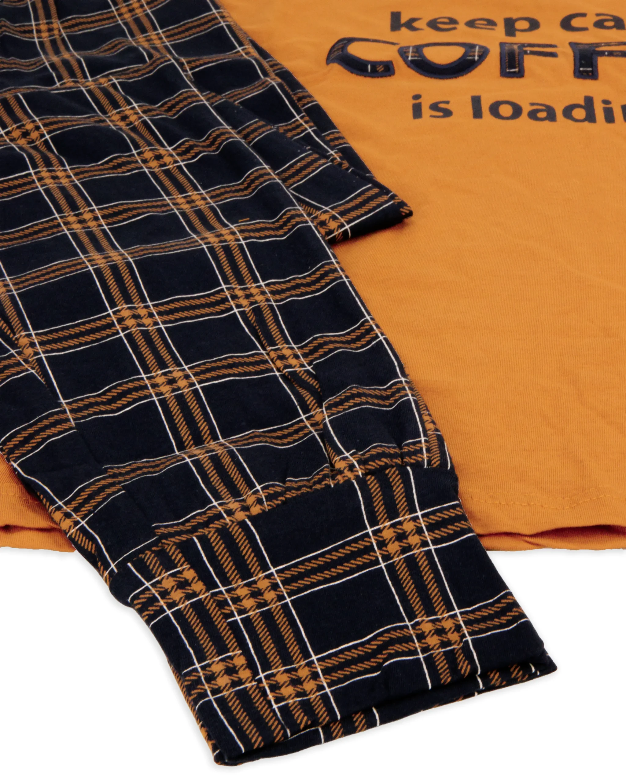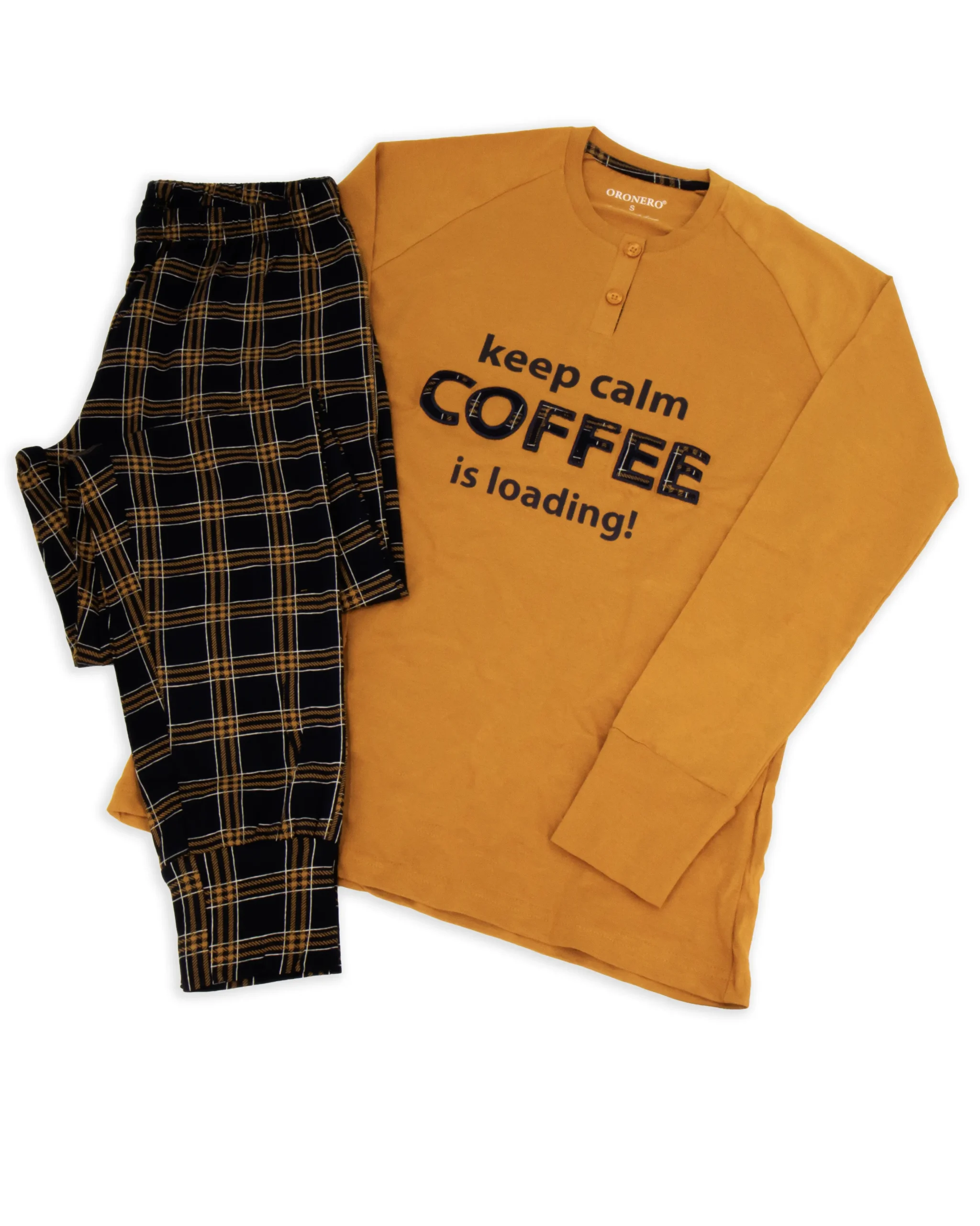 Pigiama da donna in cotone Oroneroยฎ Morbida maglia in tinta unita con scritta frontale. Maniche con polsini Pantalone stampa quadri con polsino Taglie: S-M-L-XL Tessuto: 100% cotone