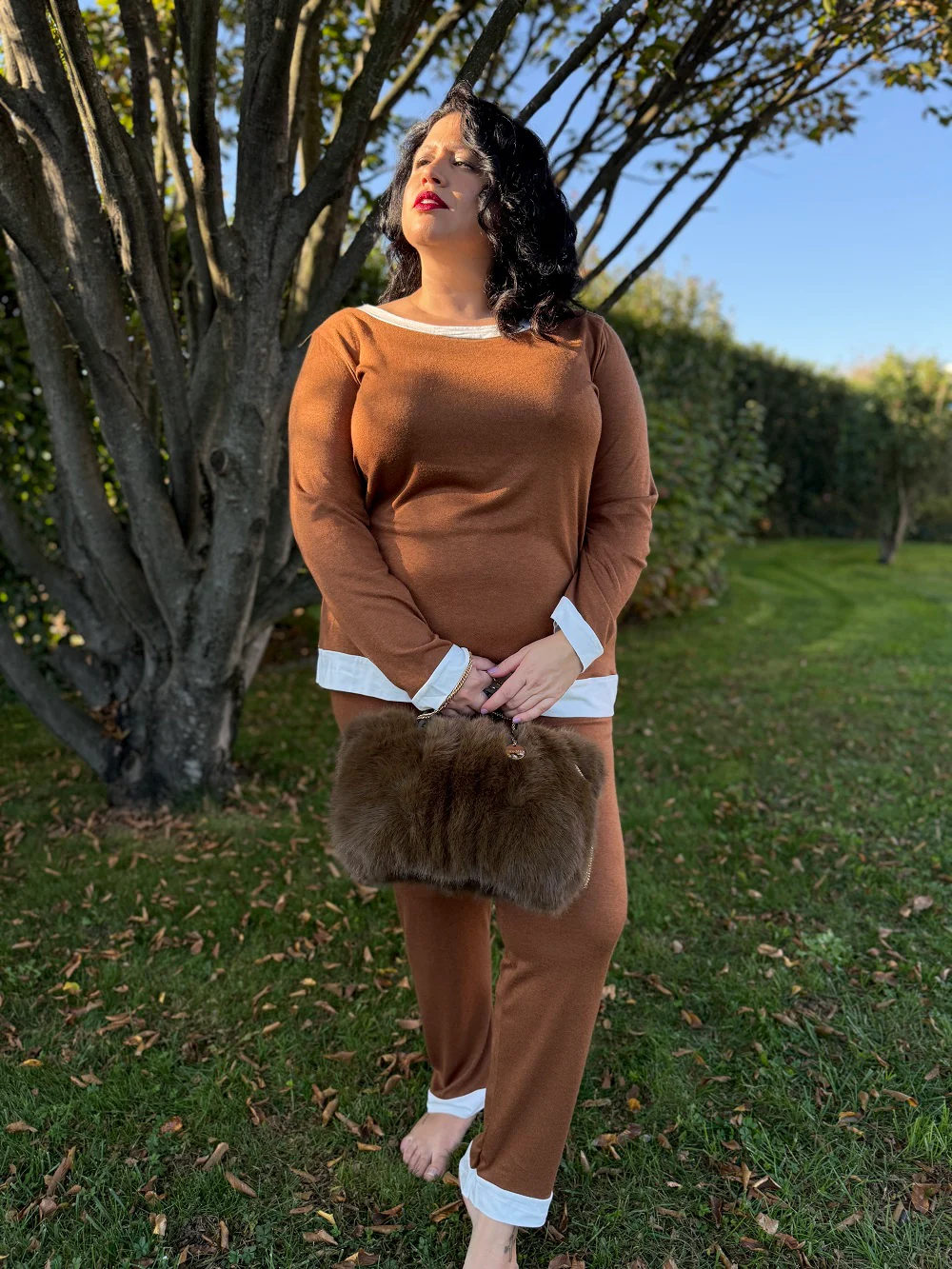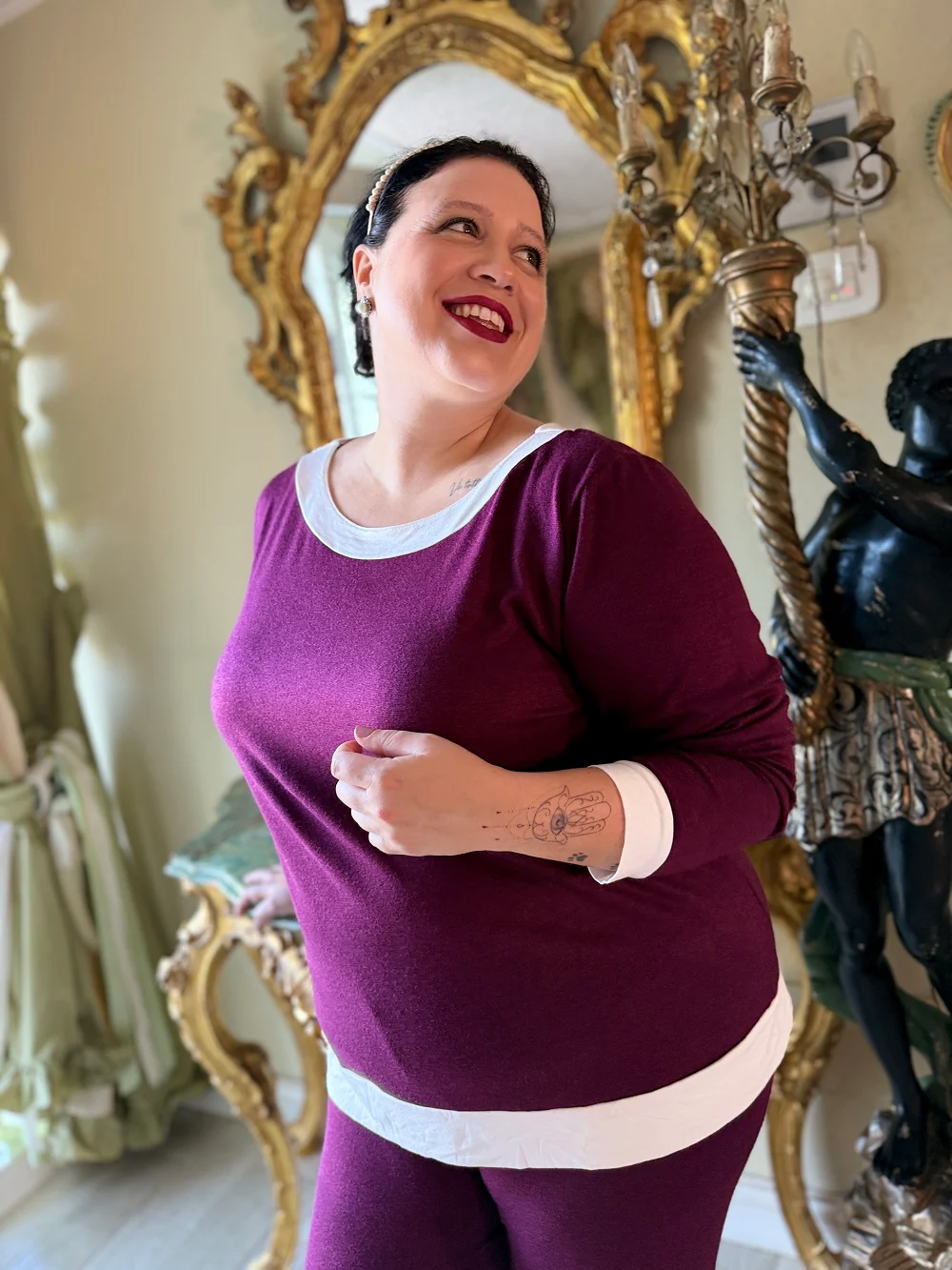 Pigiama di nostra esclusiva produzione interamente realizzato in italia.Il tessuto principale รจ in maglia, calda ed avvolgente in misto cachemire. I bordi che la contornano sono a contrasto in pura viscosa.Lo stile unico e minimal di questo capo lo rendono perfetto anche come homewear, ideale per chi ama stare in casa comode eleganti e calde.Il pantallone cade con un taglio dritto lungo la gamba slanciando la figura.I colori utilizzati per tingere questi capi sono tinture reattive quindi non stingono. si consiglia il lavaggio a mano Composizione: 60% viscosa 8% cachemire 32%polyestereLa modella indossa una tg XXL(50-52)