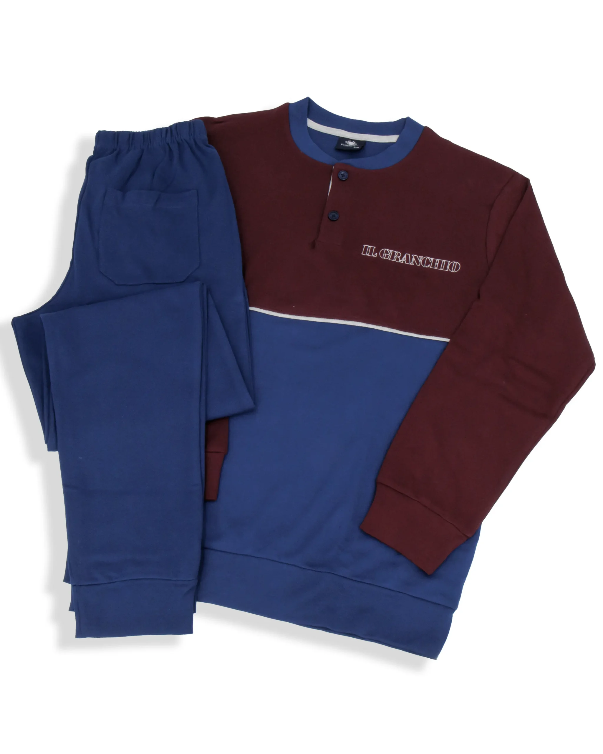 Pigiama in cotone interlock Il GranchioยฎPerfetto per la stagione autunno/inverno รจ morbido al tattoPantalone tinta unita con polsiniMaglia tinta unita, fascia in vita e maniche con polsini Taglie: S-M-L-XL-XXLColori: Blu, Bordeaux