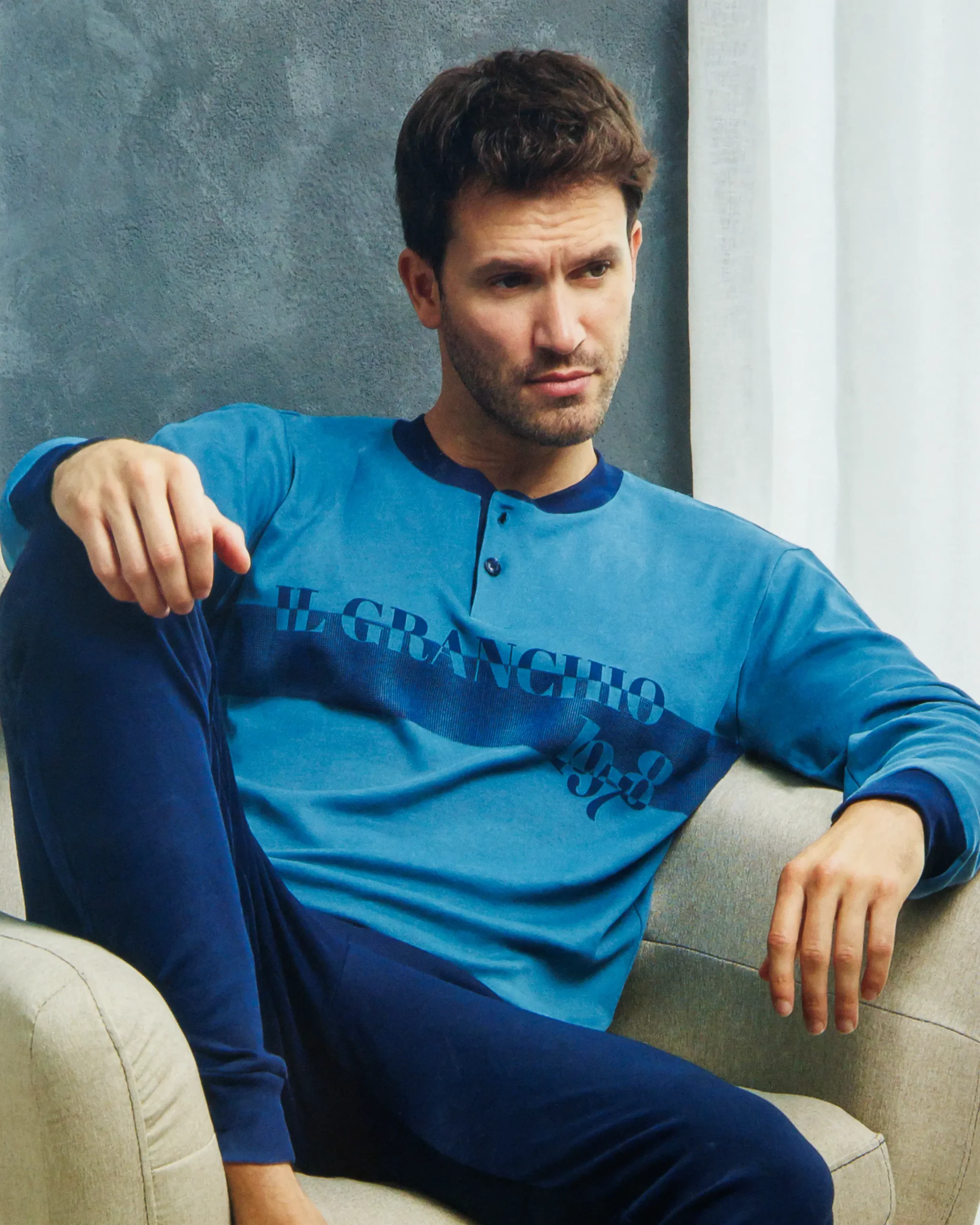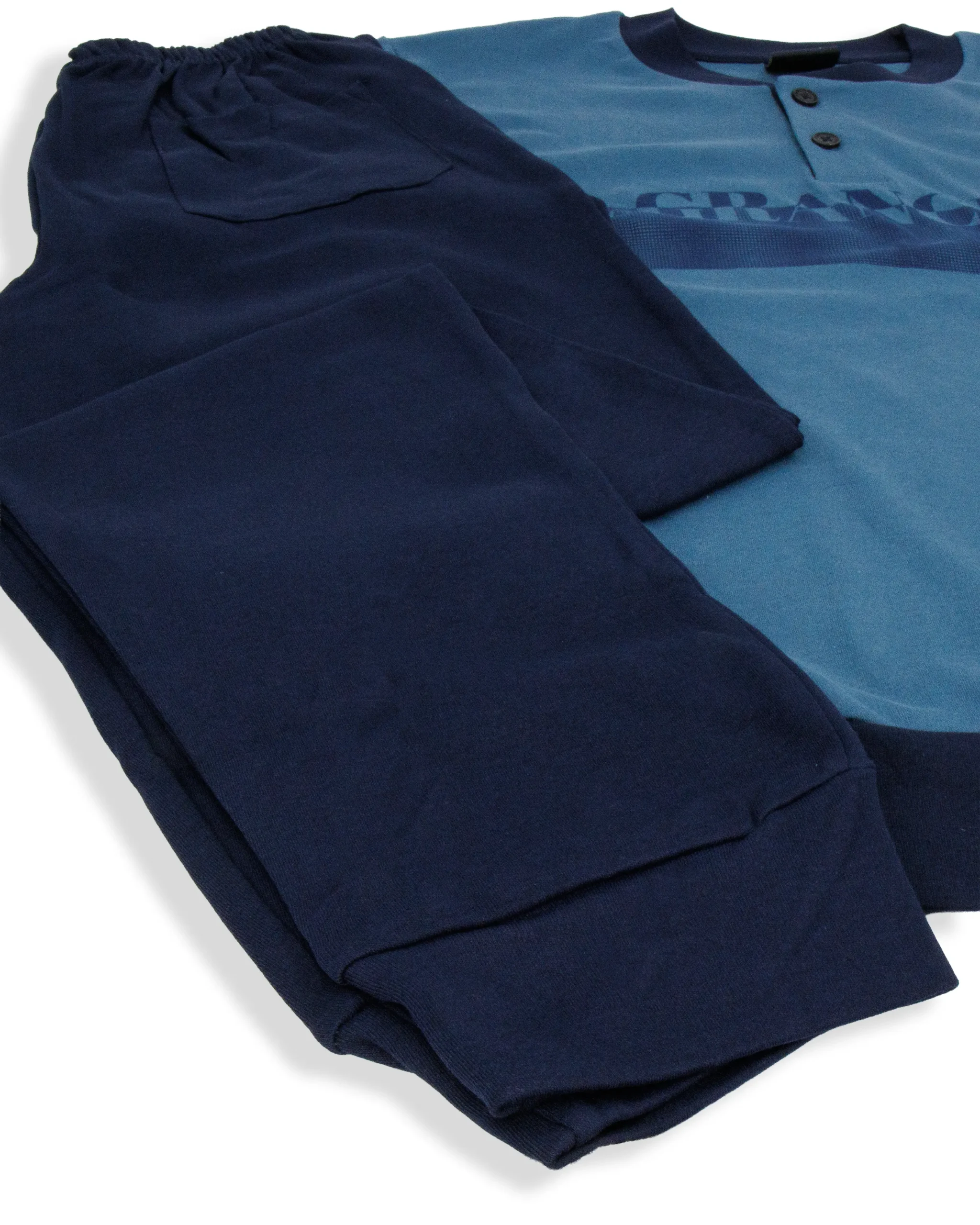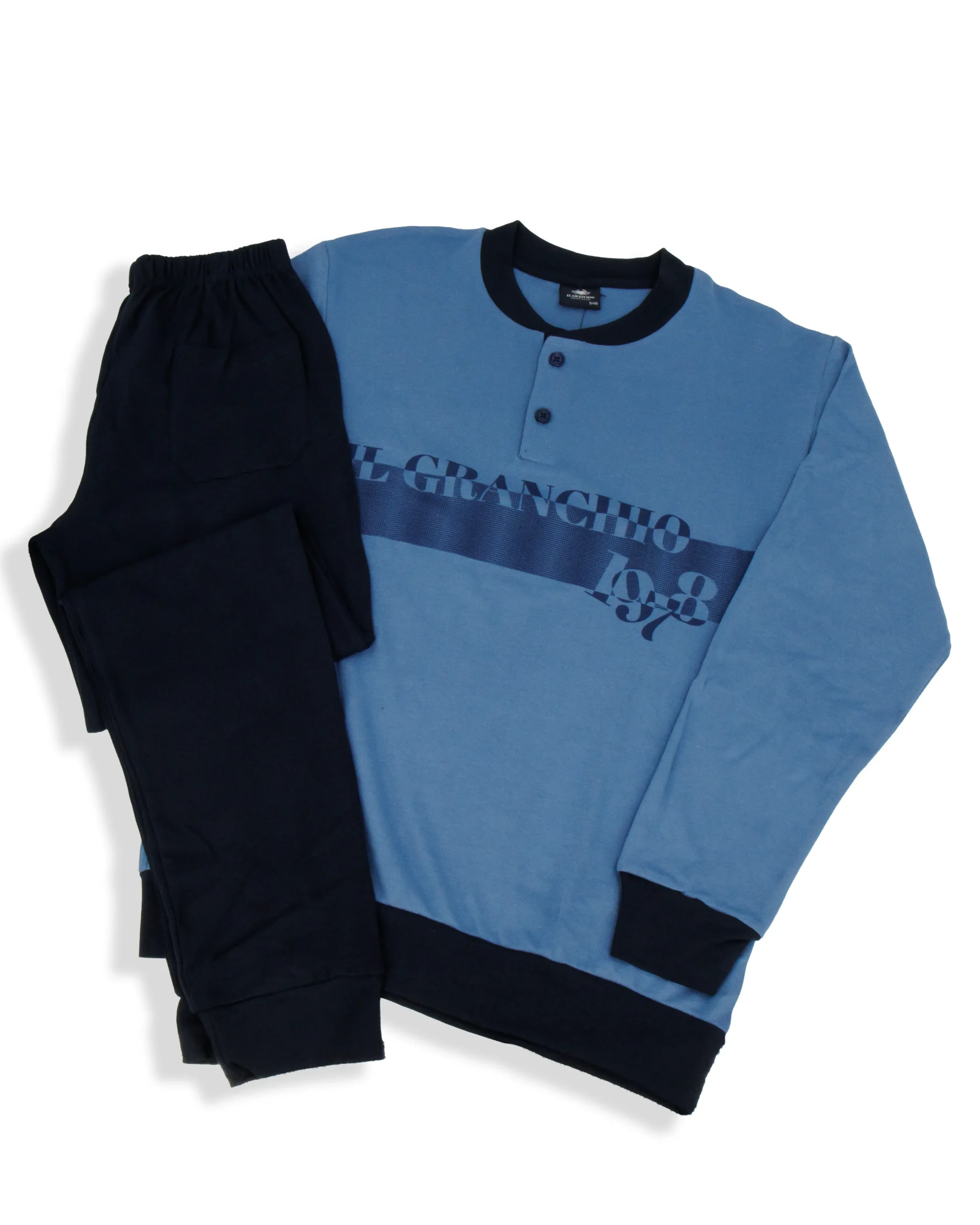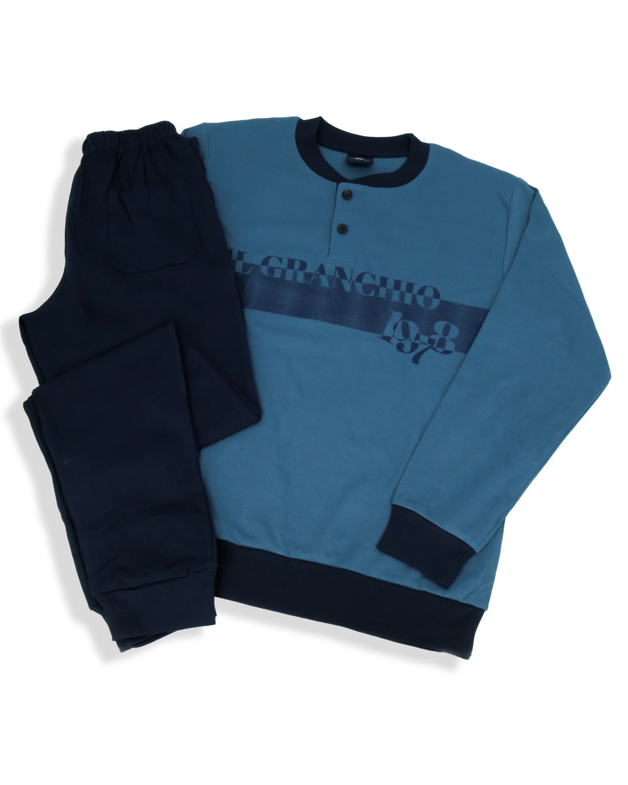 Pigiama in cotone interlock Il GranchioยฎPerfetto per la stagione autunno/inverno รจ morbido al tattoPantalone tinta unita con polsiniMaglia tinta unita, fascia in vita e maniche con polsini Taglie: S-M-L-XL-XXLColori: Petrolio, Avio