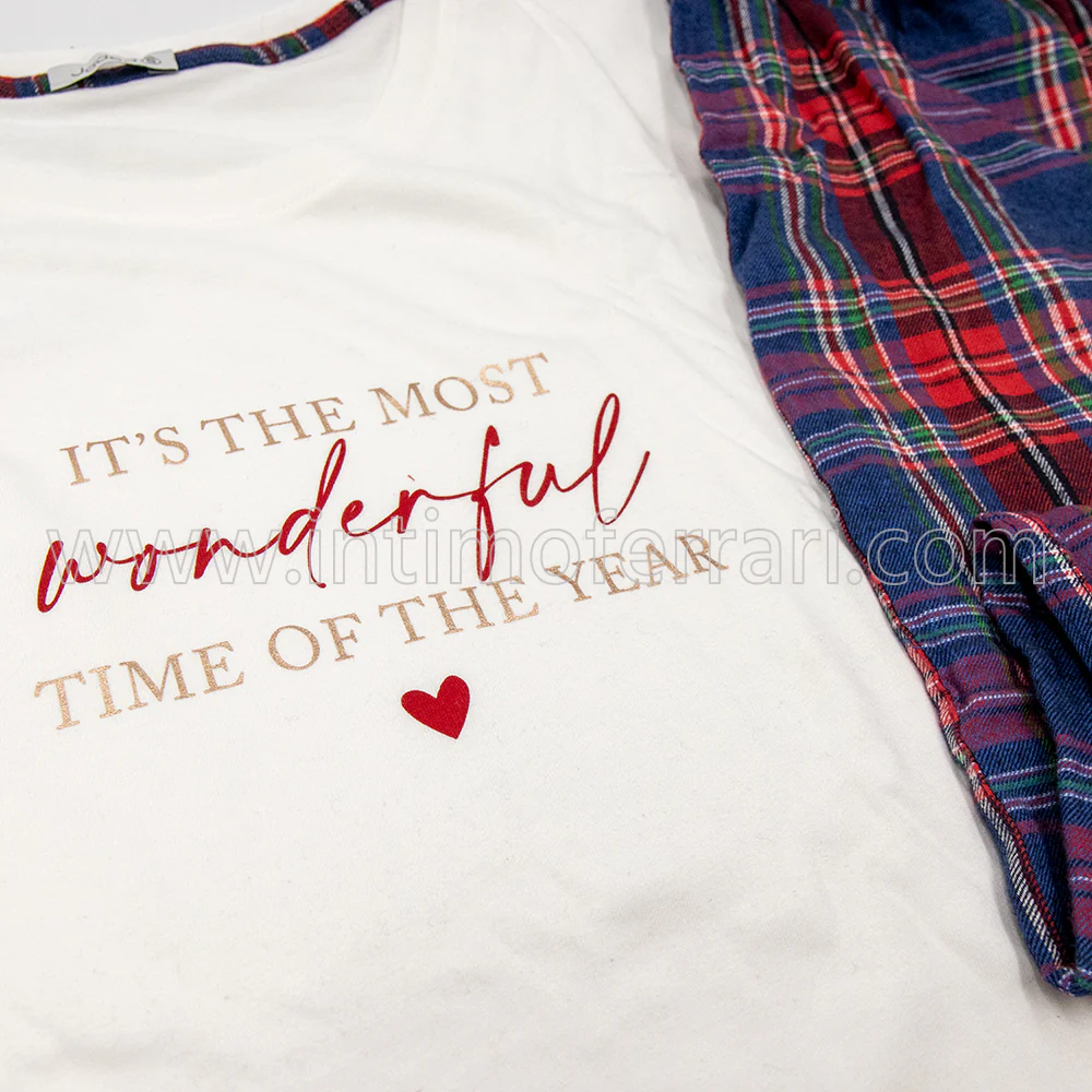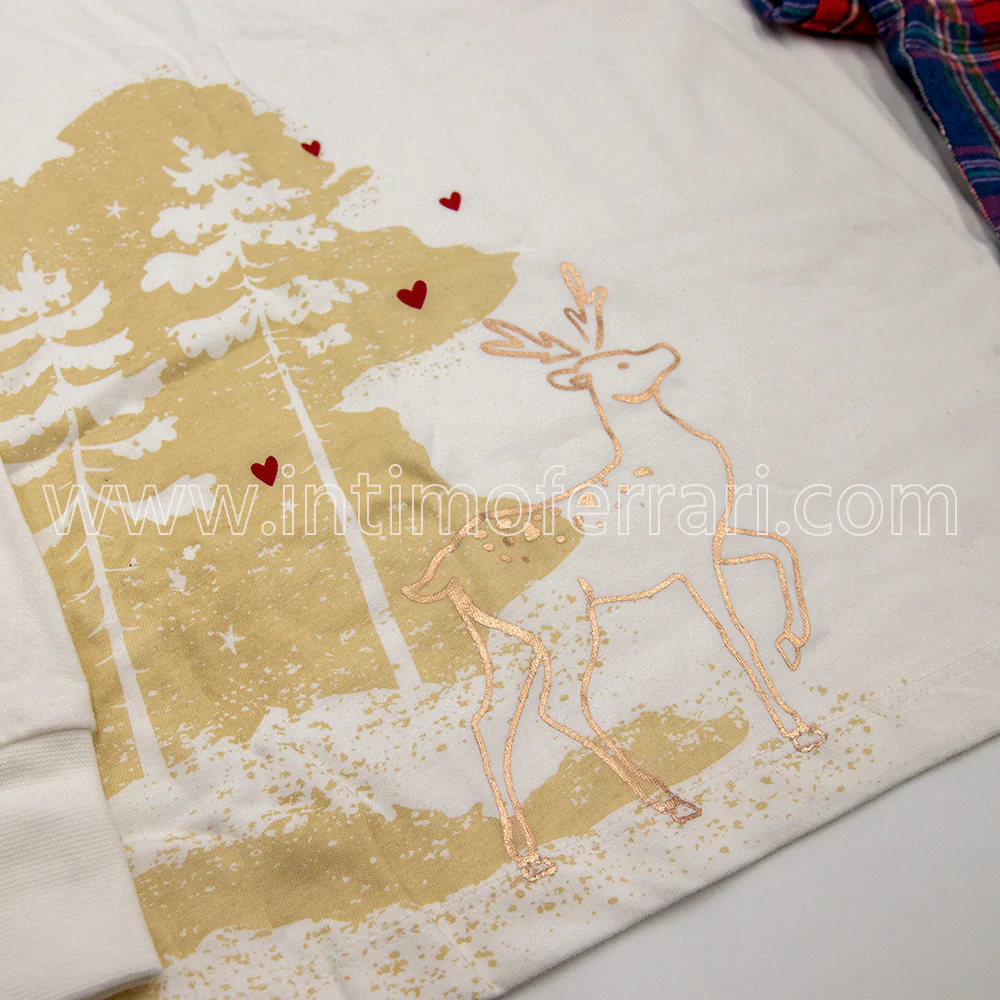 Pigiama composto da maglia realizzata in jersey di cotone carbon brushed che presenta una stampa natalizia sul davanti, girocollo, manica lunga con polsini , il pantalone lungo abbinato รจ realizzato in tessuto di calda flanella tinto filo fantasia scozzese.
