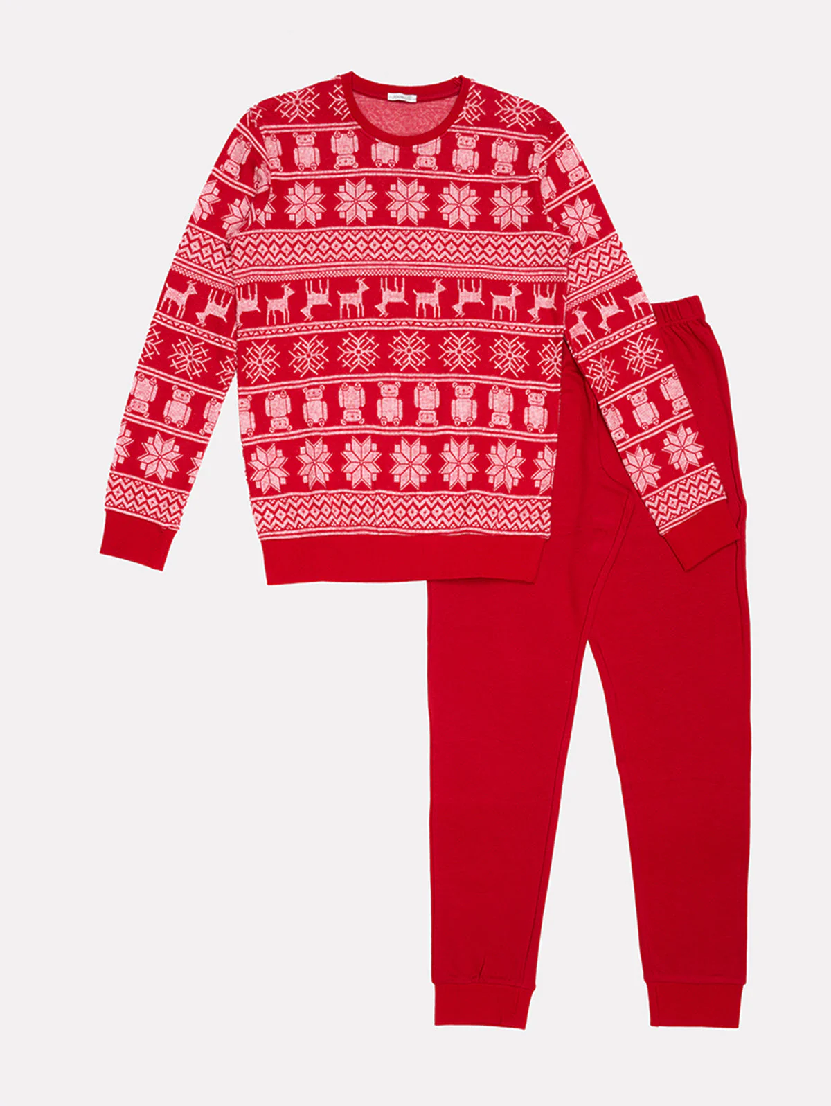 Pigiama realizzato in caldo e soffice tessuto Punto Milano garzato, maglia girocollo disegno natalizio, manica e fondo maglia con polso in costina , pantalone lungo in interlock di cotone in colore abbinato con polso al fondo. Taglie: S-M-L-XLColori: Rosso