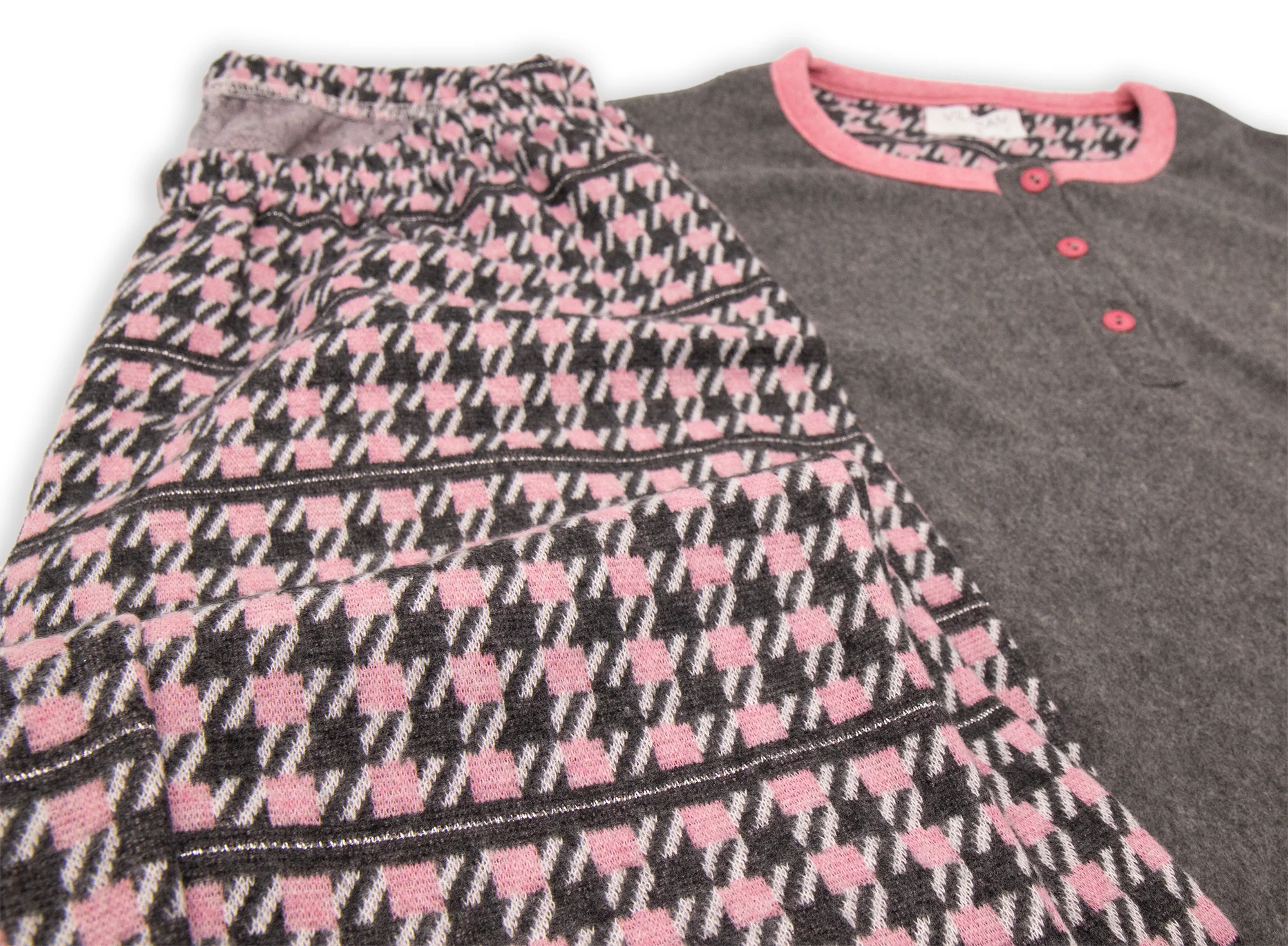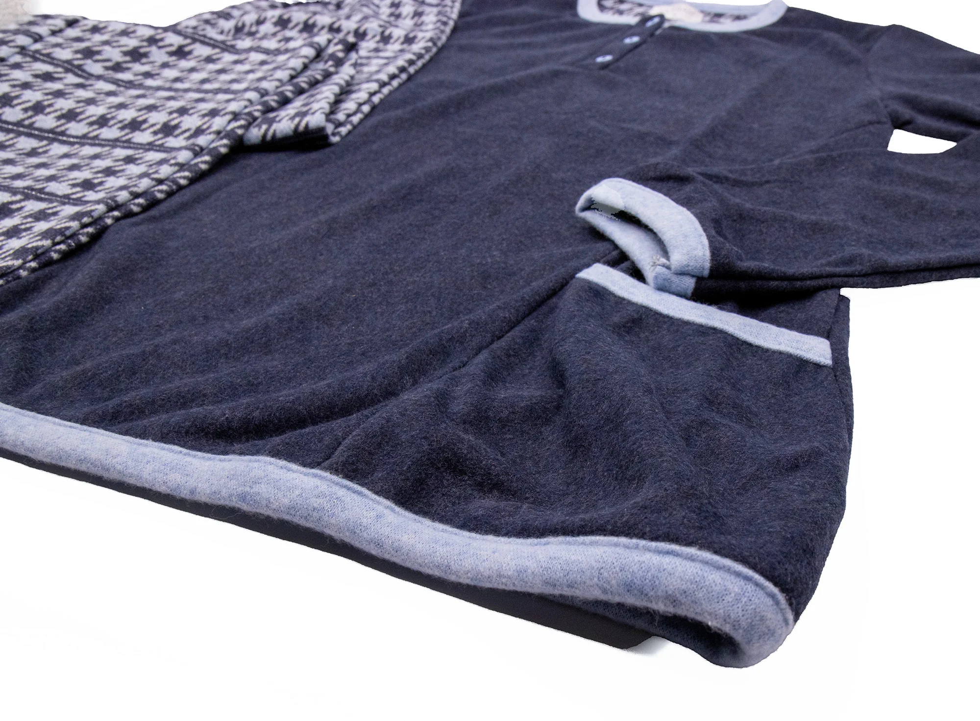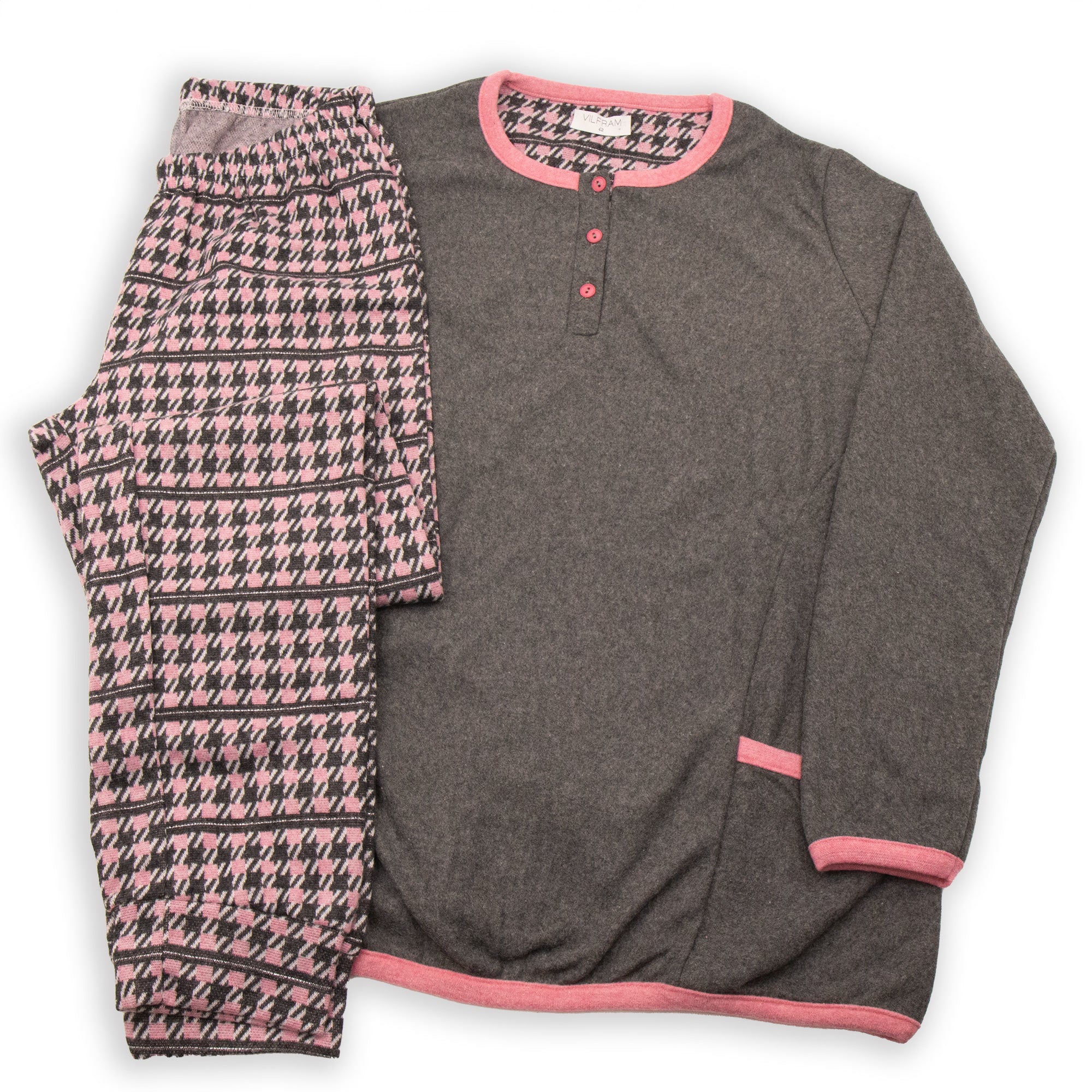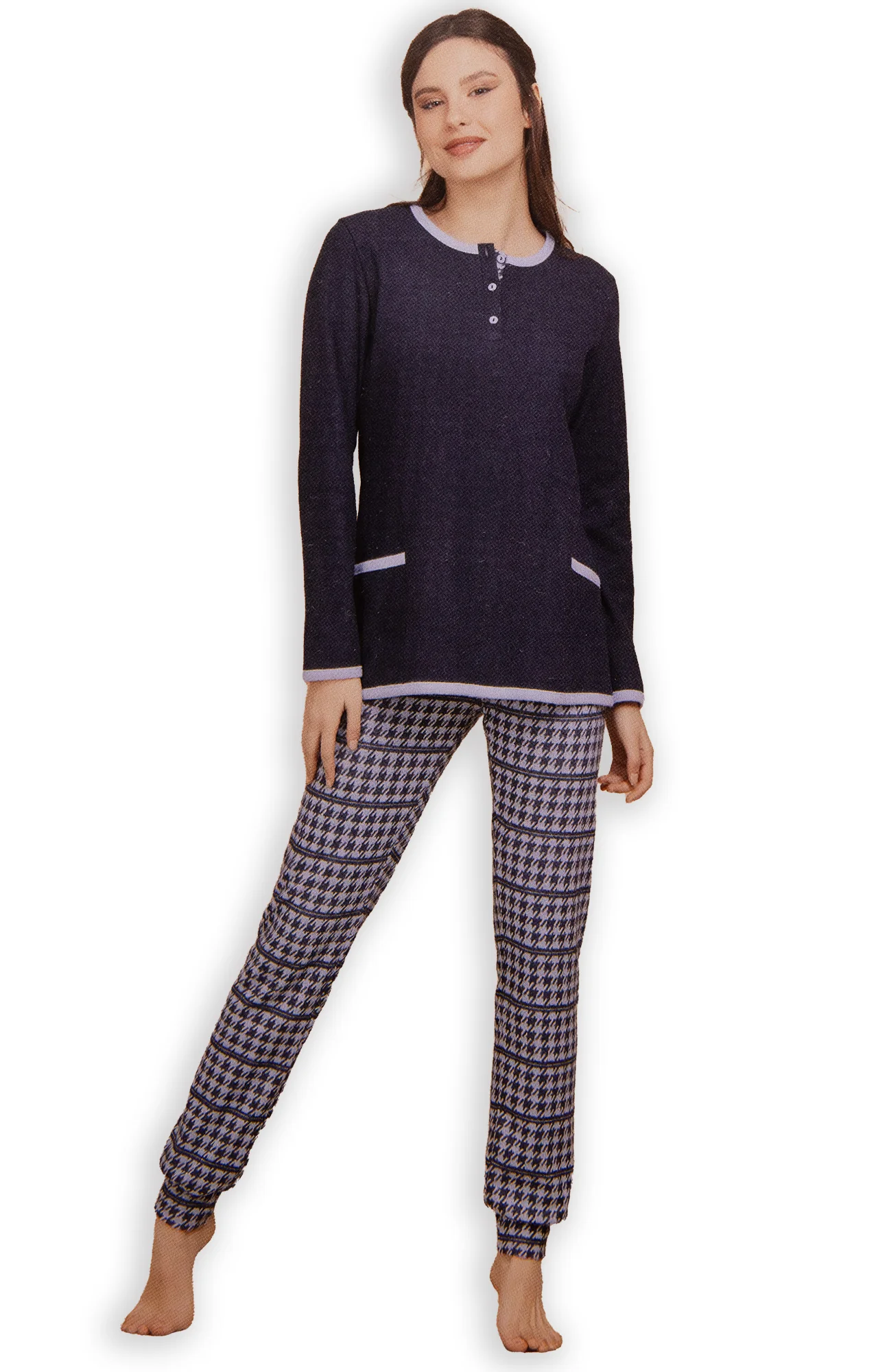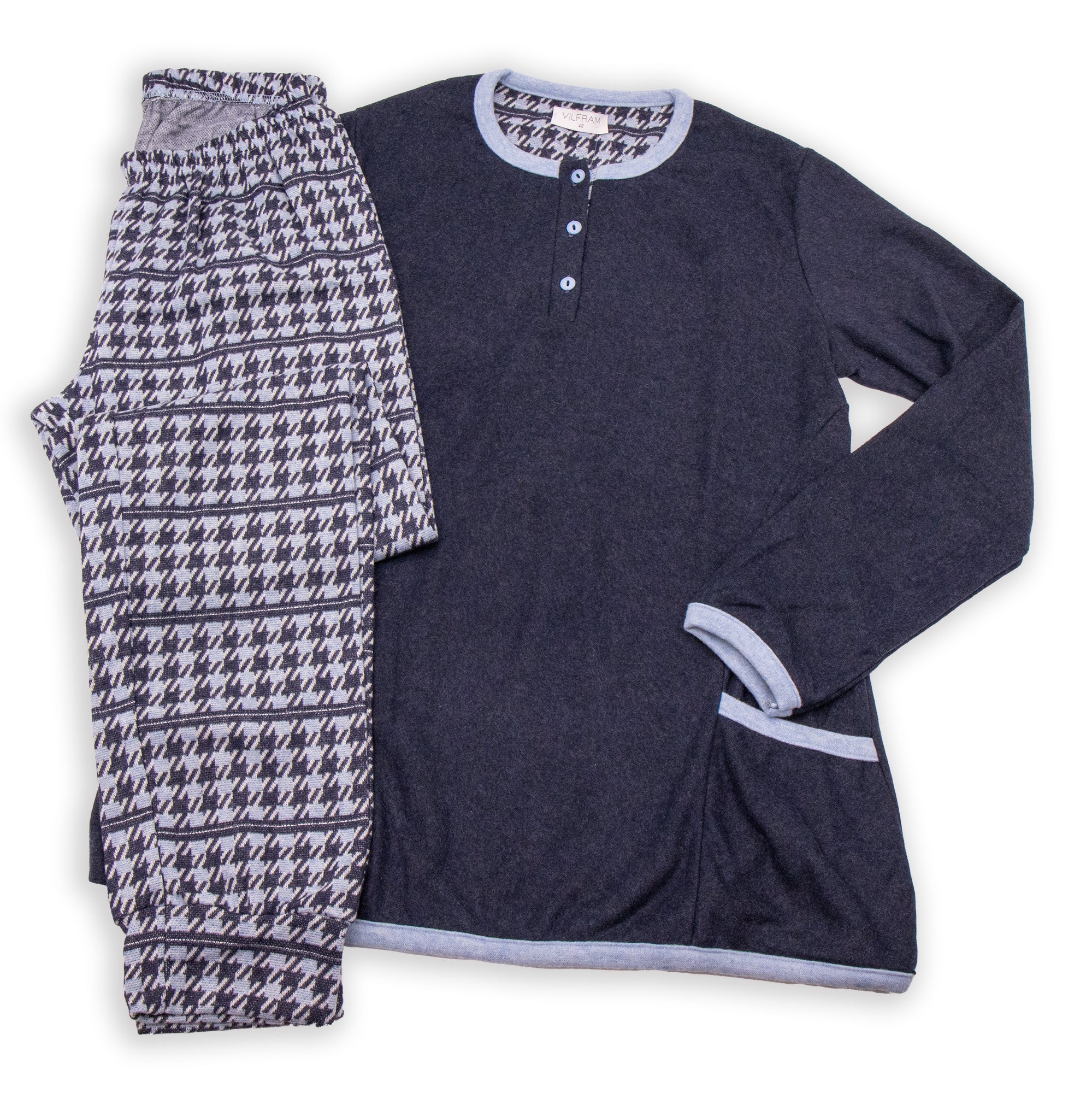 Morbido pigiama in punto milano VilframยฎMaglia con doppia tasca frontale e scollo 3 bottoniPantaloni pied de poule con polsino Taglie: 42-44-46-48Colori: Blu, Marengo