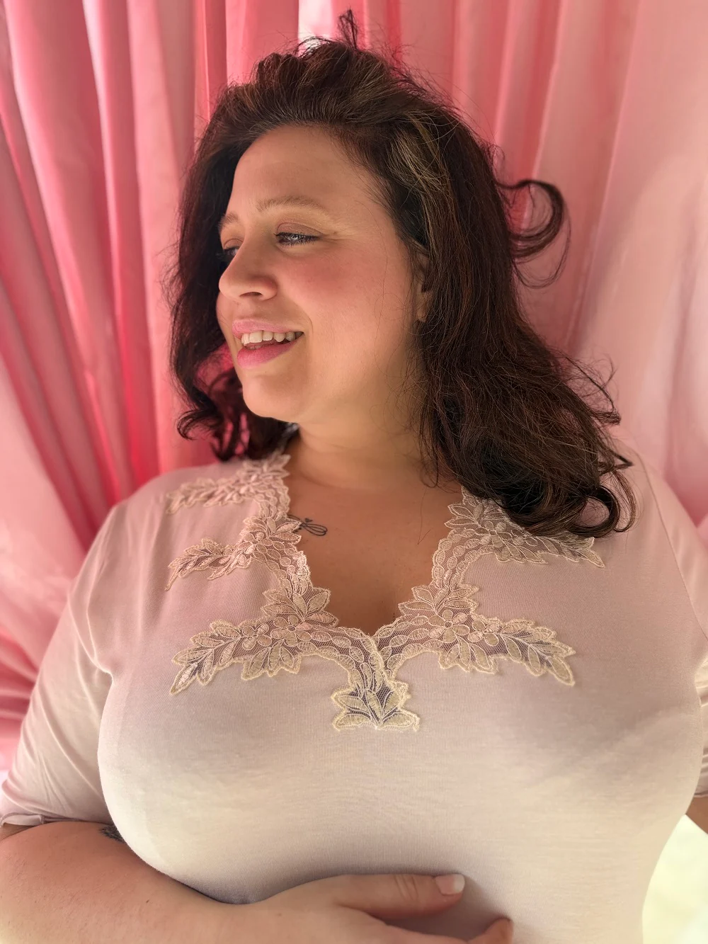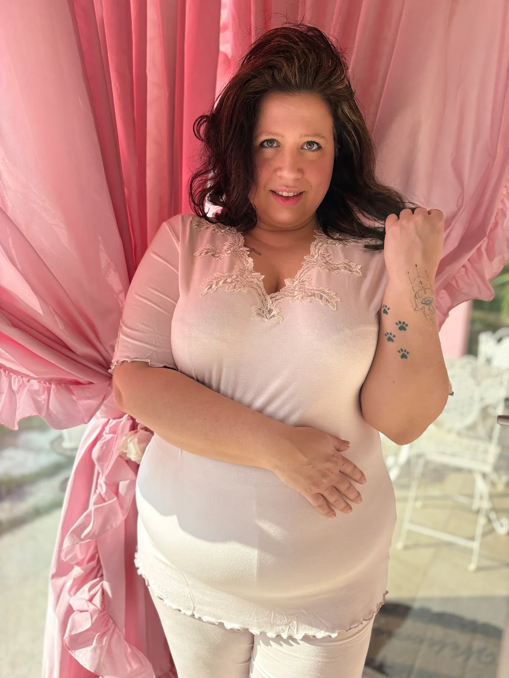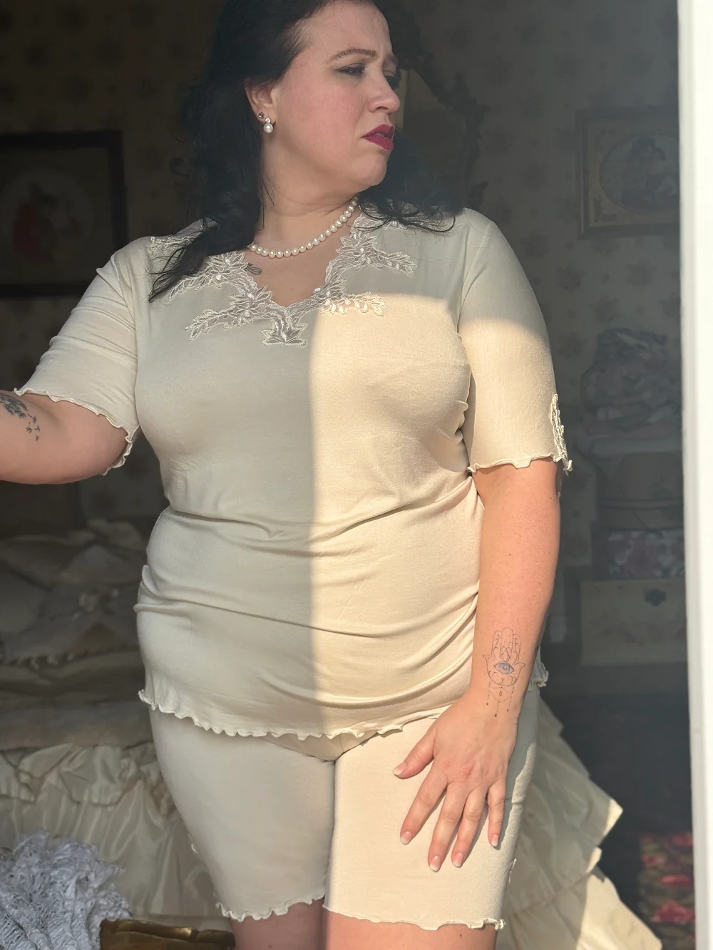 Pigiama nostra Esclusiva a manica e pantaloni corti in Viscosa.Un prezioso pizzo frastagliato รจ stato aggiunto allo scollo a ‘V’ per rendere Ivana elegante e dai dettagli ricercati.Collezione dedicata a chi ricerca uno stile romantico, elegante e raffinato.Maestri artigiani, tra i piรน esclusivi in Italia, sono stati scelti per realizzare le nostre collezioni Uniche ed Esclusive. Composizione: 95% Viscosa, 5% Elastan.La nostra modella indossa la taglia S.