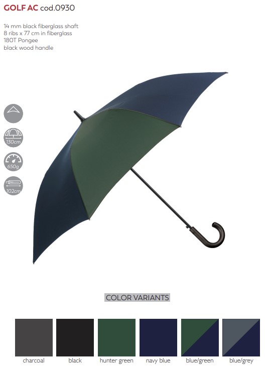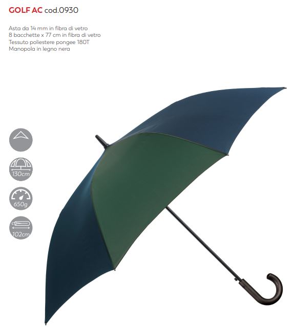 RA0930 Rainbow Golf AC Ombrello Grande Lungo 1 Sezione Apertura Automatic Cm 130 Gr 650 Chiuso Cm 102 Fiberglass