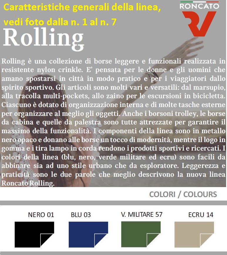 RO415233 RONCATO BORSA ZAINO LINEA ROLLING MODELLO MATERIALE TESSUTO / FABRIC: 400X200 NYLON CRINKLE FODERA / LINING: 210d POLYESTER Cm 33X33X14 – Caratteristiche generali della linea, Vedi foto dalla n. 1 alla n. 7: Tracolla in cotone ed anelli in metallo nero opaco Tiralampo in metallo e cordino da arrampicata. Fodera in contrasto colore con […]