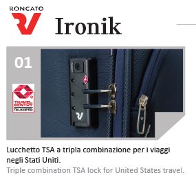 Roncato Ironik 2.0 Trolley Grande 4 Ruote RO415301 Roncato Linea Ironik 2.0 Trolley Grande 4 Ruote Chiusura a Combinazione con TSA Espandibile Materiale Poliestere Peso Kg. 3,6 Misure cm. 75 x 48 x 30/35 Capienza Litri 102/119 Puรฒ contenere da 20 a 24 Kg. di Biancheria