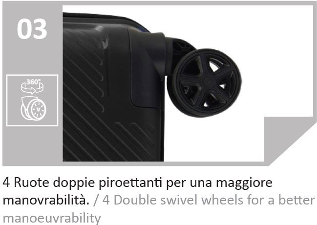 4 Ruote doppie piroettanti con sistema per la protezione dagli urti.