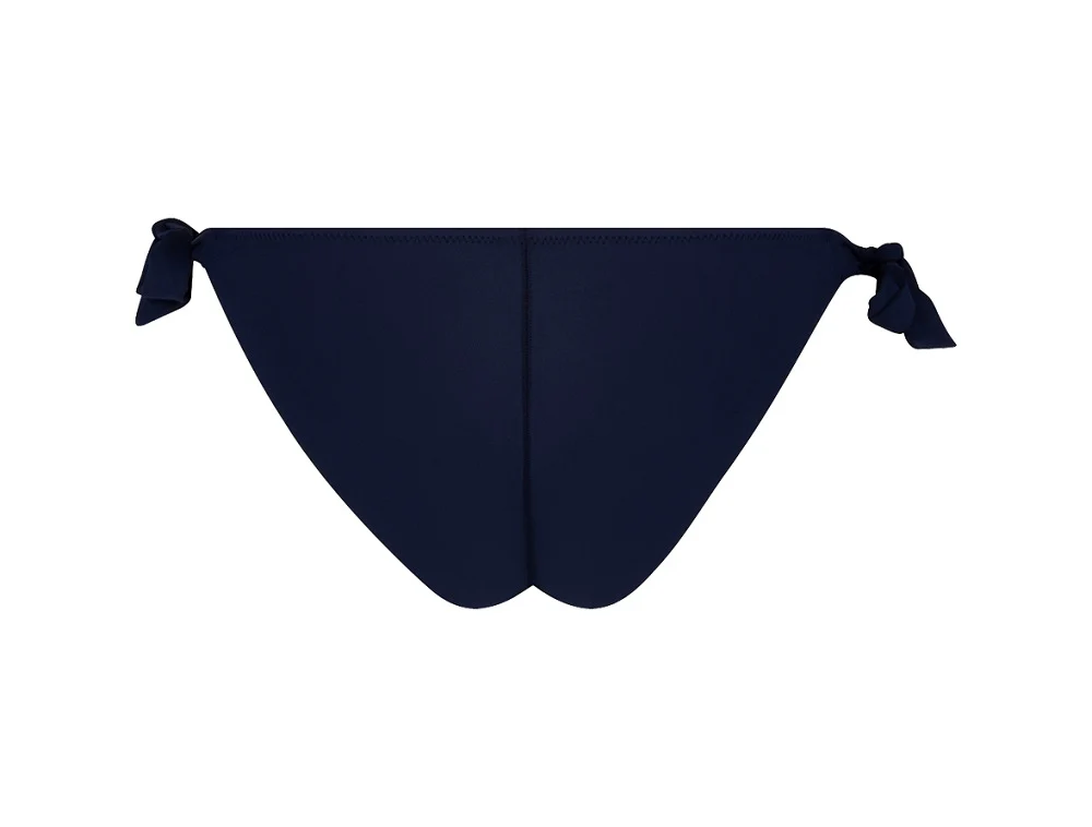 Brasiliana a vita bassa, stretta ai lati in maglia rasata. Cucitura al centro per donare un effetto slanciato e glutei scoperti per un effetto tanga. Slip brasiliana con laccetti regolabili da legare ai lati. 85% poliammide, 15% elastan