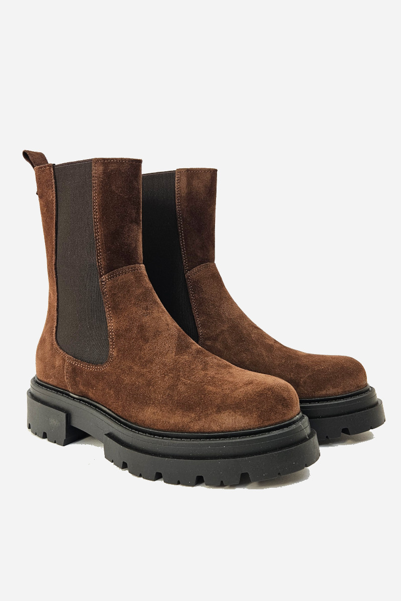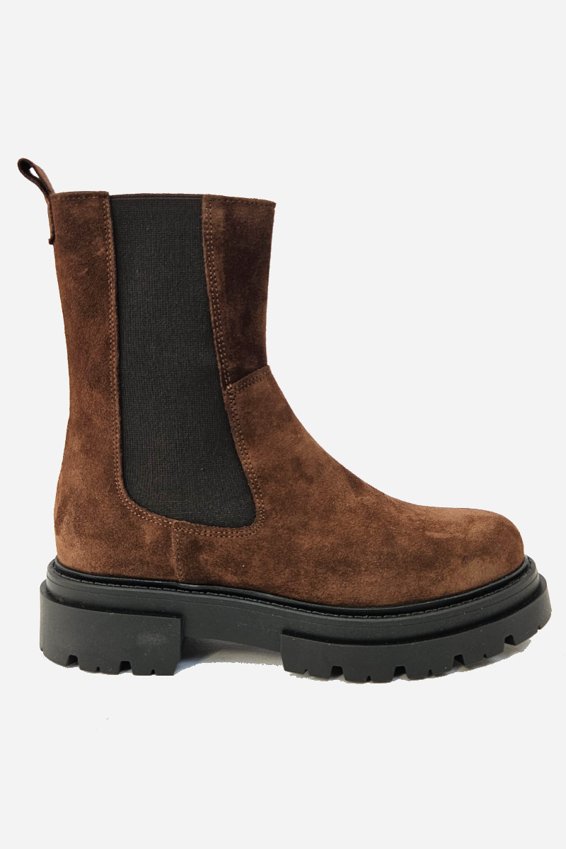 Stivaletto in camoscio marrone realizzato da Velaide con doppio elastico e suola in gomma nera carrarmata. Chelsea boot Made in Italy in camoscio color cioccolato perfetto per la tendenza di questa stagione.