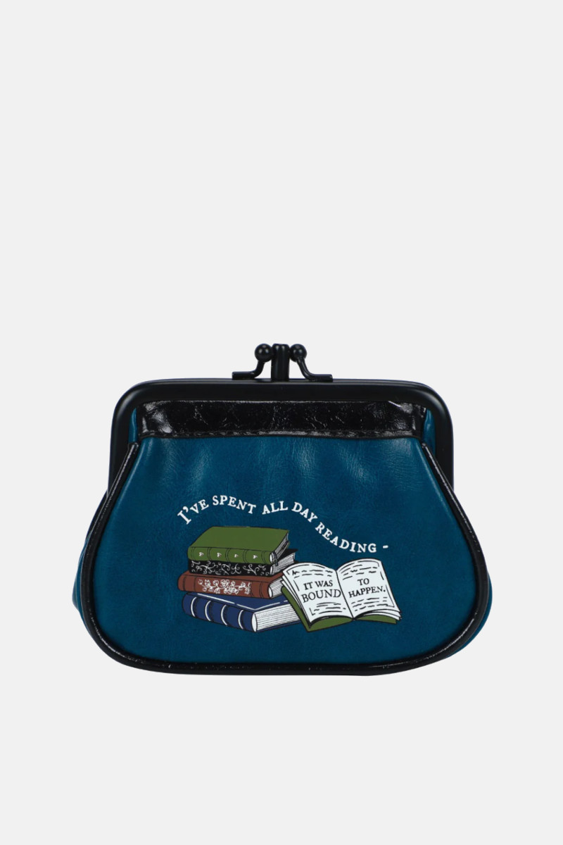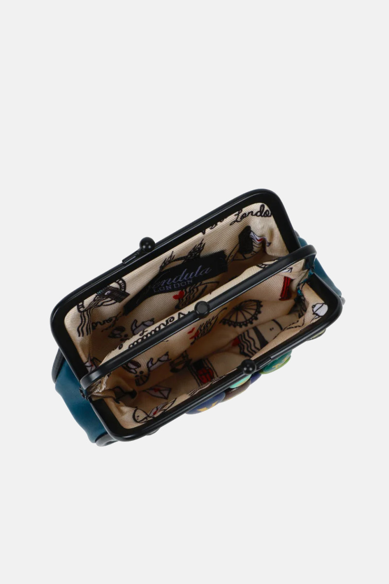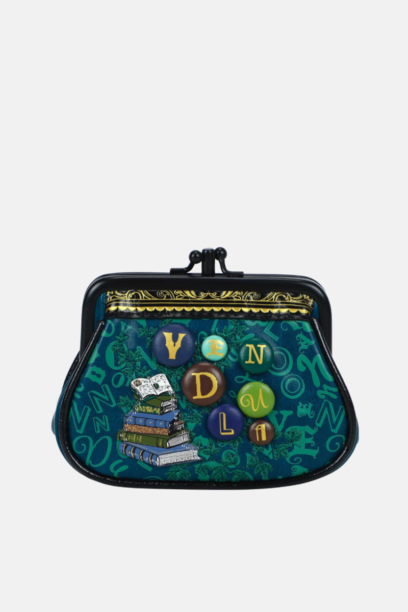 Portamonete piccolo con clip Vendula London linea Between the Covers Bookbinders. Un accessorio in pelle vegana sui toni del blu. La cura dei dettagli e la simpatia della stampa ti conquisterà ! Perfetto come idea regalo.