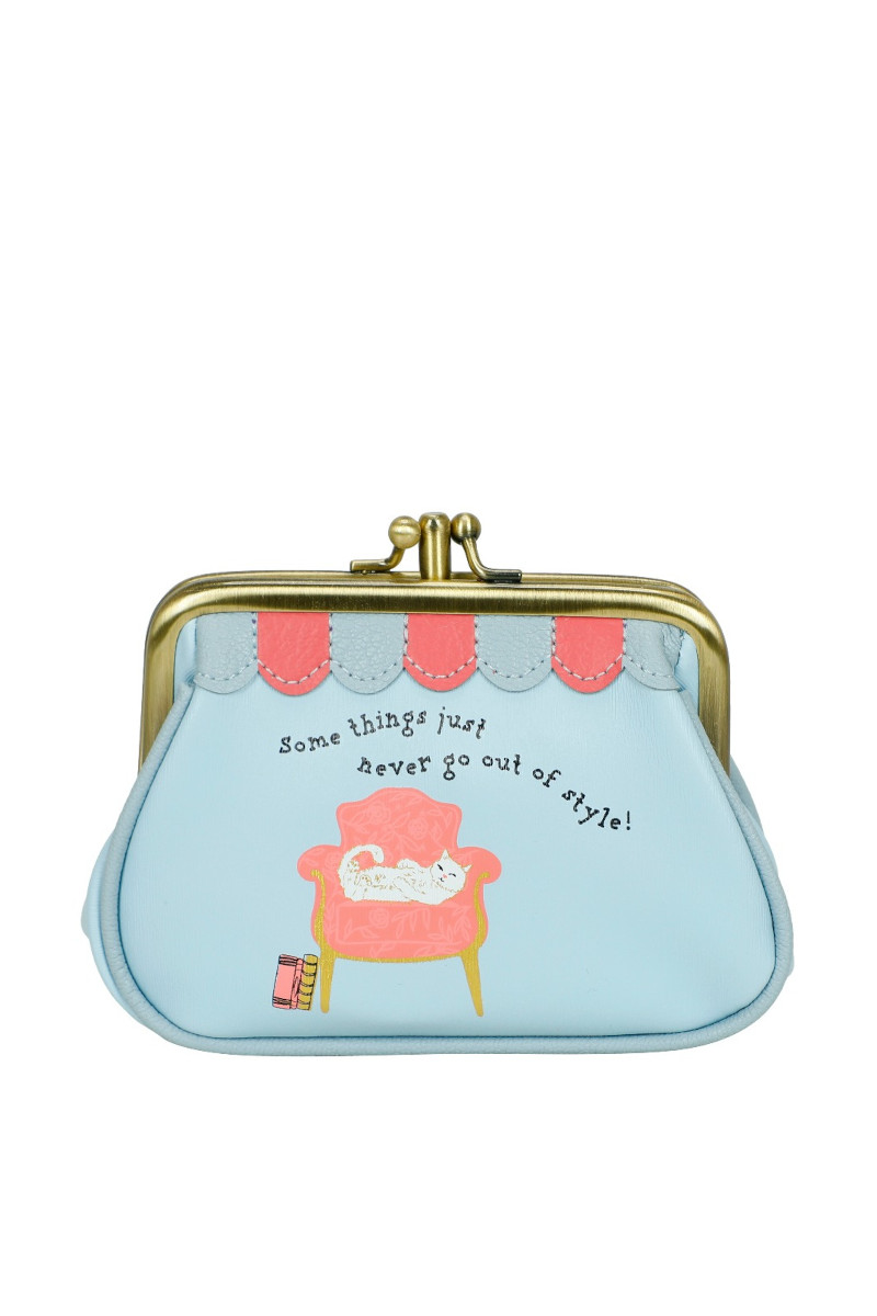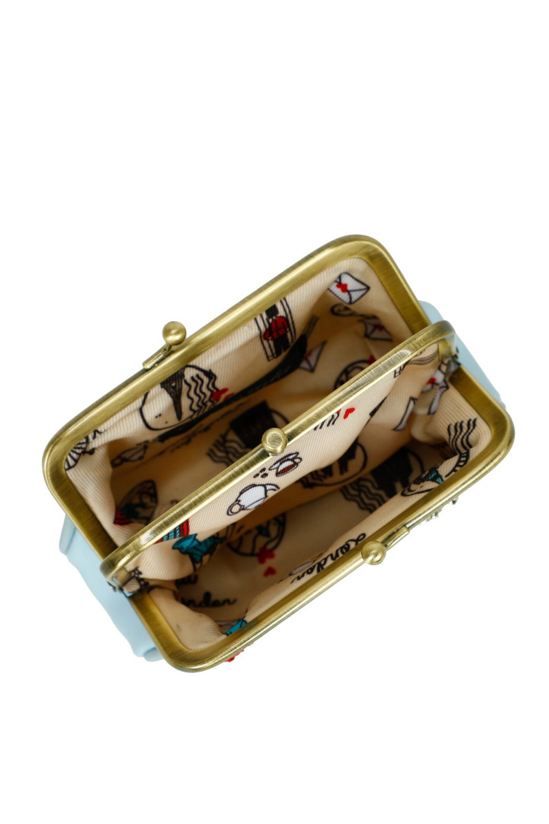 Questo accessorio chic, confezionato con pelle vegana, dispone di due scomparti per contenere i tuoi contanti, le carte e le ricevute sicure e organizzate, protette da una robusta chiusura a fermaglio. La decorazione, nei toni del blu, è costellata di dettagli stampati e in rilievo, con immagini di gatti, un vecchio telefono e una ghirlanda di rose rosse. Misure: 12x9x3 cm