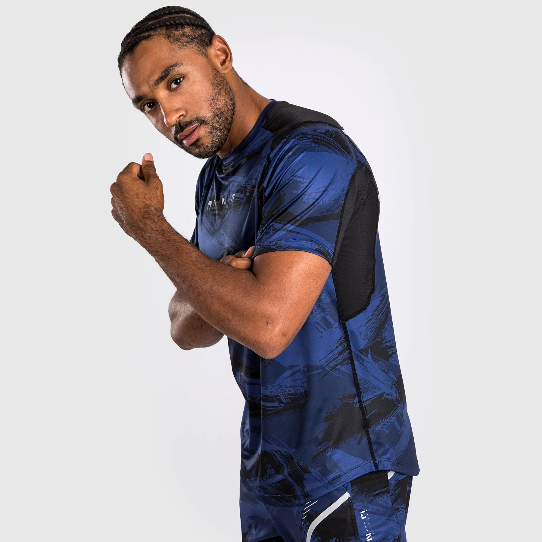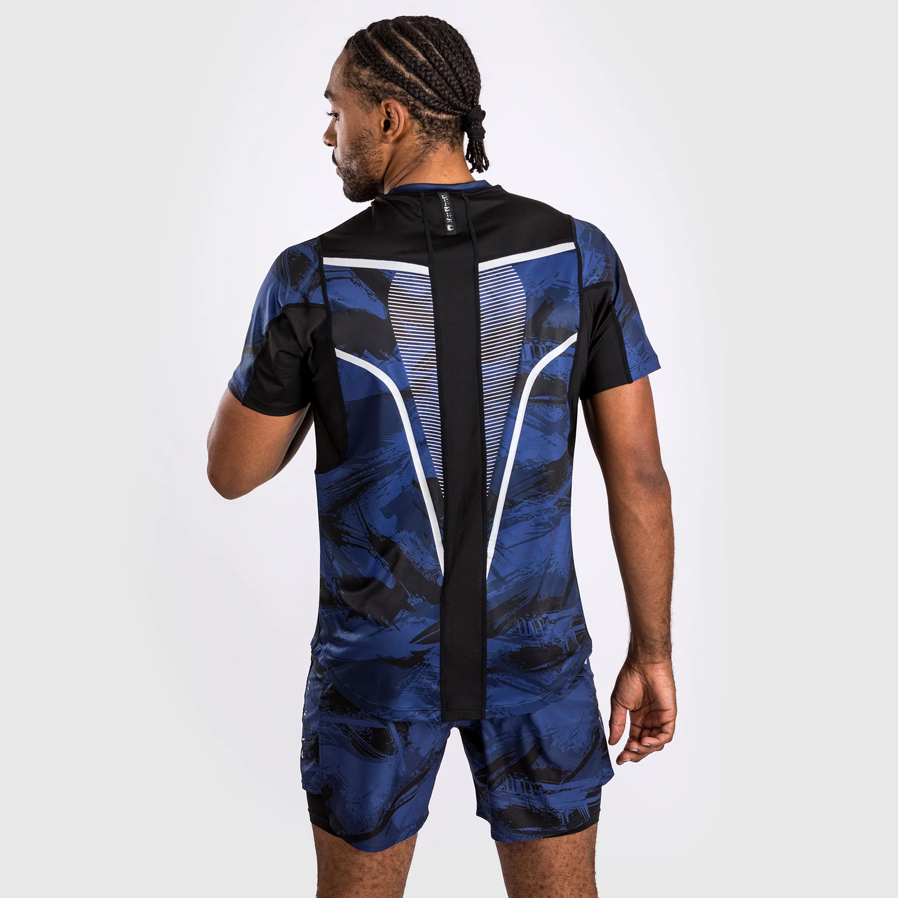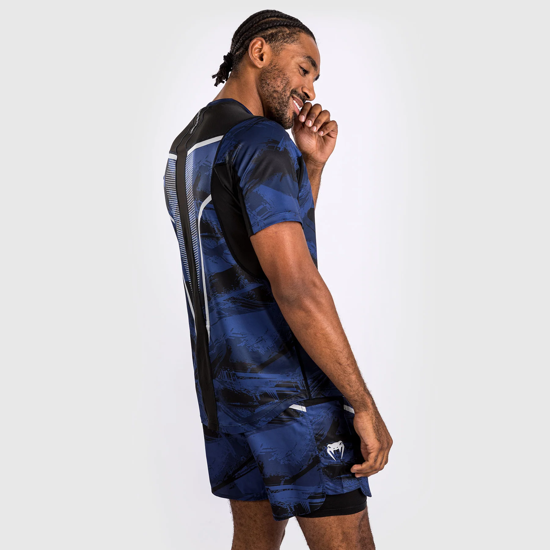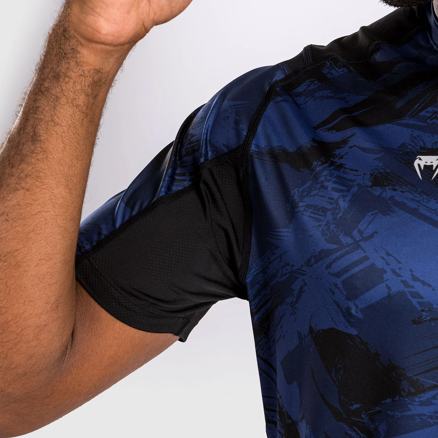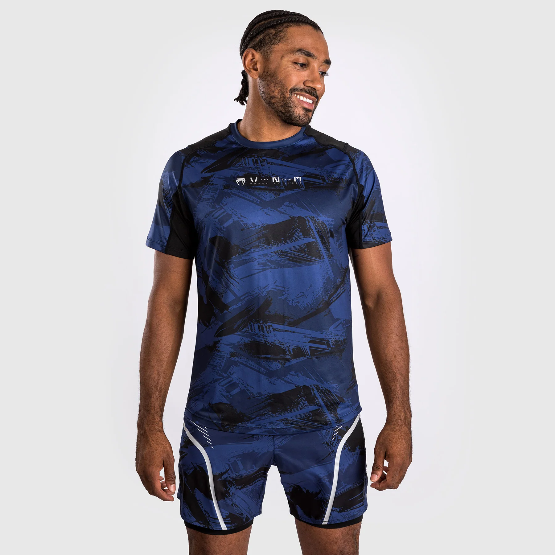 La stampa mimetica a pennello in blu offre uno stile urbano. Il logo Venum argentato con la frase latina “Nosce te ipsum” (“Conosci te stesso” – Socrate) si trova sul petto.